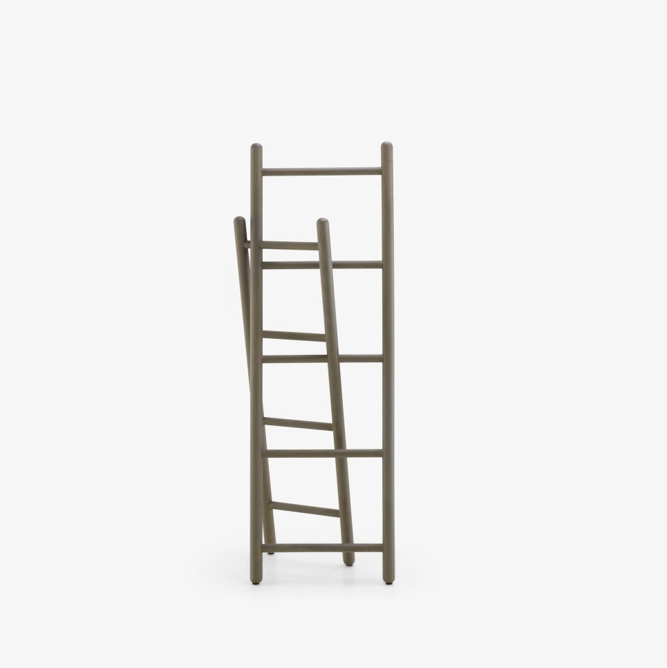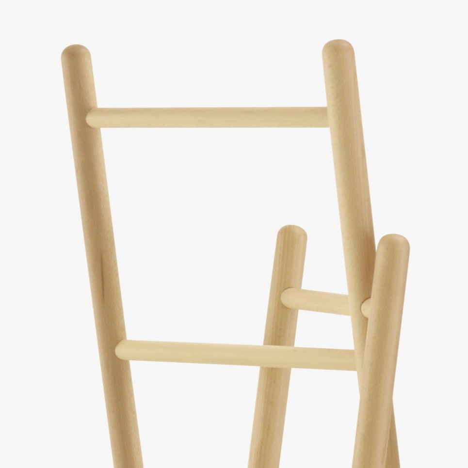 傾斜のついた2本のフレームが交差しながら立ち上がる、彫刻のような佇まいのコートスタンド。