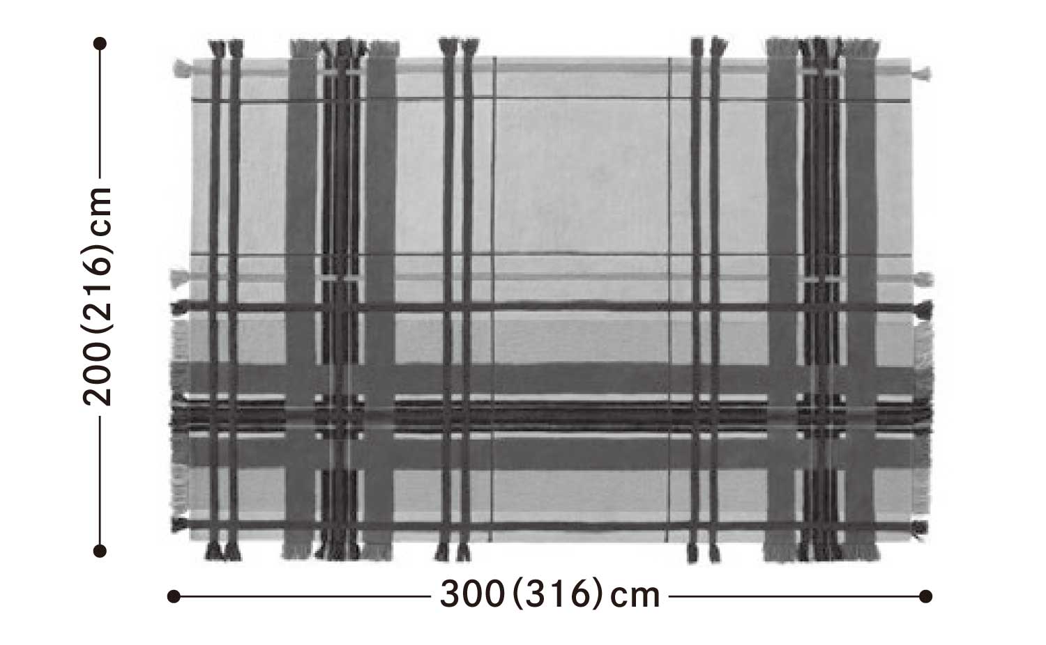 | サイズ | W300(316) × L200(216)cm ※周囲にそれぞれ約8cmのフリンジ付き ※±3%ほどのサイズ誤差が発生します |