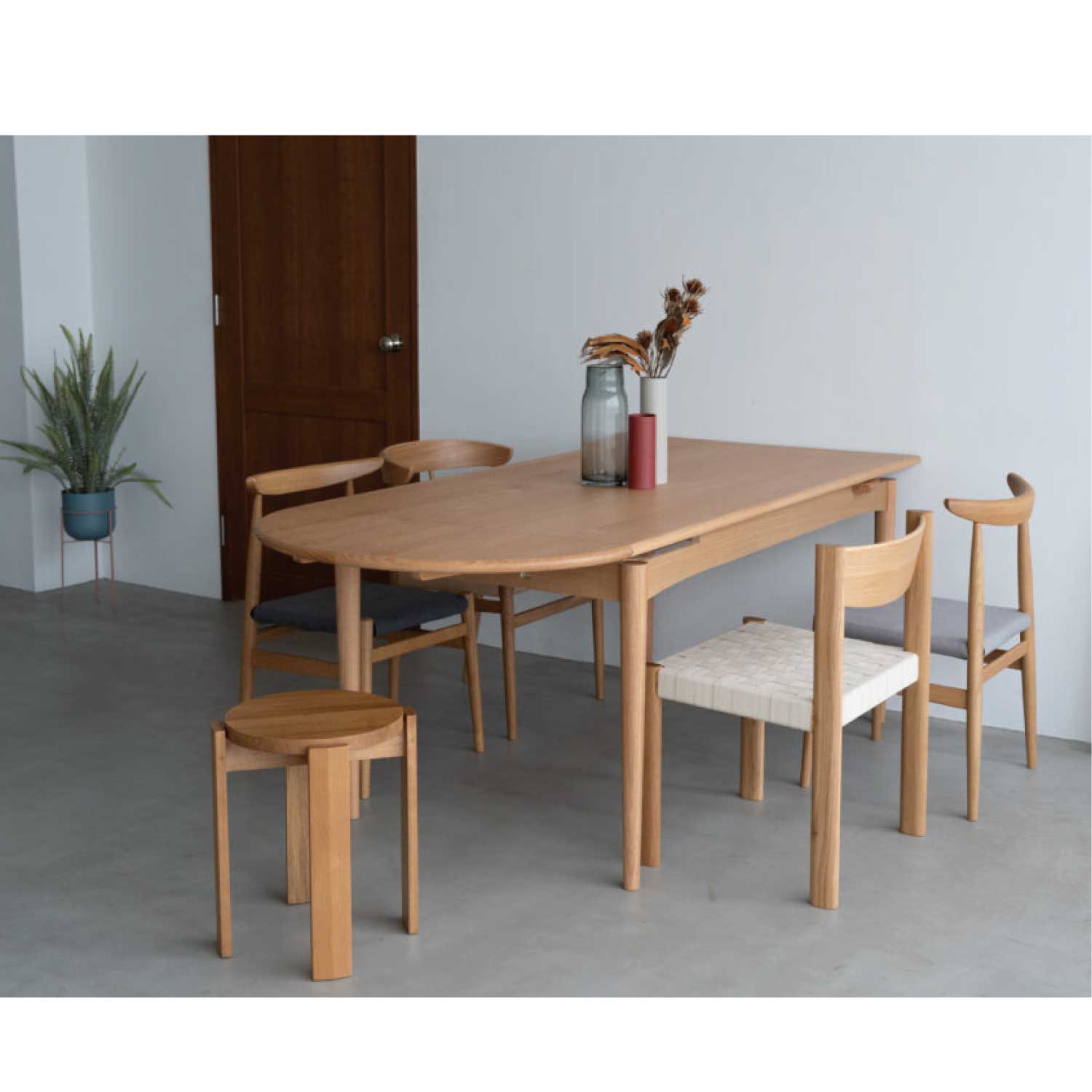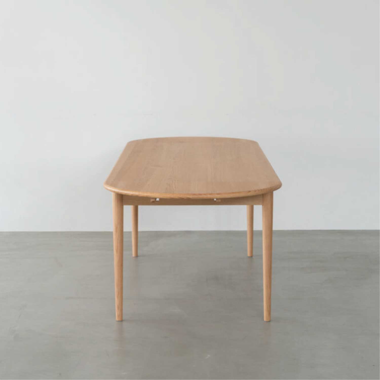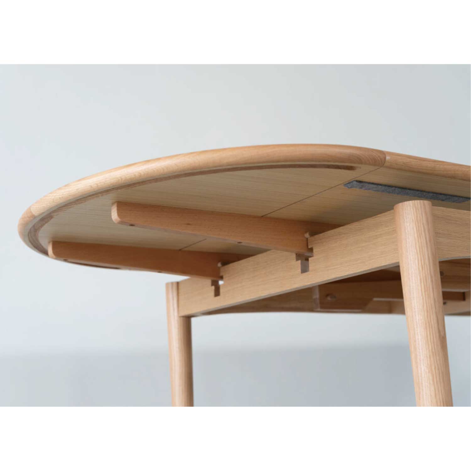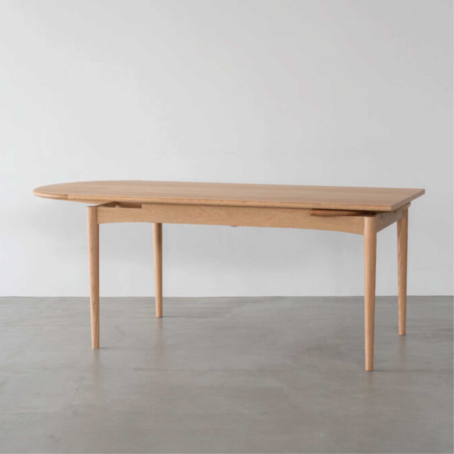 優しいフォルムが特徴の楕円形の伸長式テーブル。伸長天板を引き出して持ち上げるだけで、簡単にサイズを広げることができます。気軽に伸長できる仕様のため、来客時はもちろん、普段の食卓やちょっとした作業台としても活躍します。片側だけを伸長し、半円形スタイルとしてもお使いいただけます。