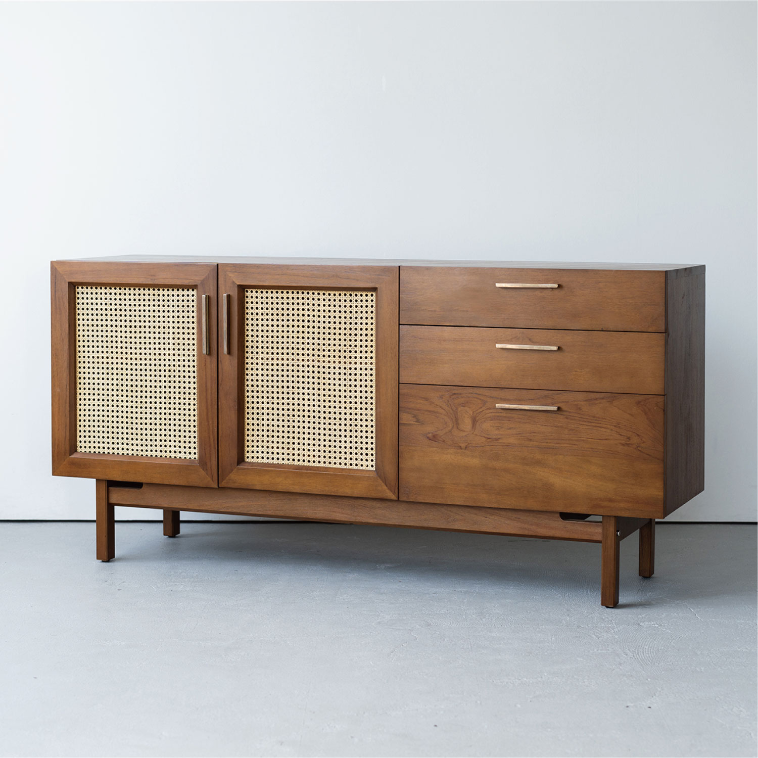 ヴィンテージ家具の雰囲気を再現したサイドボード。真鍮のハンドルは、使い込むほどに風合いが増していきます。風格のある佇まいにラタンの扉が程よい抜け感を生み出します。