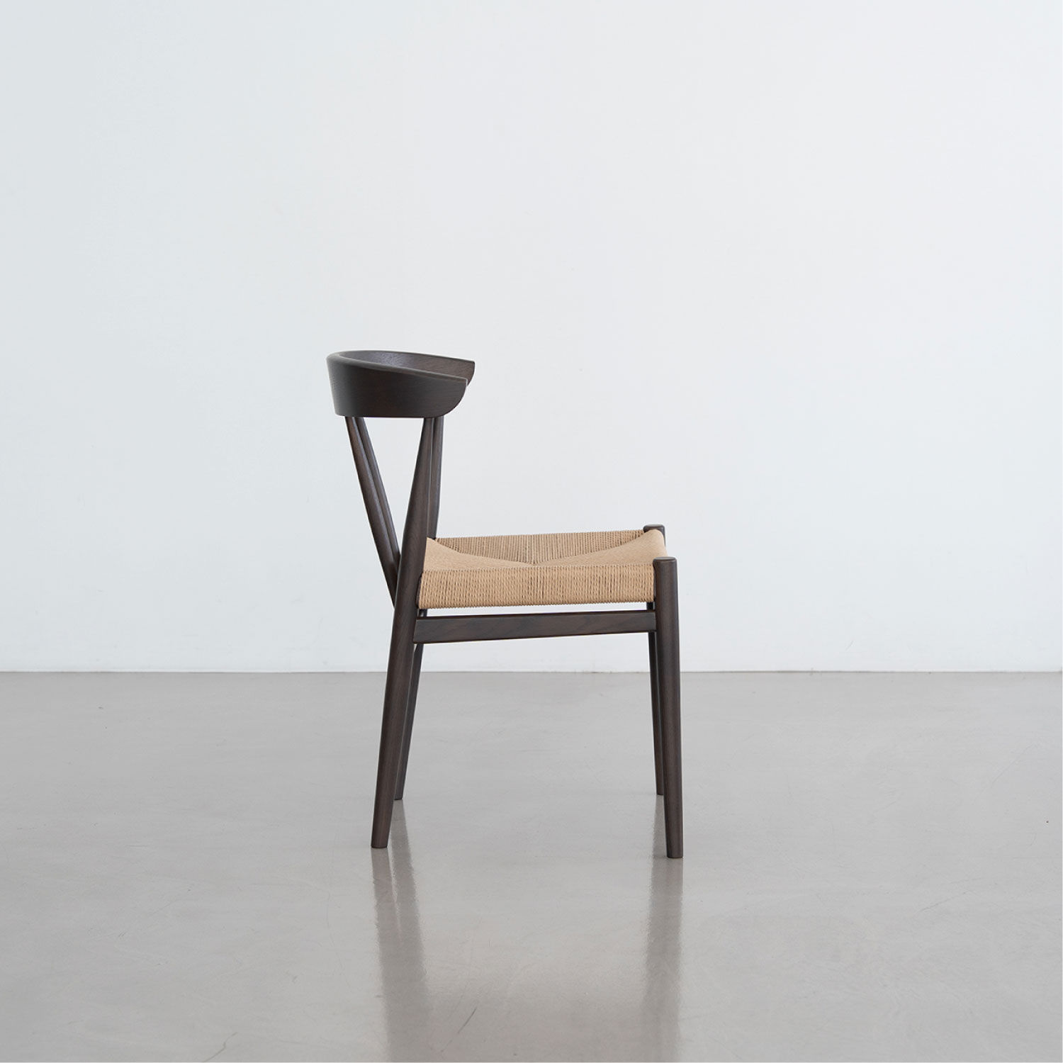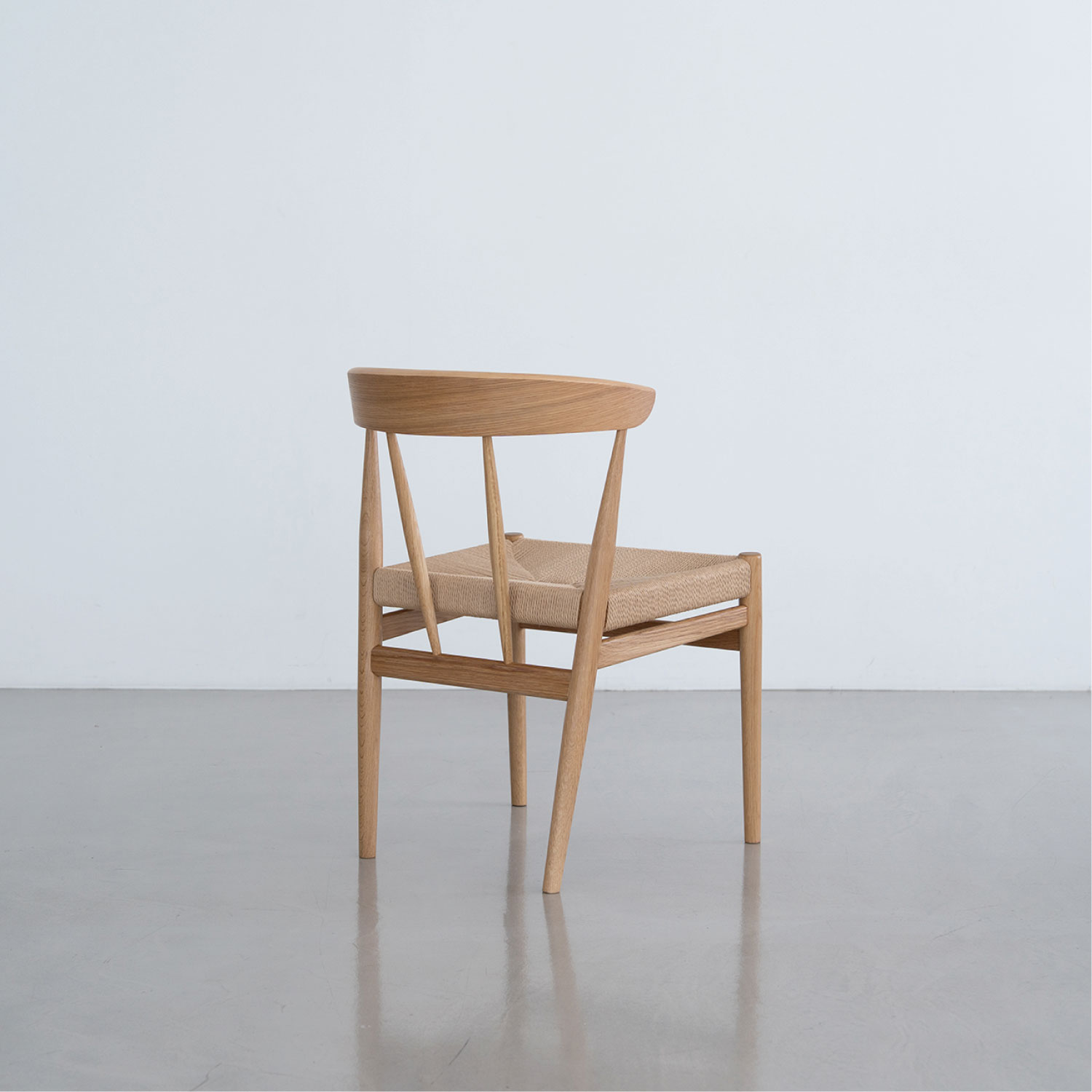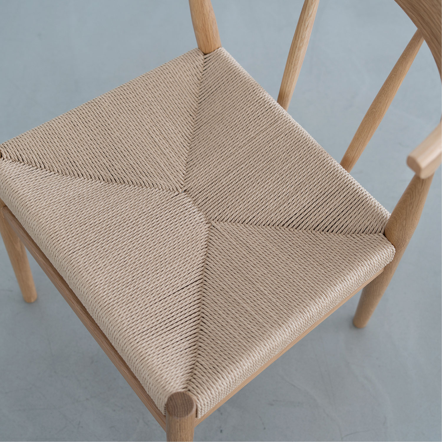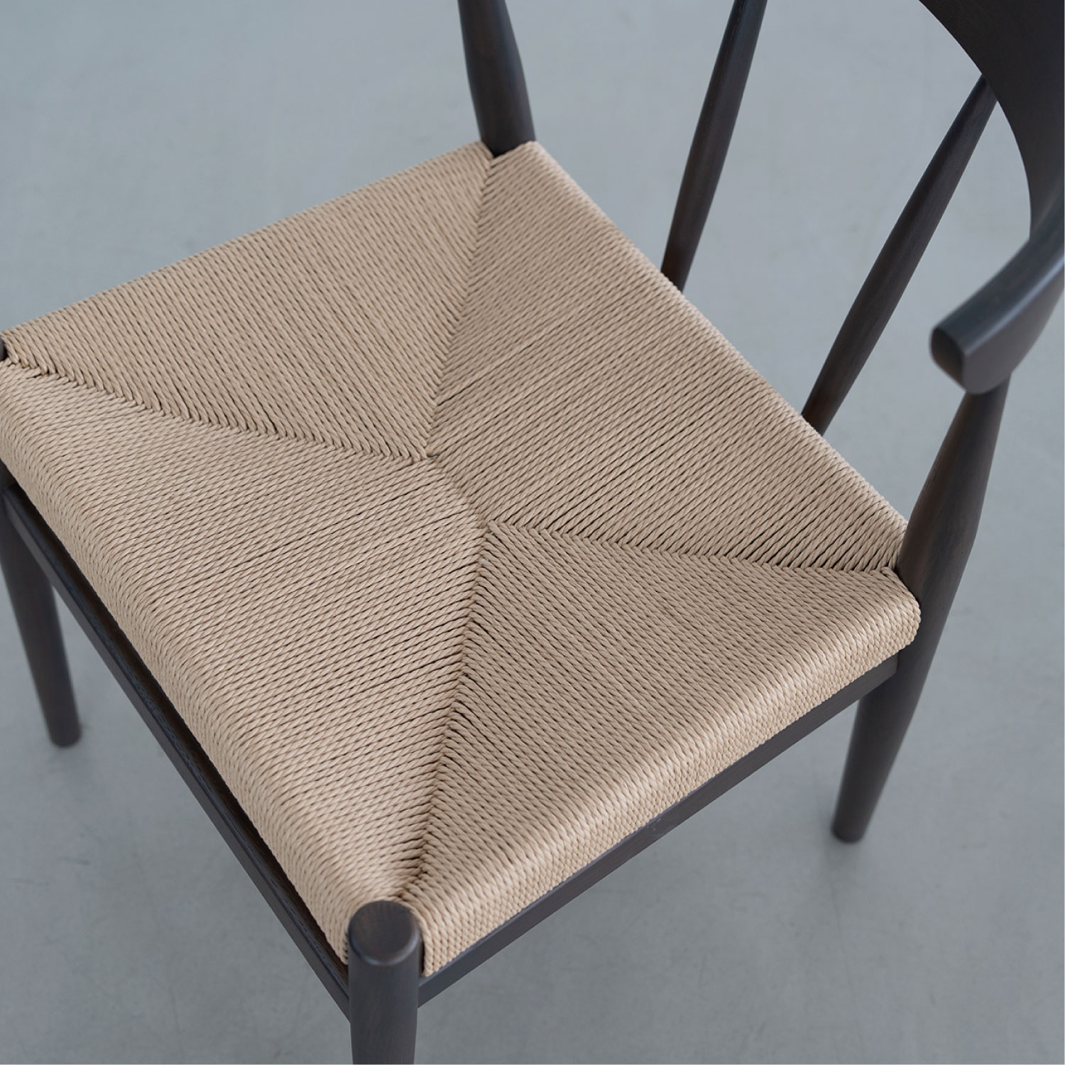 座面にペーパーコードを張り込んだハーフアームチェア。成型合板の笠木が背にフィットし、ちょっとした肘掛けにもなります。トラディショナルな北欧のデザインを踏襲し、後ろからの見た目も美しいデザインです。