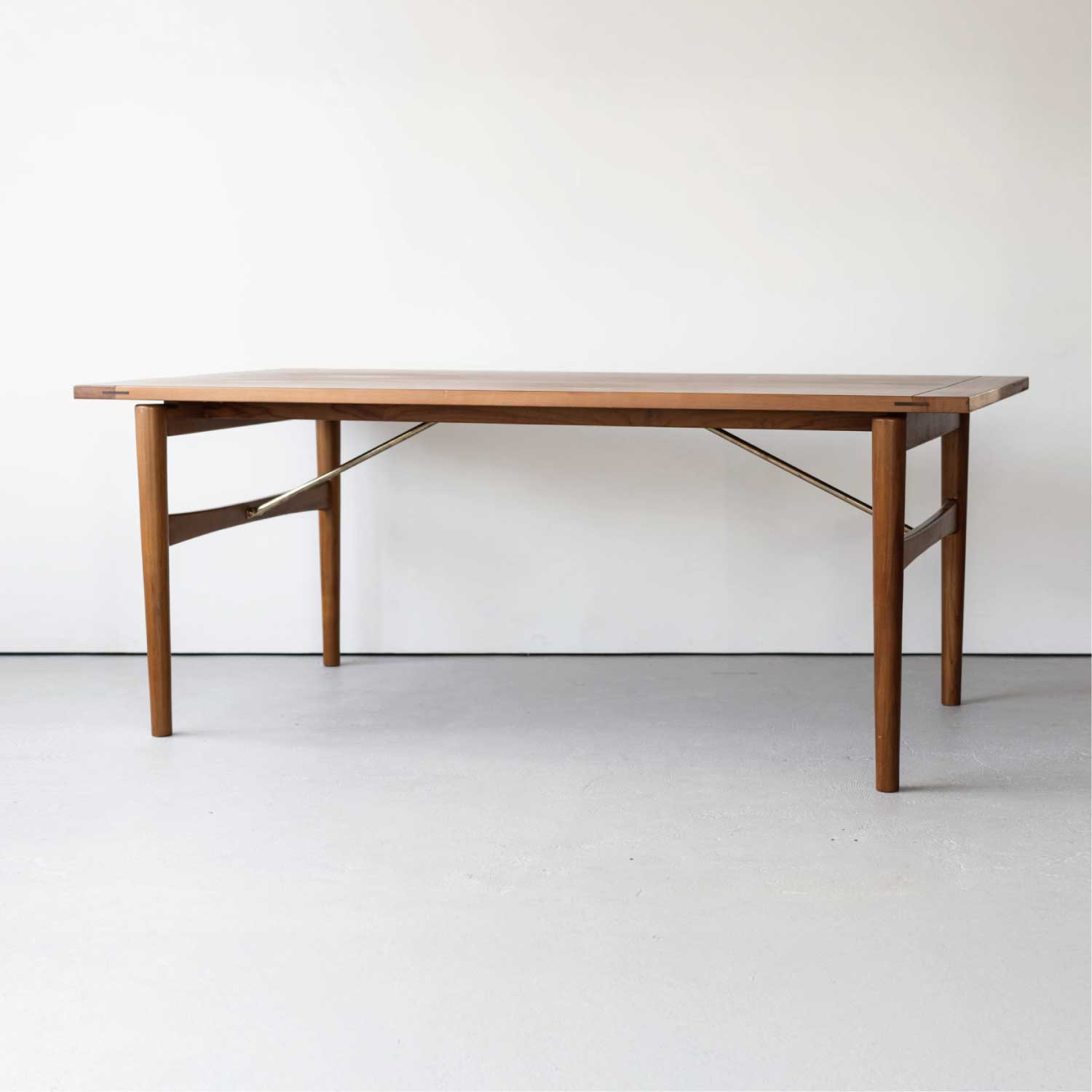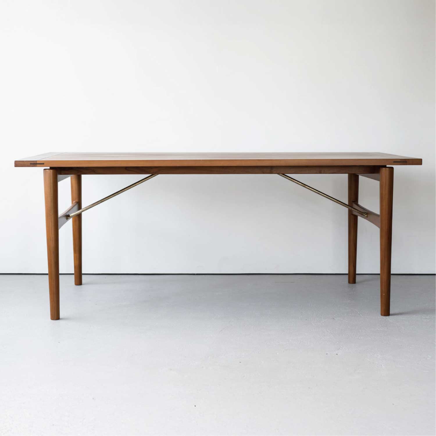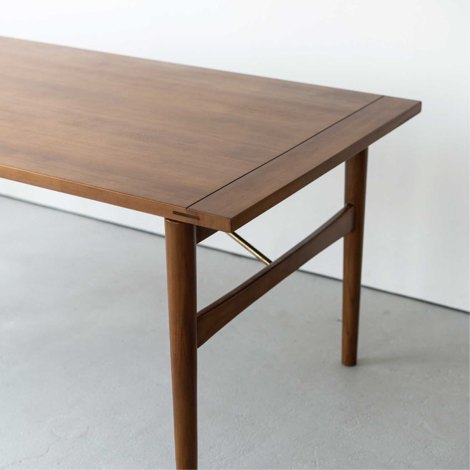 チークの無垢材が堪能できるテーブルです。長方形に丸脚のスタンダードなフォルムに、真鍮のサポートバーを取り入れ、ヴィンテージを感じられるアクセントづけをしています。天板の両端は反りにくくするための工法[端喰(はしばみ)]で仕上げています。