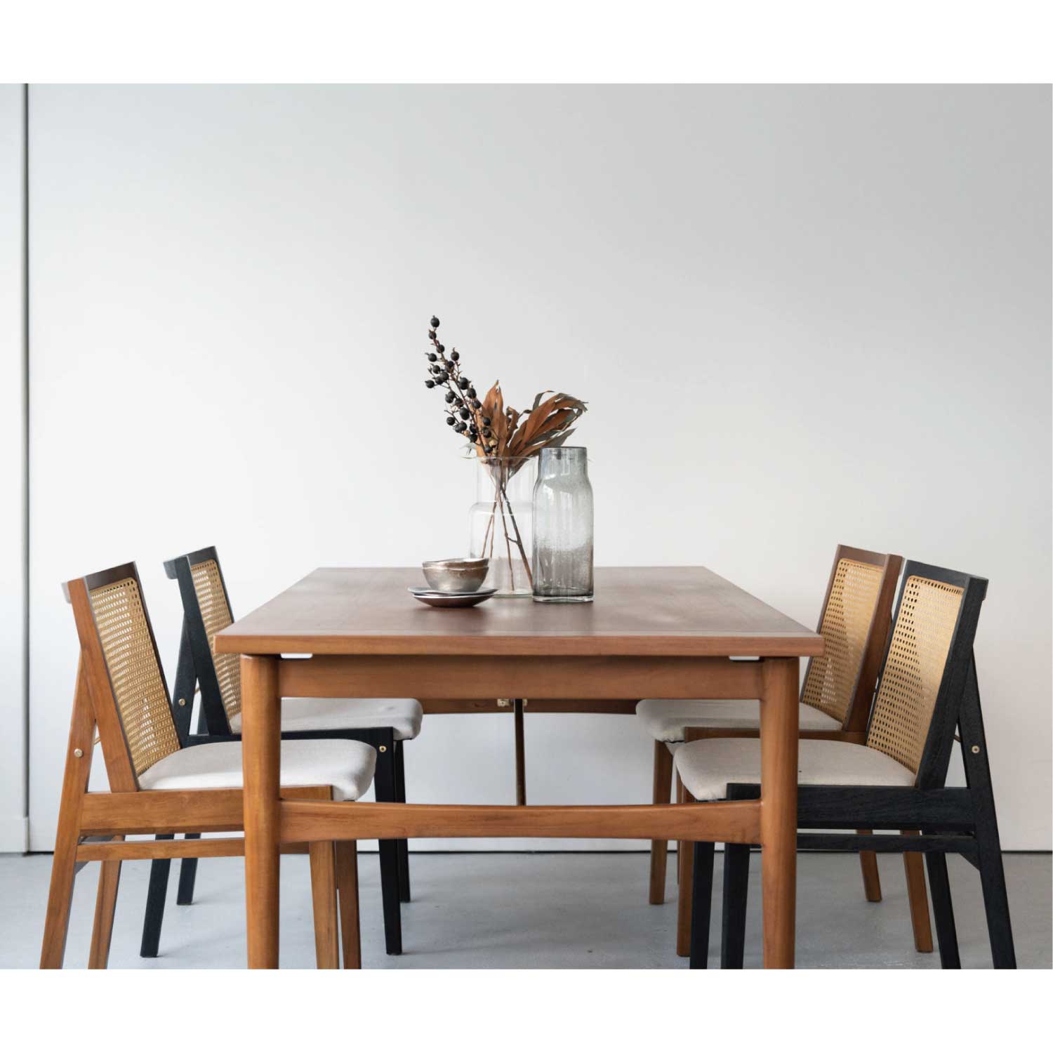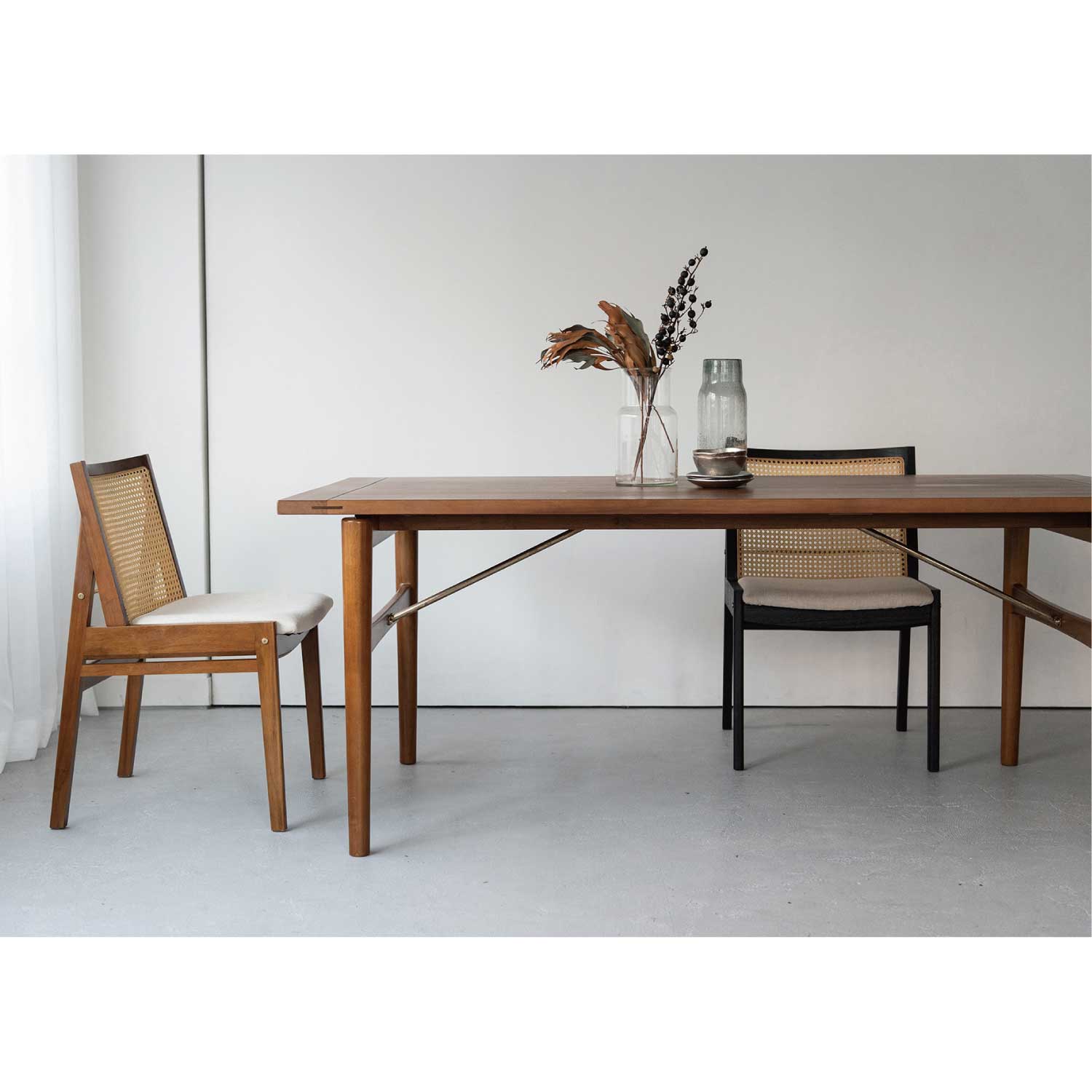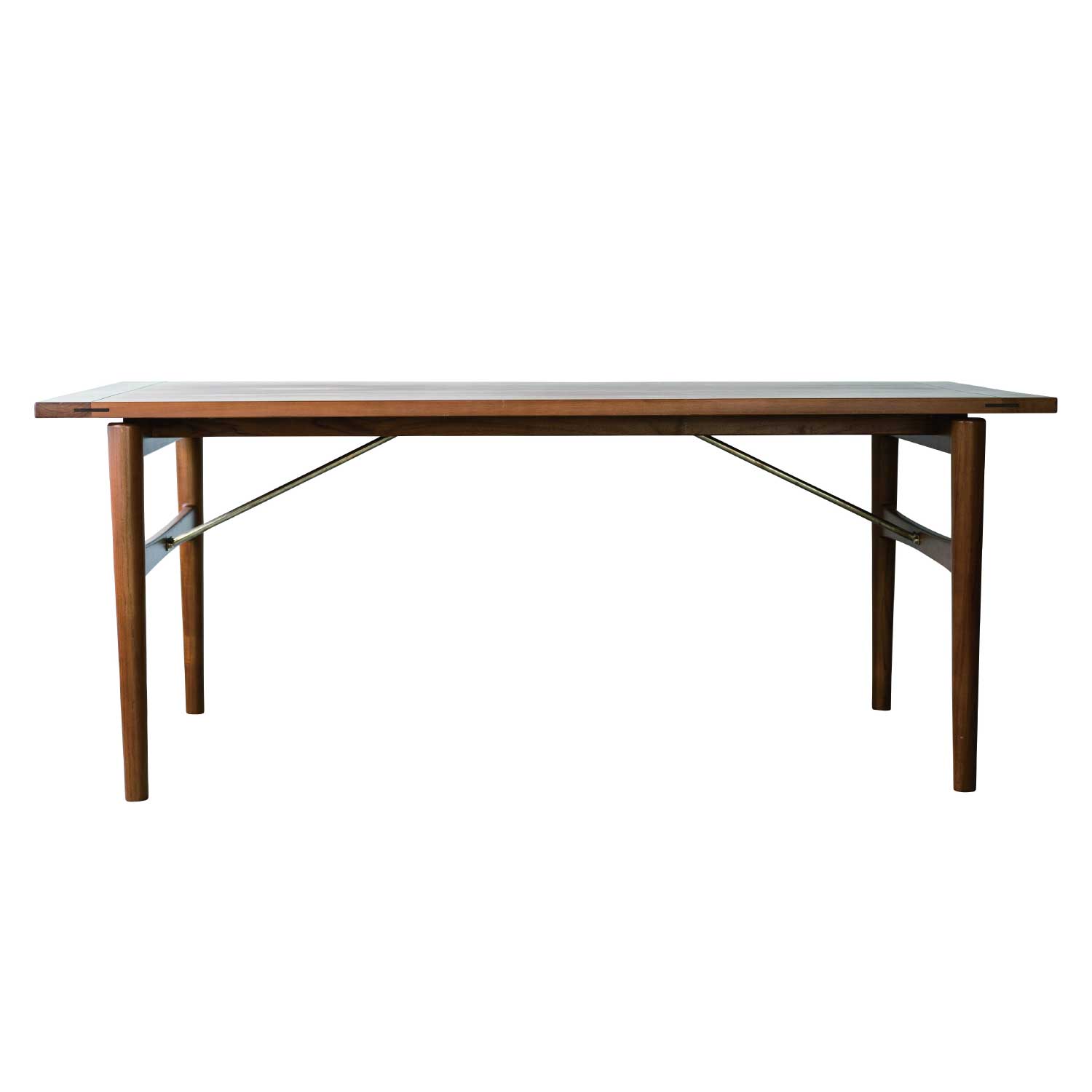 チークの無垢材が堪能できるテーブルです。長方形に丸脚のスタンダードなフォルムに、真鍮のサポートバーを取り入れ、ヴィンテージを感じられるアクセントづけをしています。天板の両端は反りにくくするための工法[端喰(はしばみ)]で仕上げています。