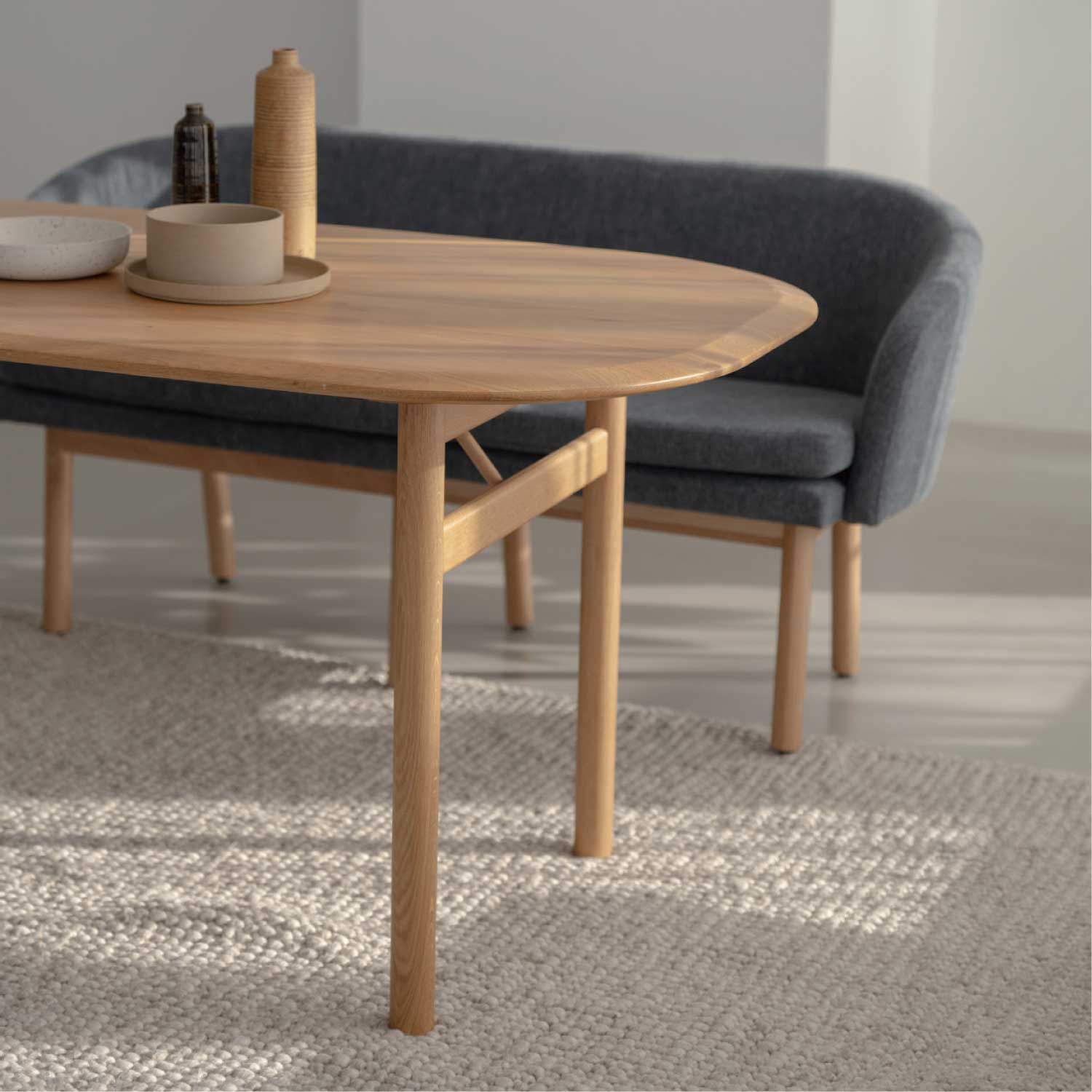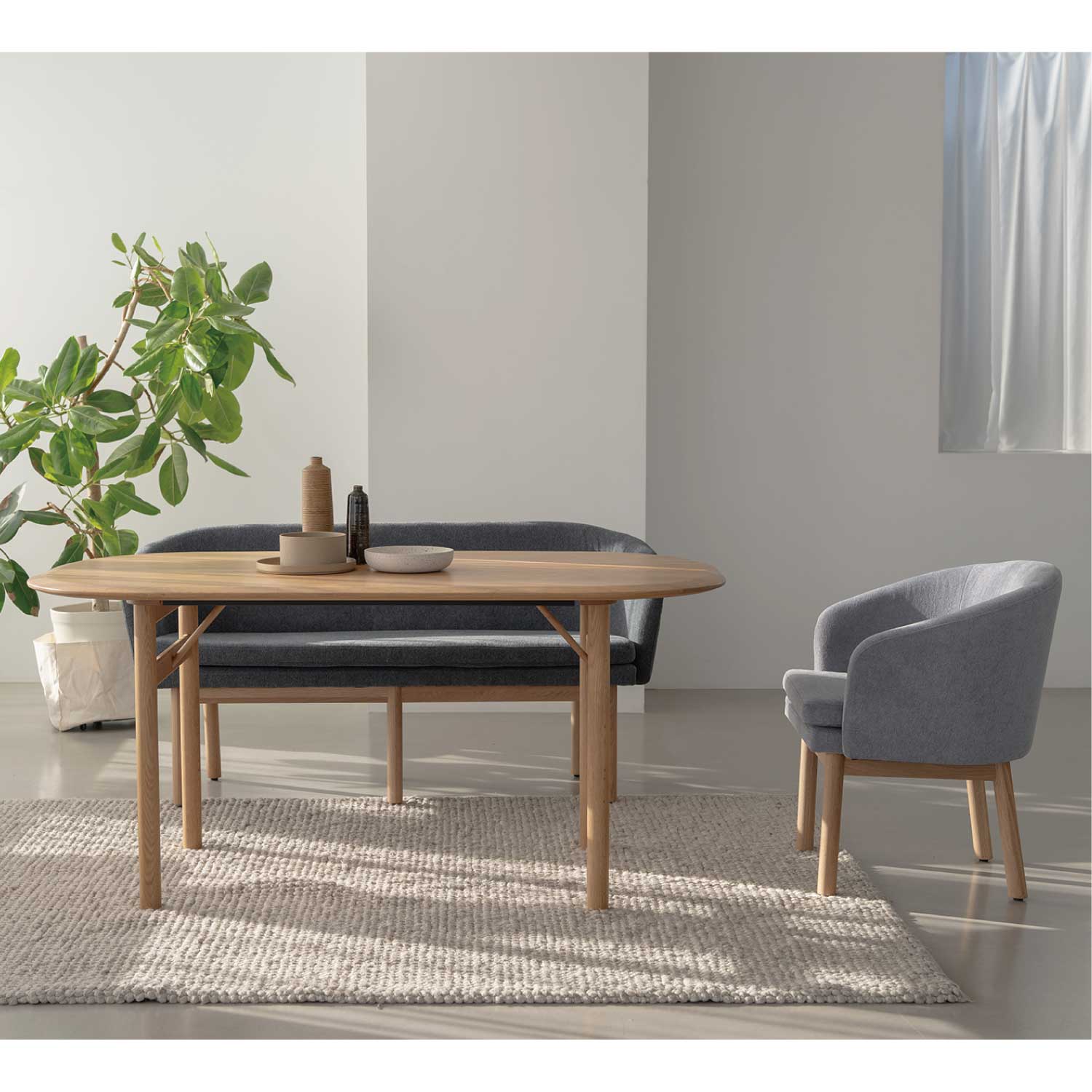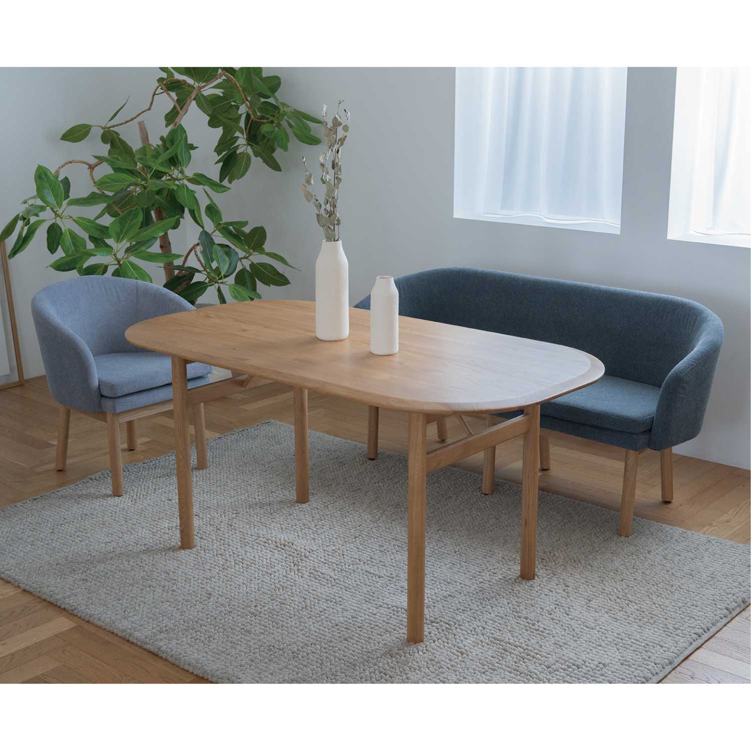 丸みのある優しいデザインの無垢テーブル。滑らかに加工された天板が、天然木の素材感を際立たせます。同じシリーズのチェアと合わせてゆったりとくつろげるダイニングを演出できます。その他のダイニングチェアを合わせてもお使いいただけます。