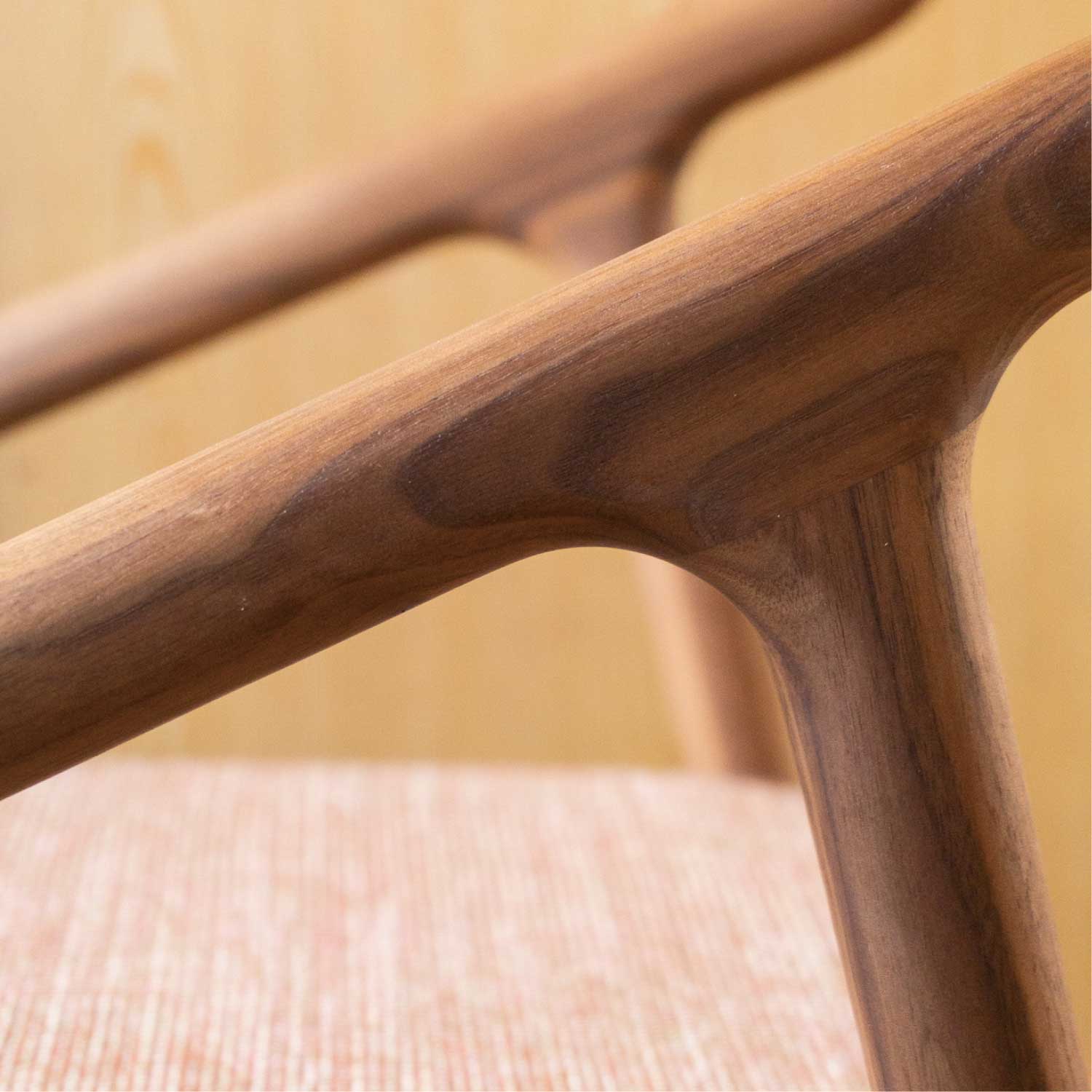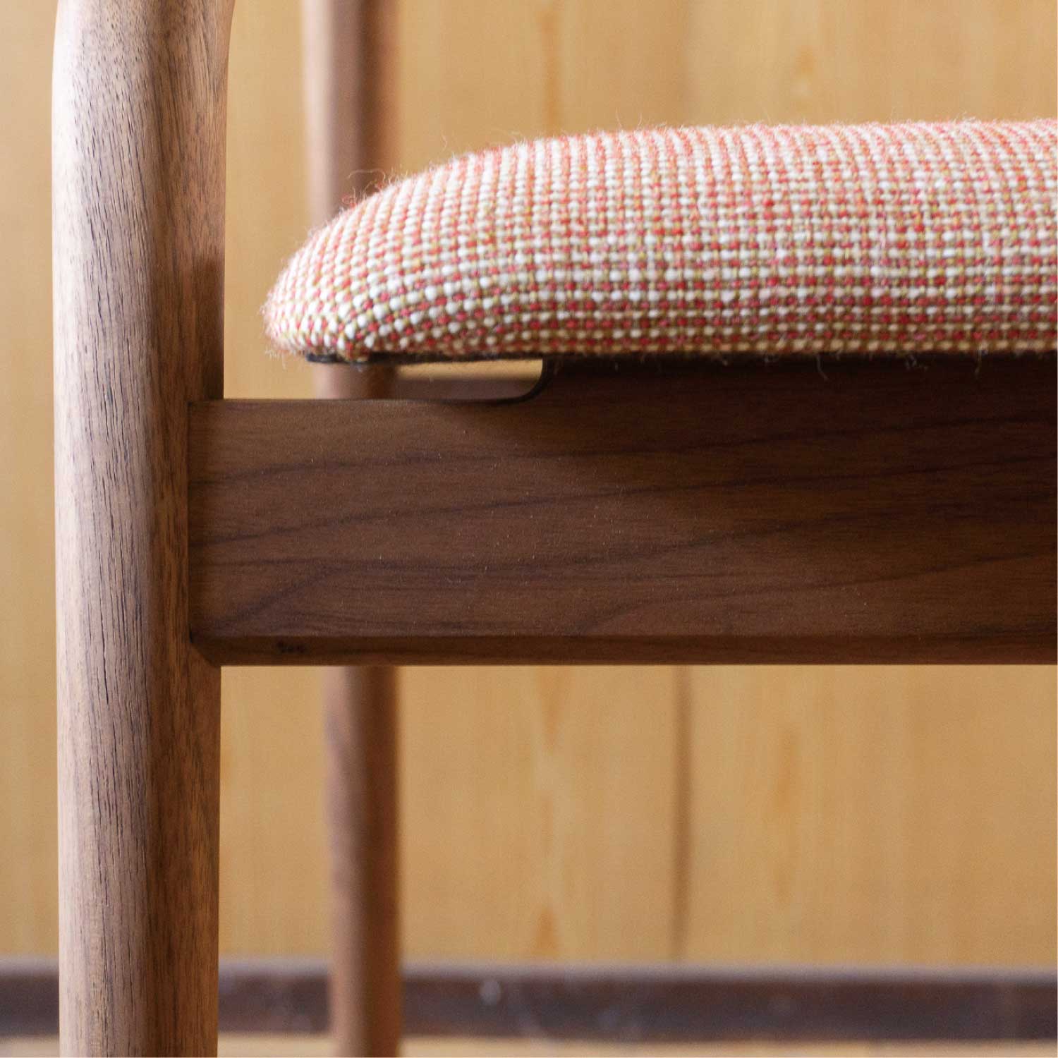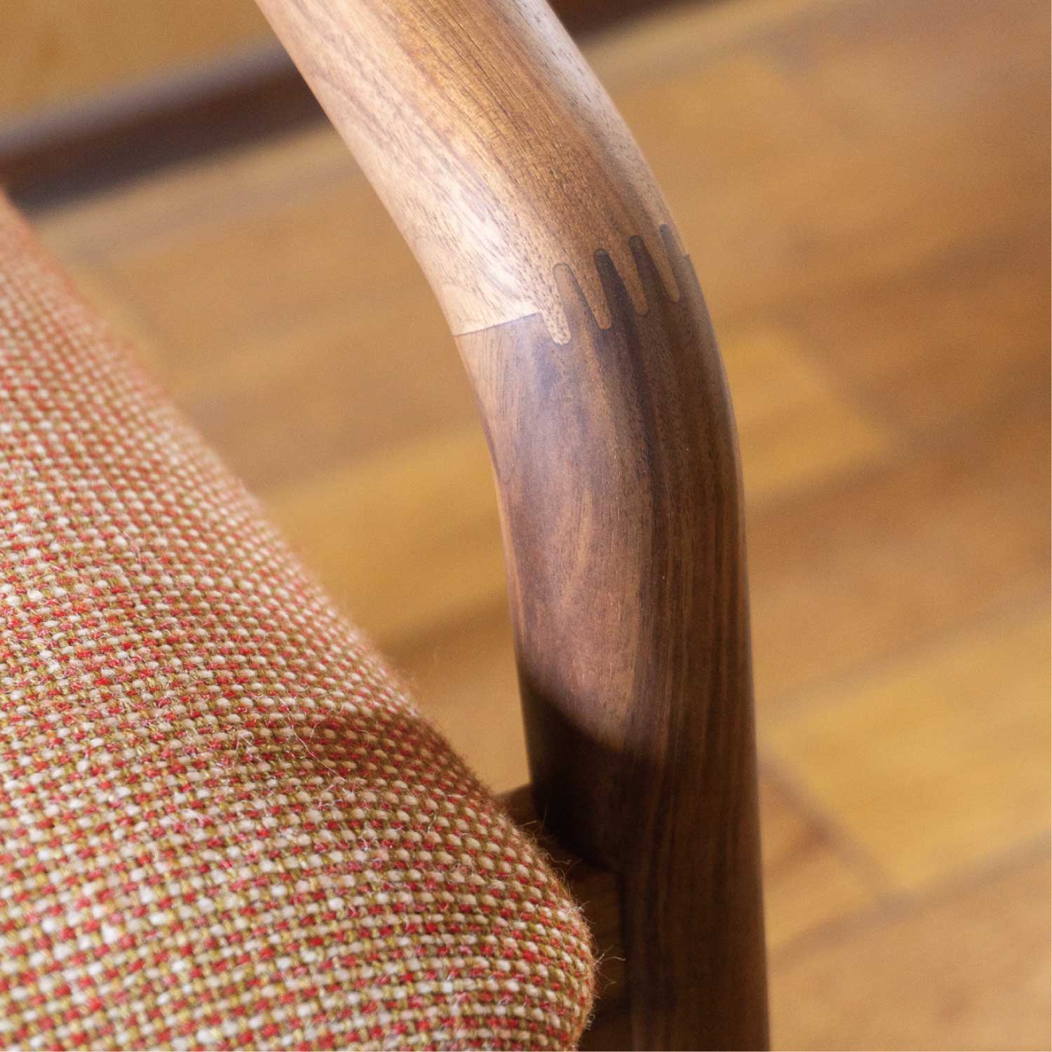 強度のためだけではなく、デザインのポイントになっているフィンガージョイント。このイスでは四角と丸が融合しています。脚先では丸い断面が徐々にアームの部分では丸四角になり手にやさしい触り心地を与えます。そして背で丸に戻る。こんなところにも胡椒(=pepe)のような技術の隠し味が効いているのです。