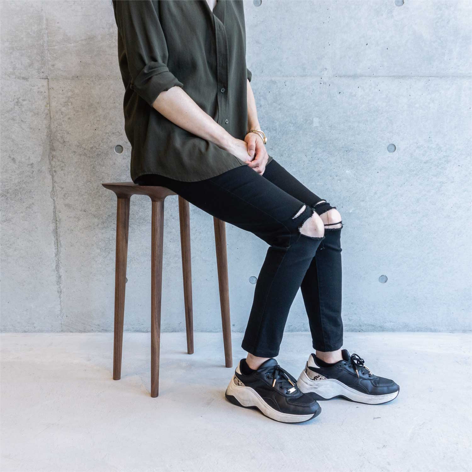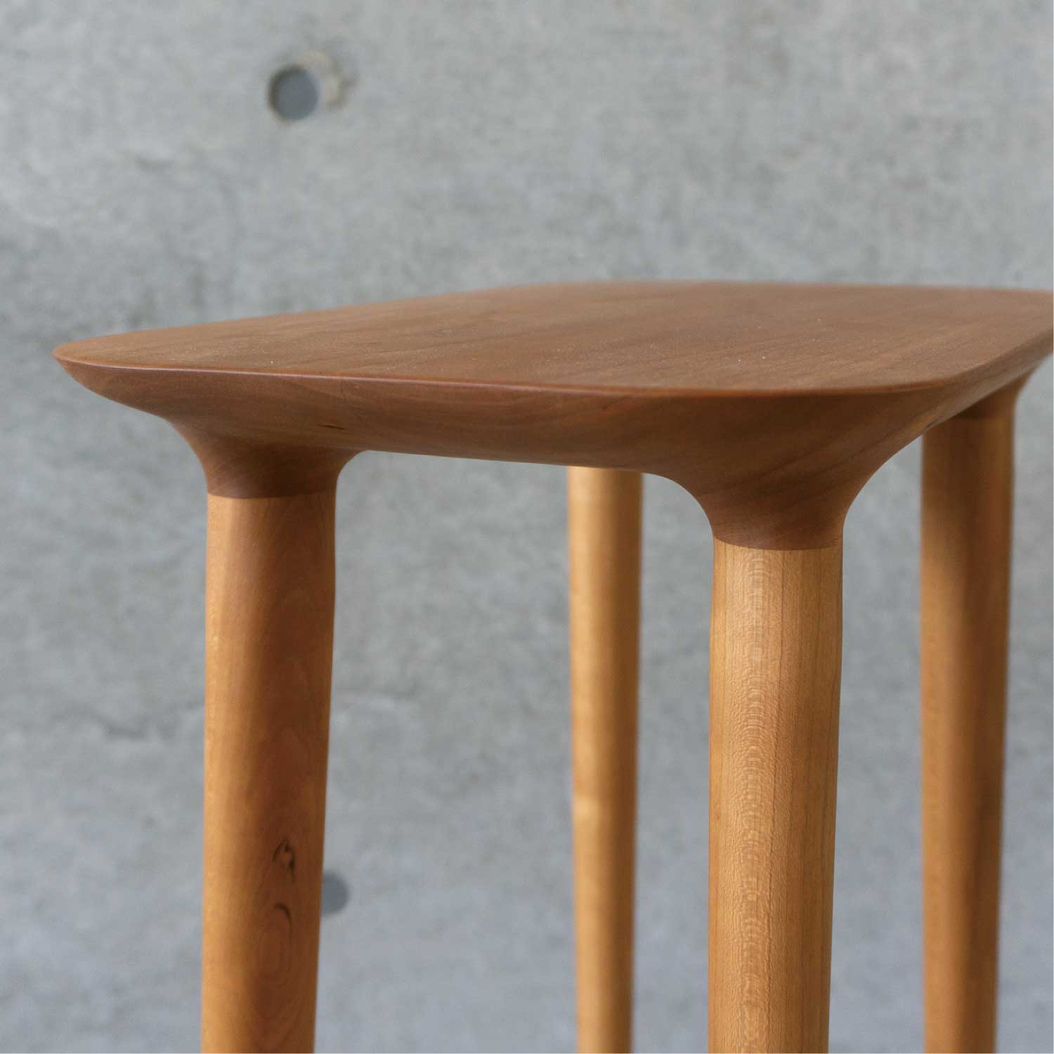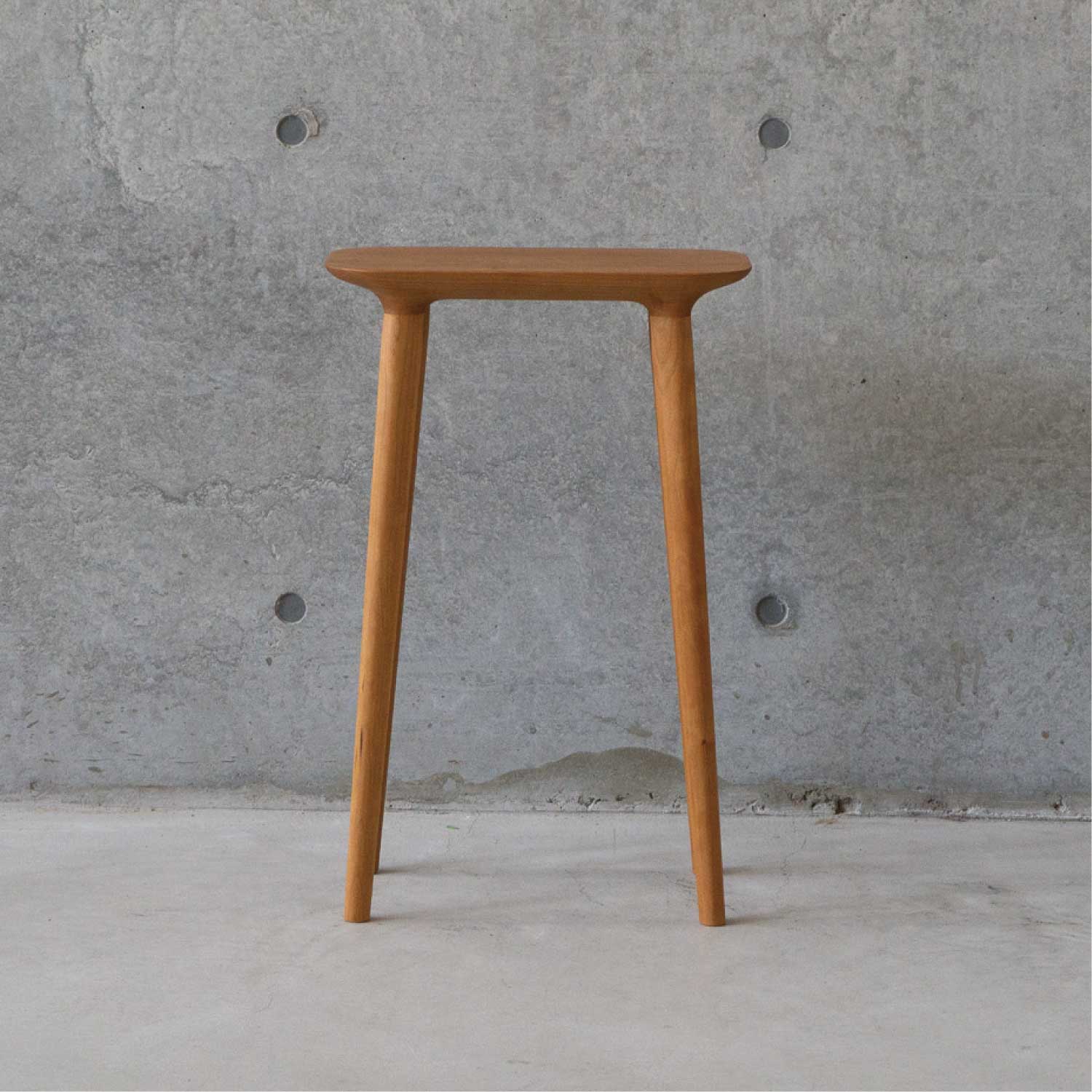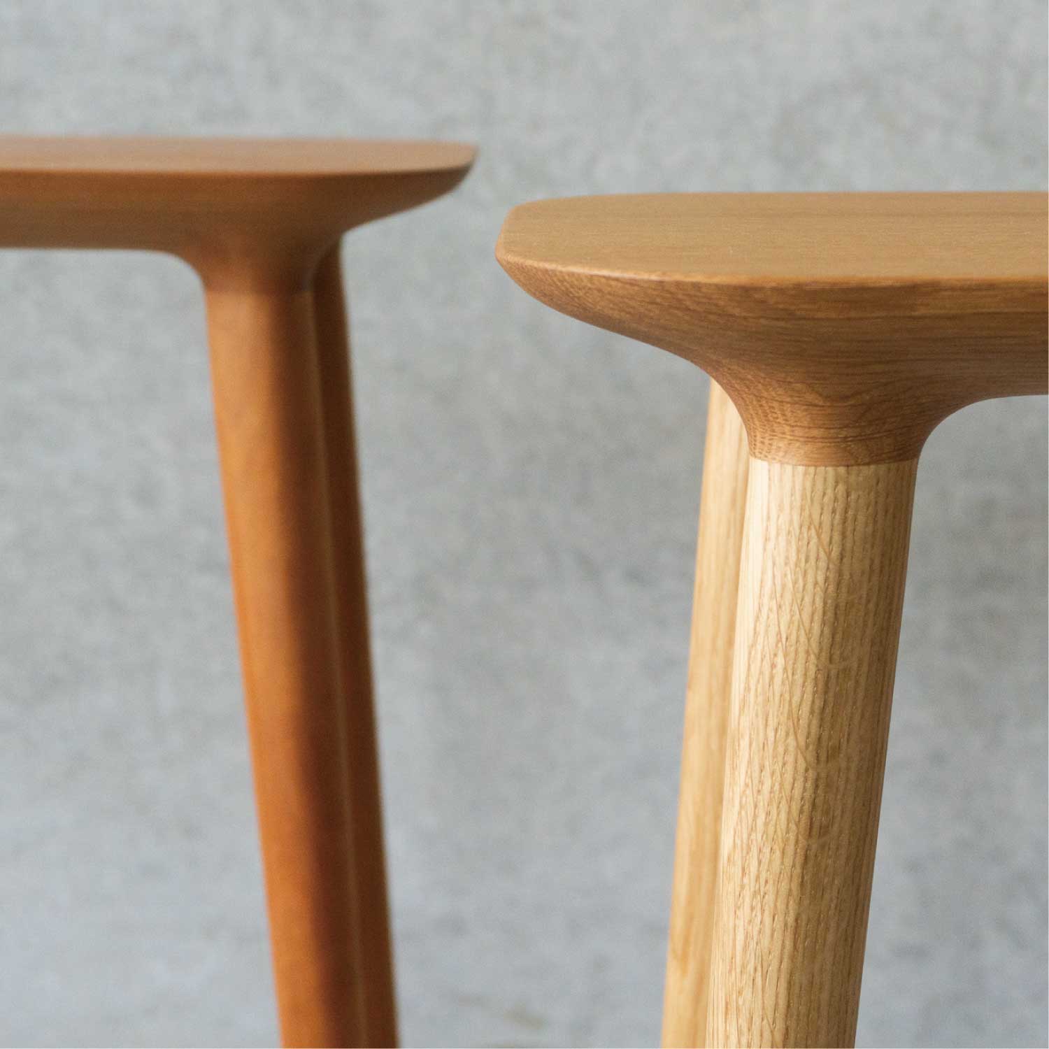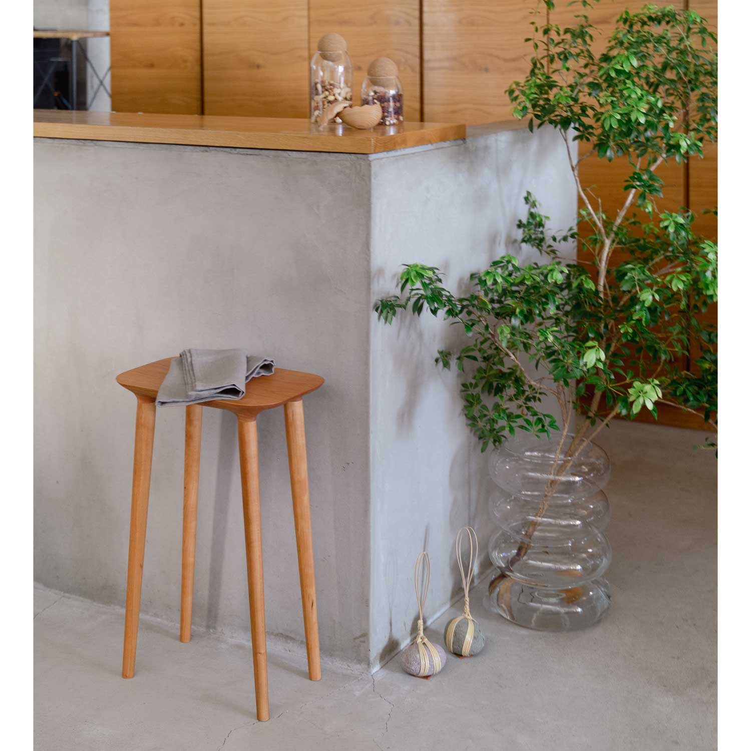 主にキッチン空間で使われることを考えて作られたシンプルで小ぶりなスツールです。料理中に少し腰掛けたり、何か物を置いたりできるように座面が高く、フラットになっています。お好みで脚をカットすることができるのでスツールやサイドテーブルとしても色々な場所でお使いいただけます。座面の裏側のディティールにもこだわって作られています。