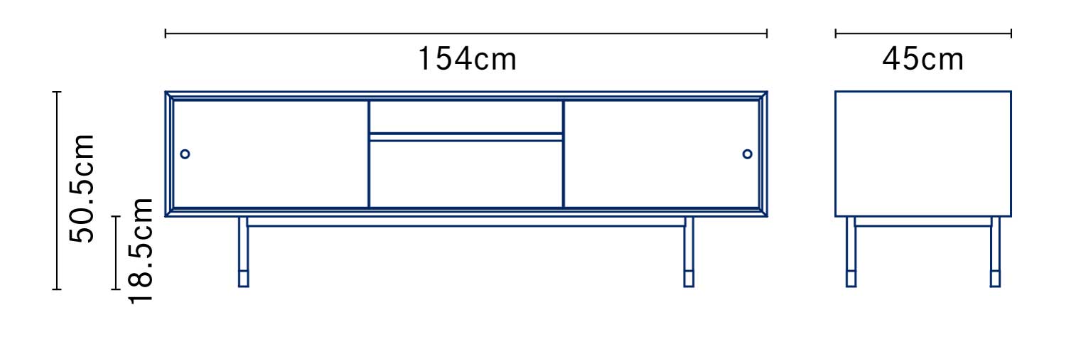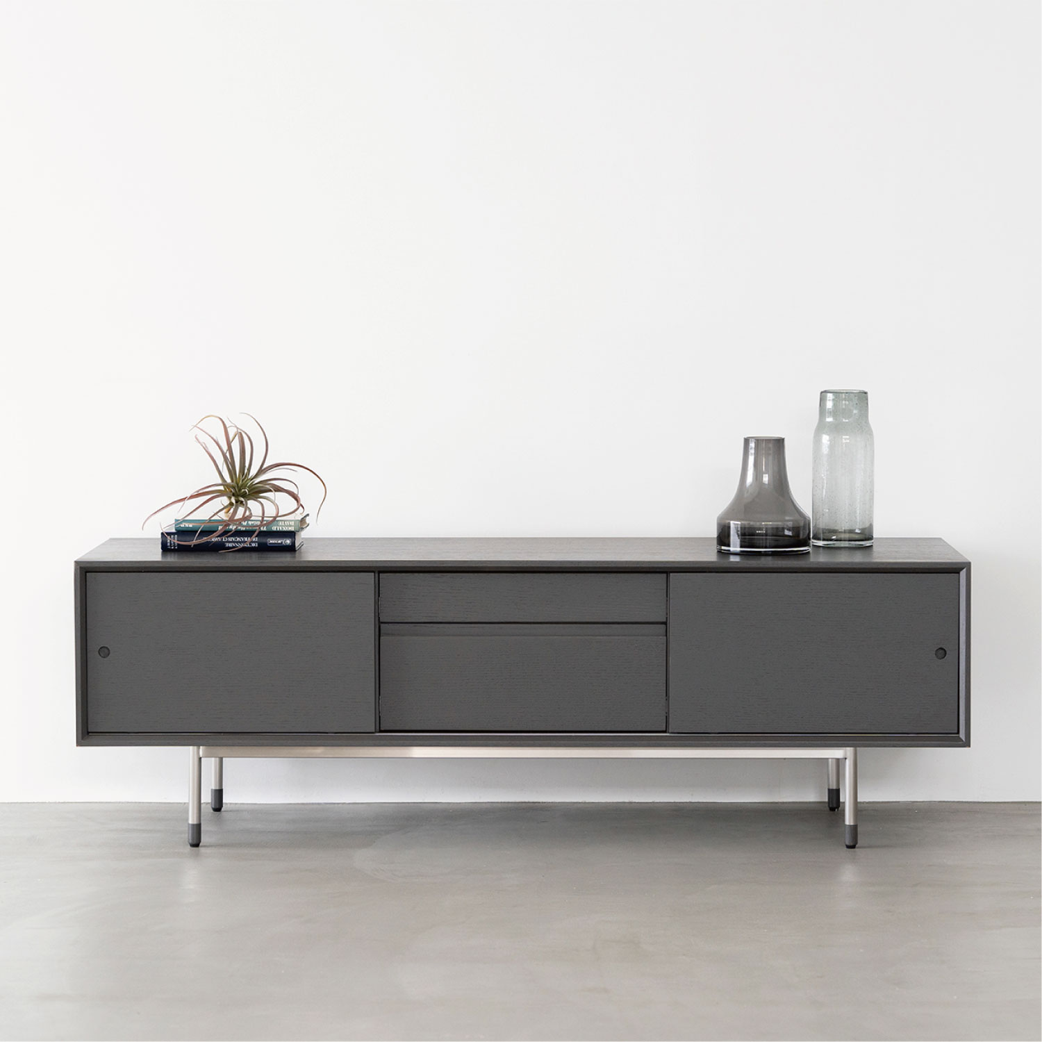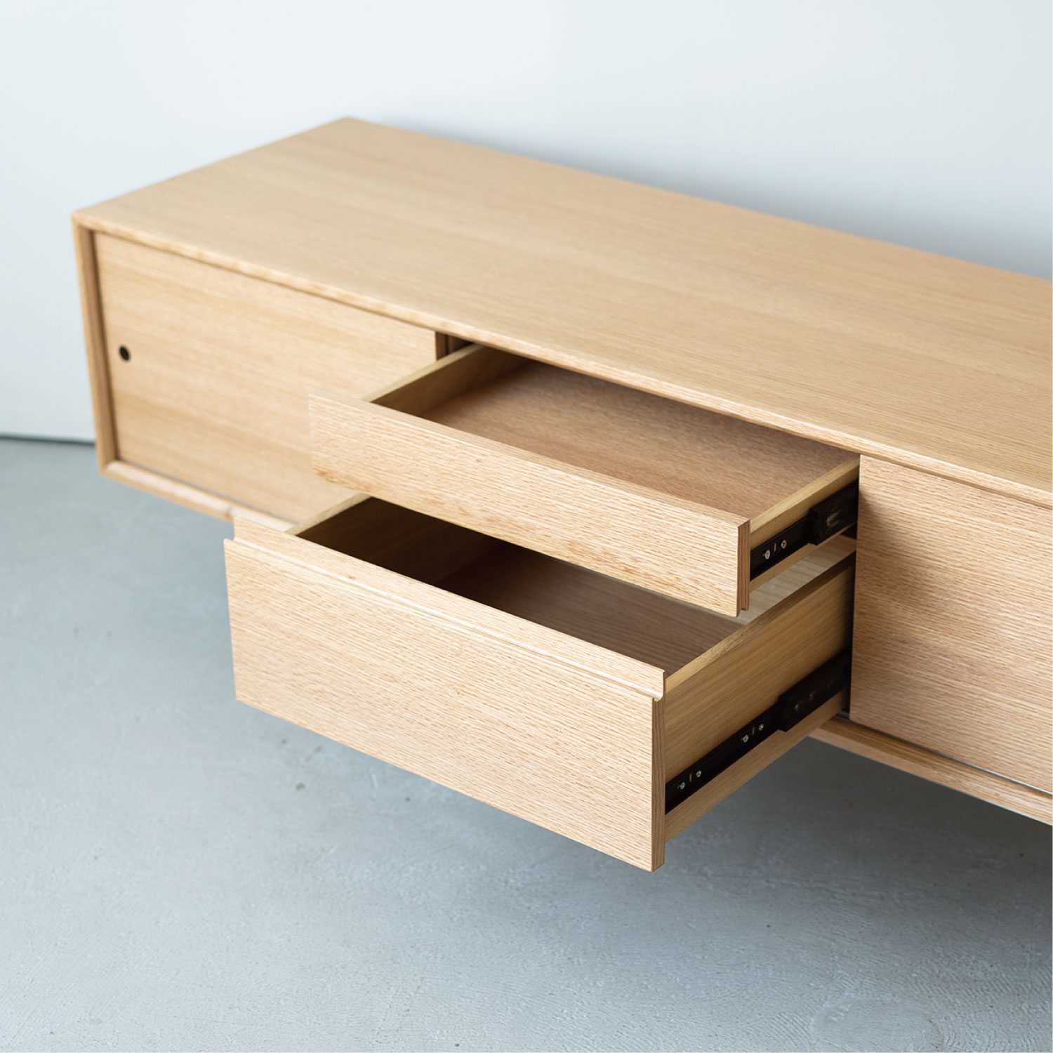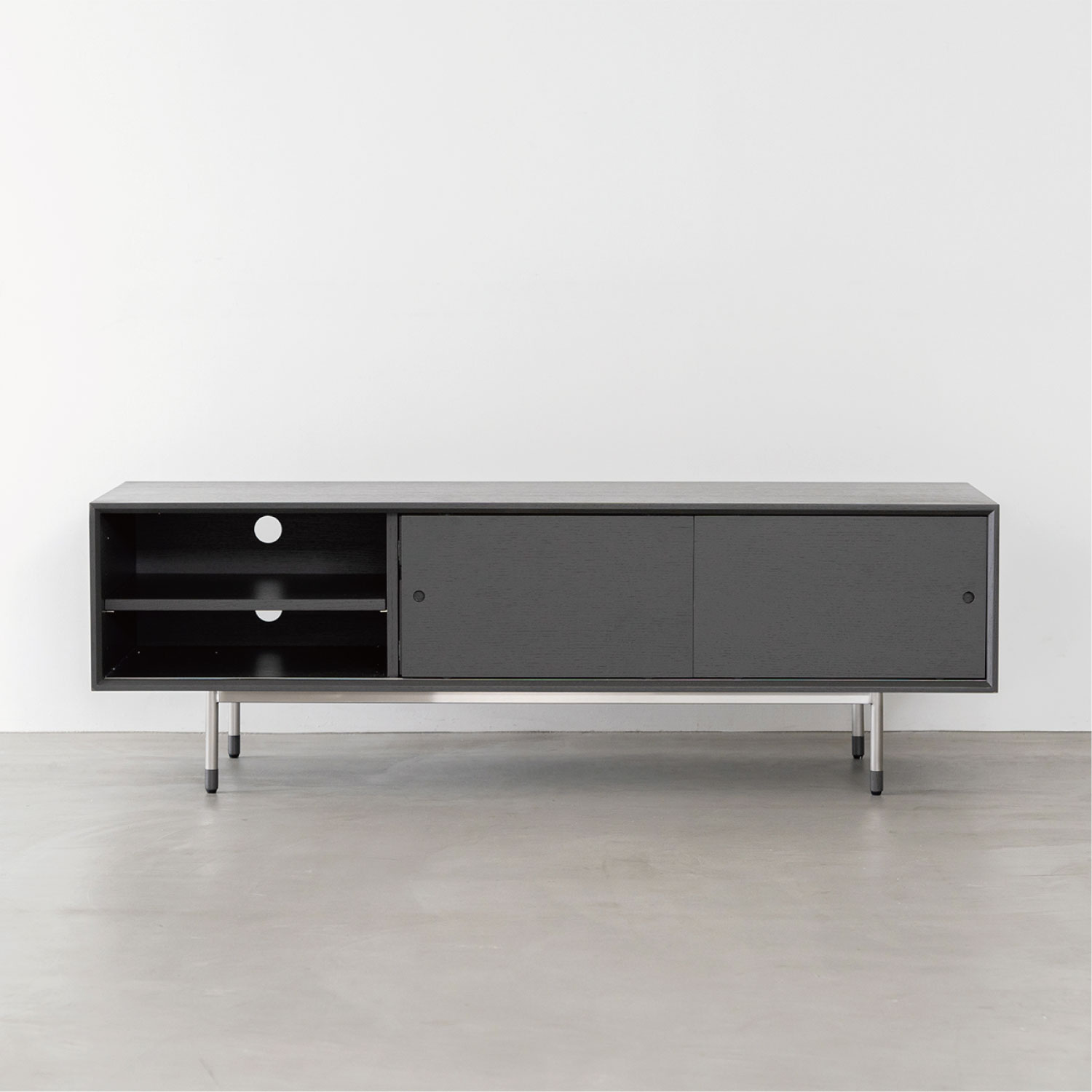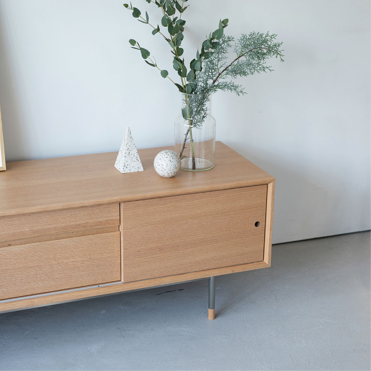 シンプルなオーク材の TV ボード。ステンレスとのコントラストが清潔感のある印象をもたらします。引き戸と引き出しで収納も充実しています。脚先の無垢材がアクセント。