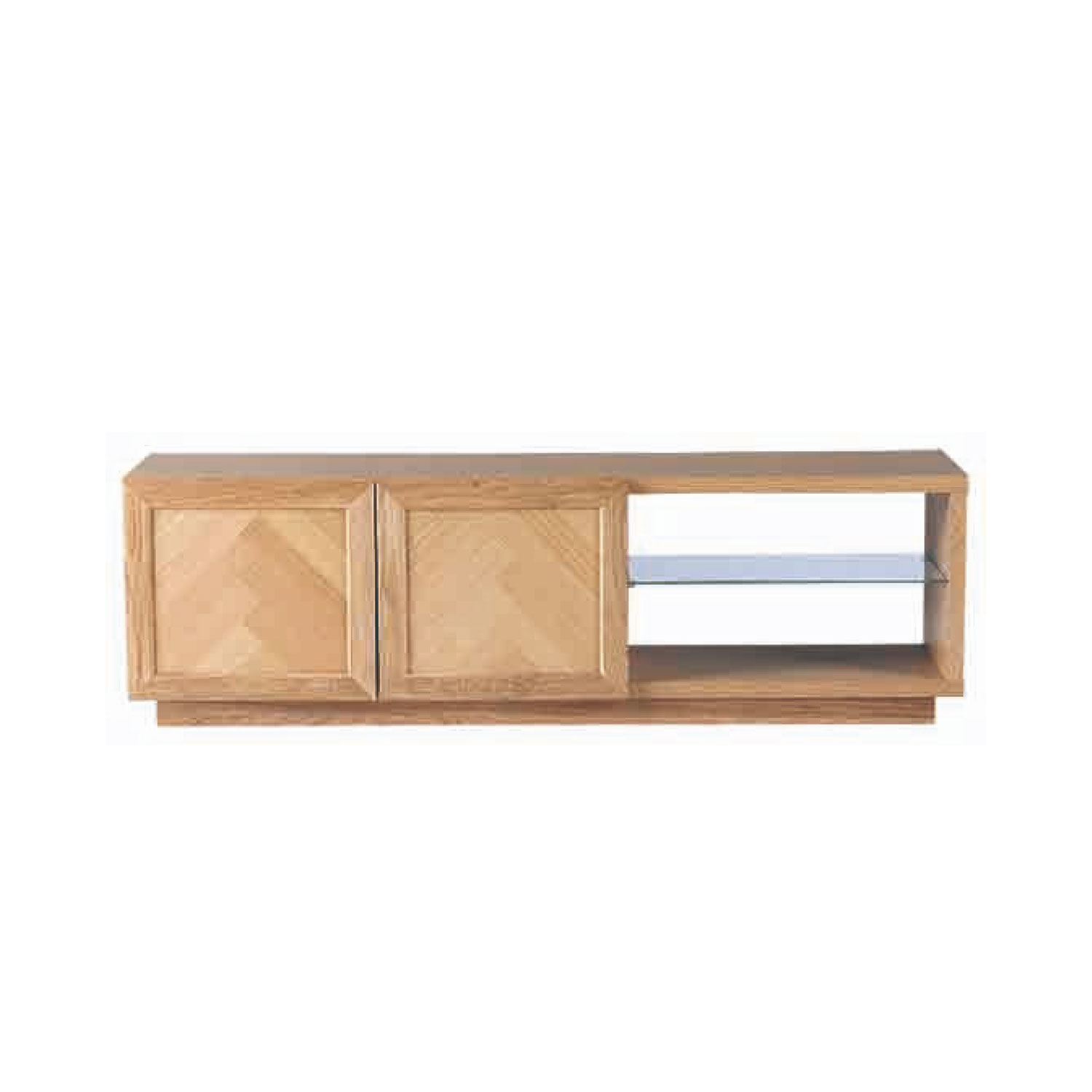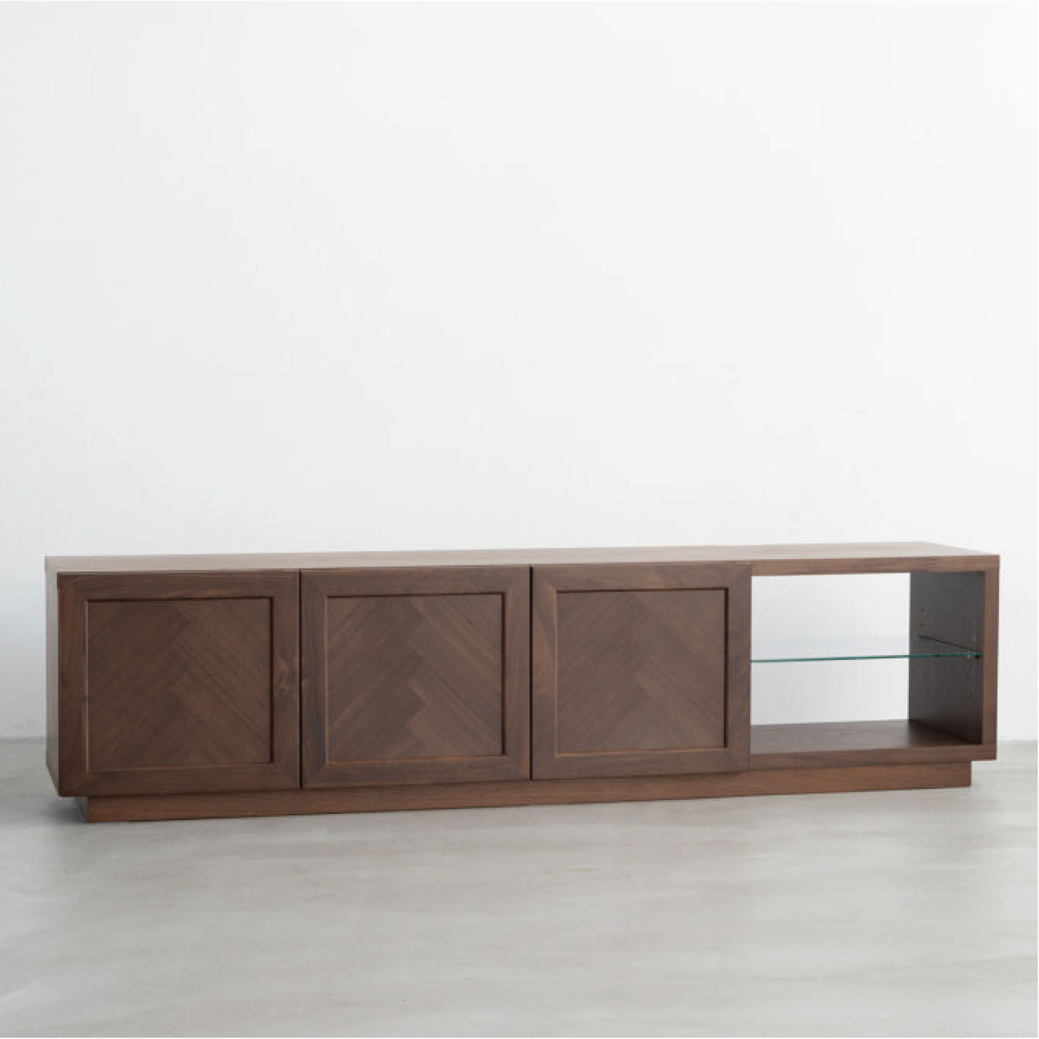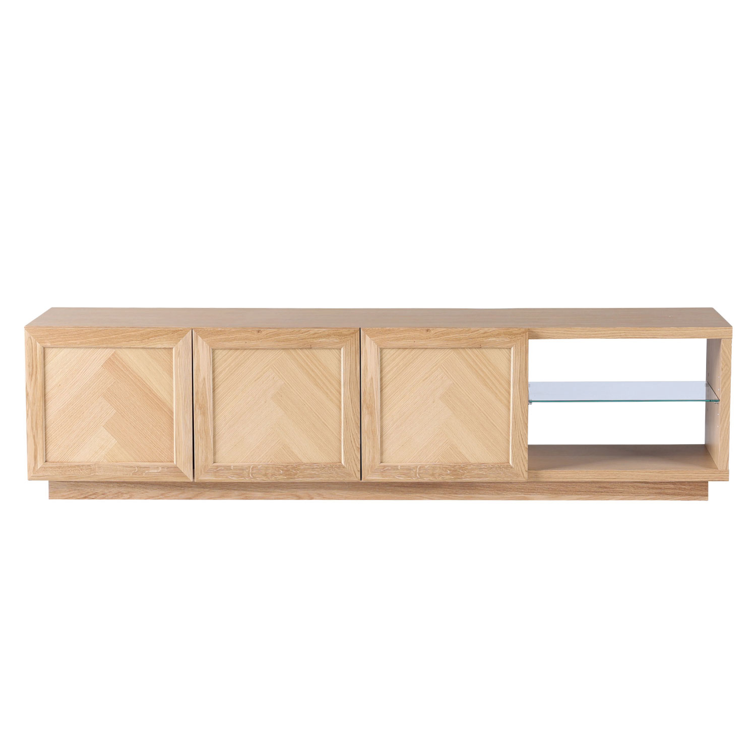 ヘリンボーン柄が特徴のTVボード。シンプルで木の温かみが感じられます。程よく存在感があり、北欧インテリアに合わせやすいデザインです。ヘリンボーン柄に貼り合わせたランダムな木目が単調になりがちな木製の収納家具に深みをあたえてくれます。オープン部にオーディオ機器を収納できます。