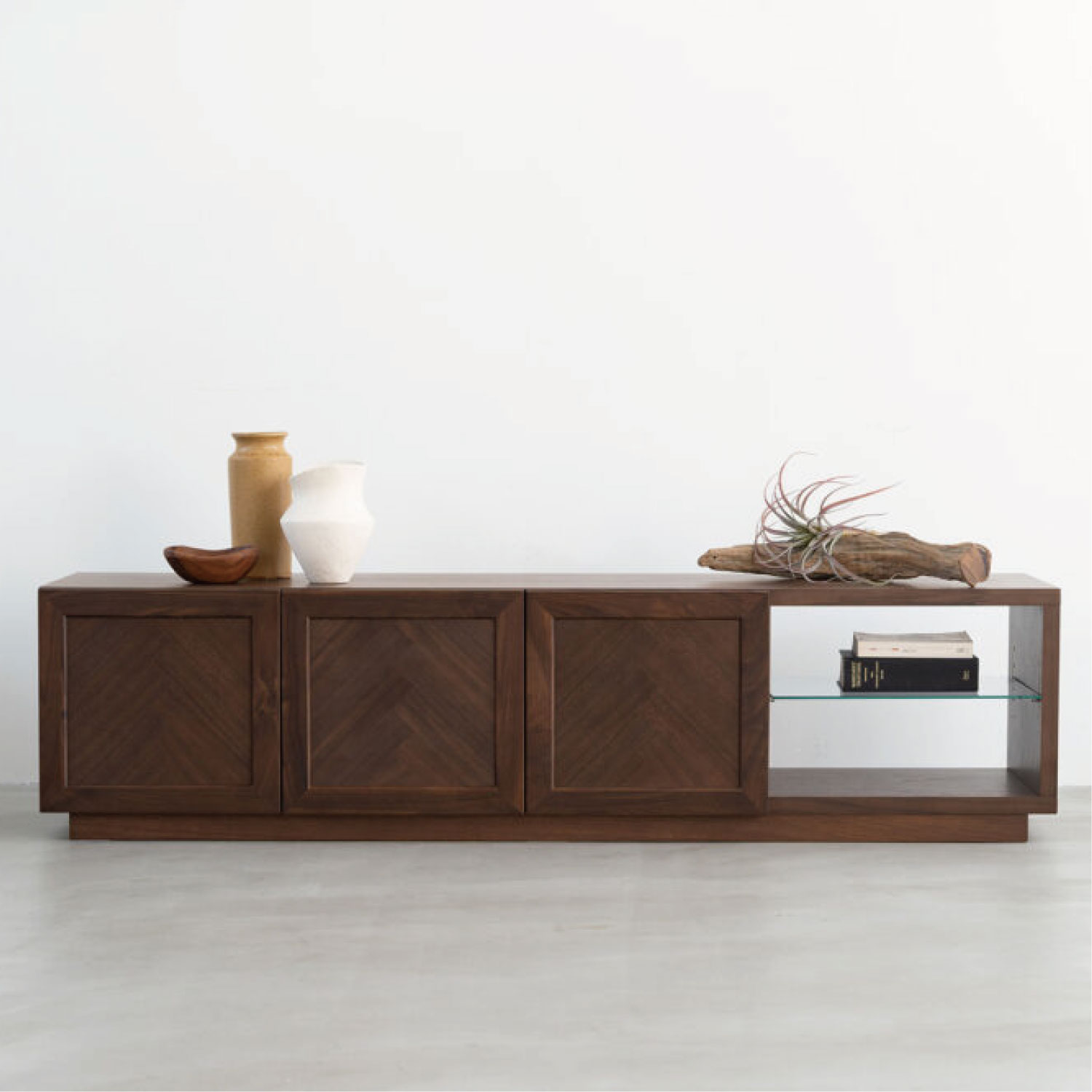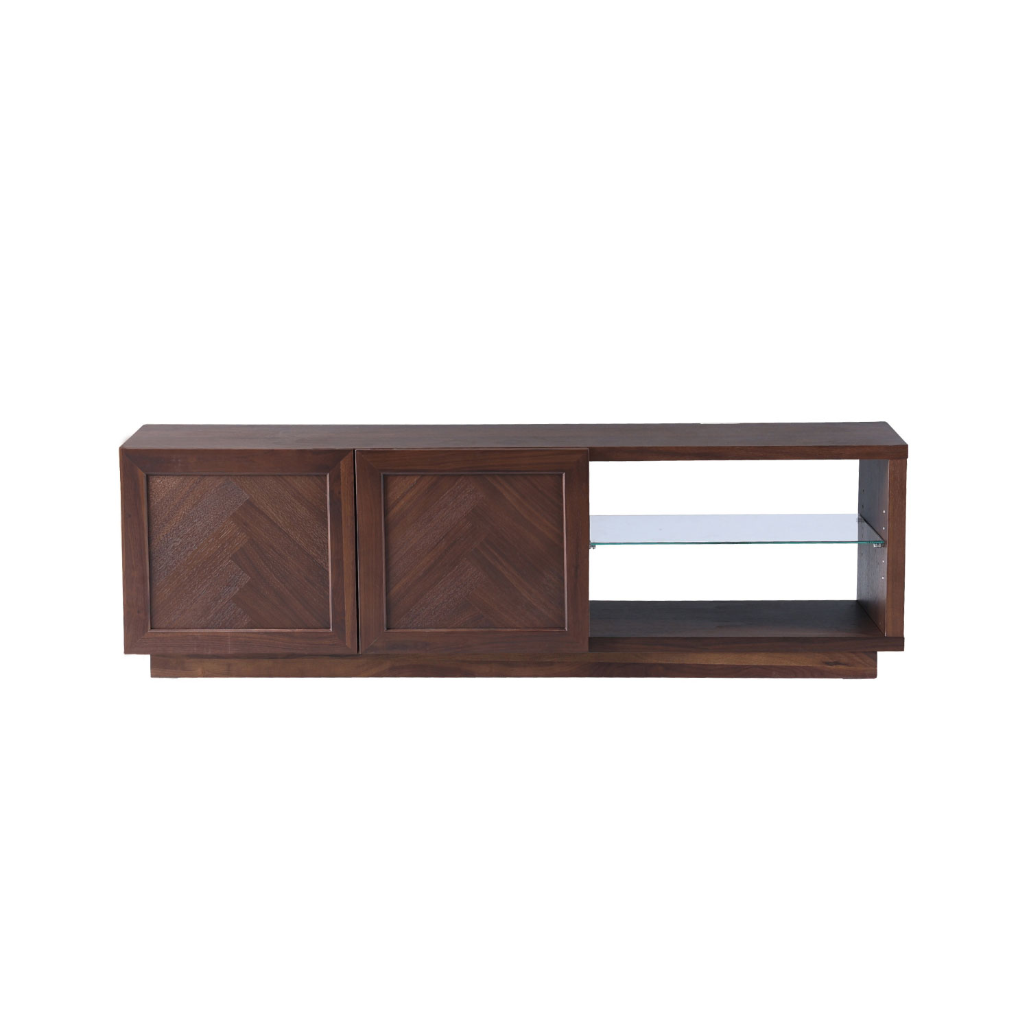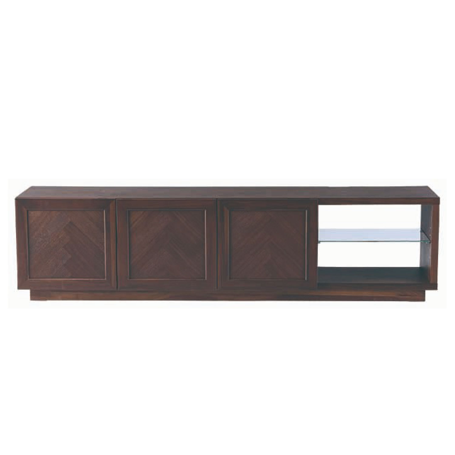 ヘリンボーン柄が特徴のTVボード。シンプルで木の温かみが感じられます。程よく存在感があり、北欧インテリアに合わせやすいデザインです。ヘリンボーン柄に貼り合わせたランダムな木目が単調になりがちな木製の収納家具に深みをあたえてくれます。オープン部にオーディオ機器を収納できます。