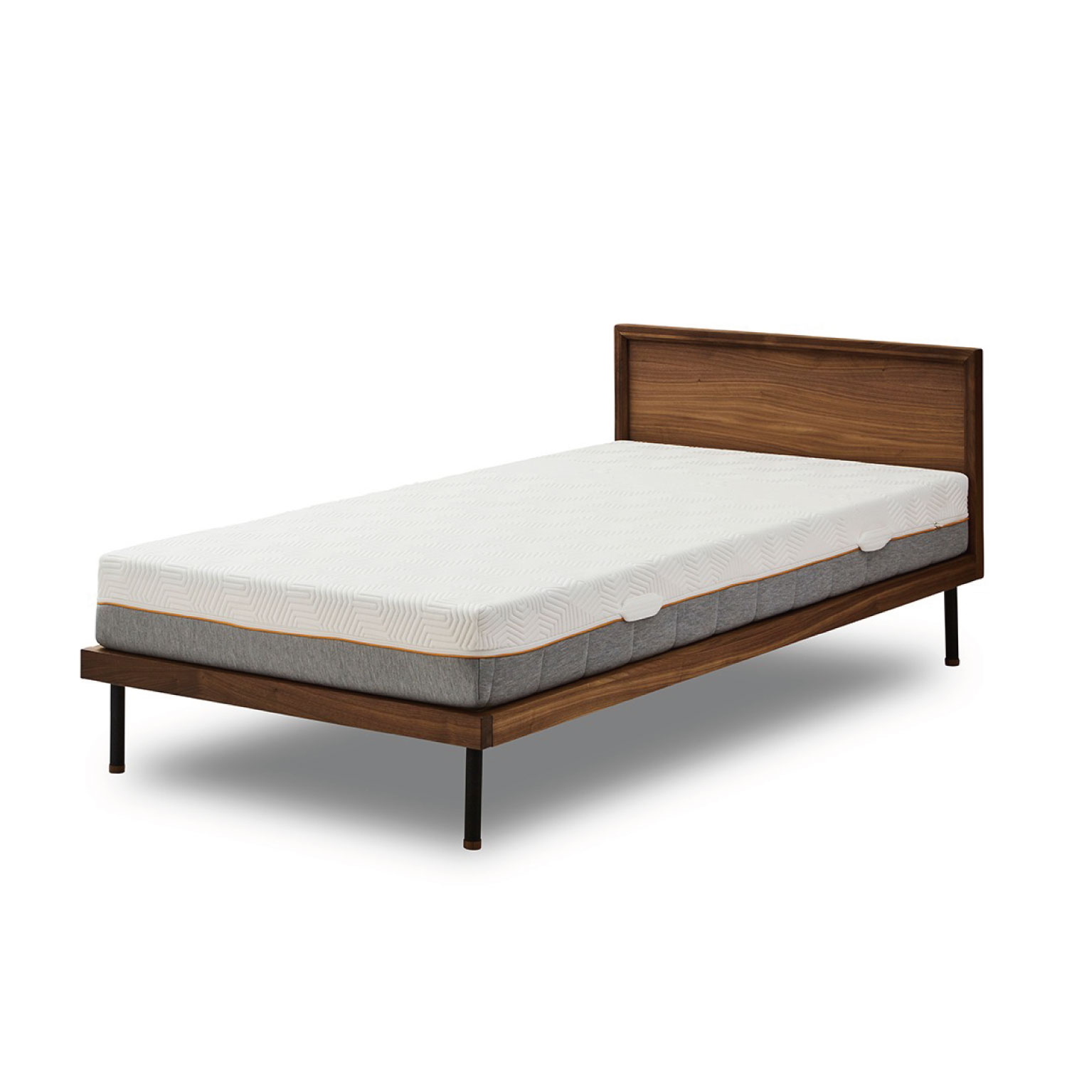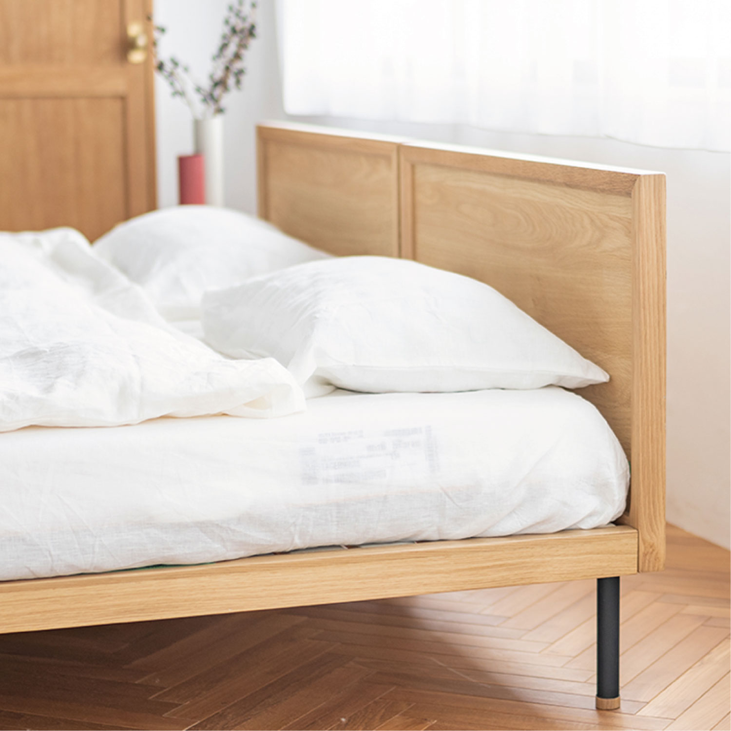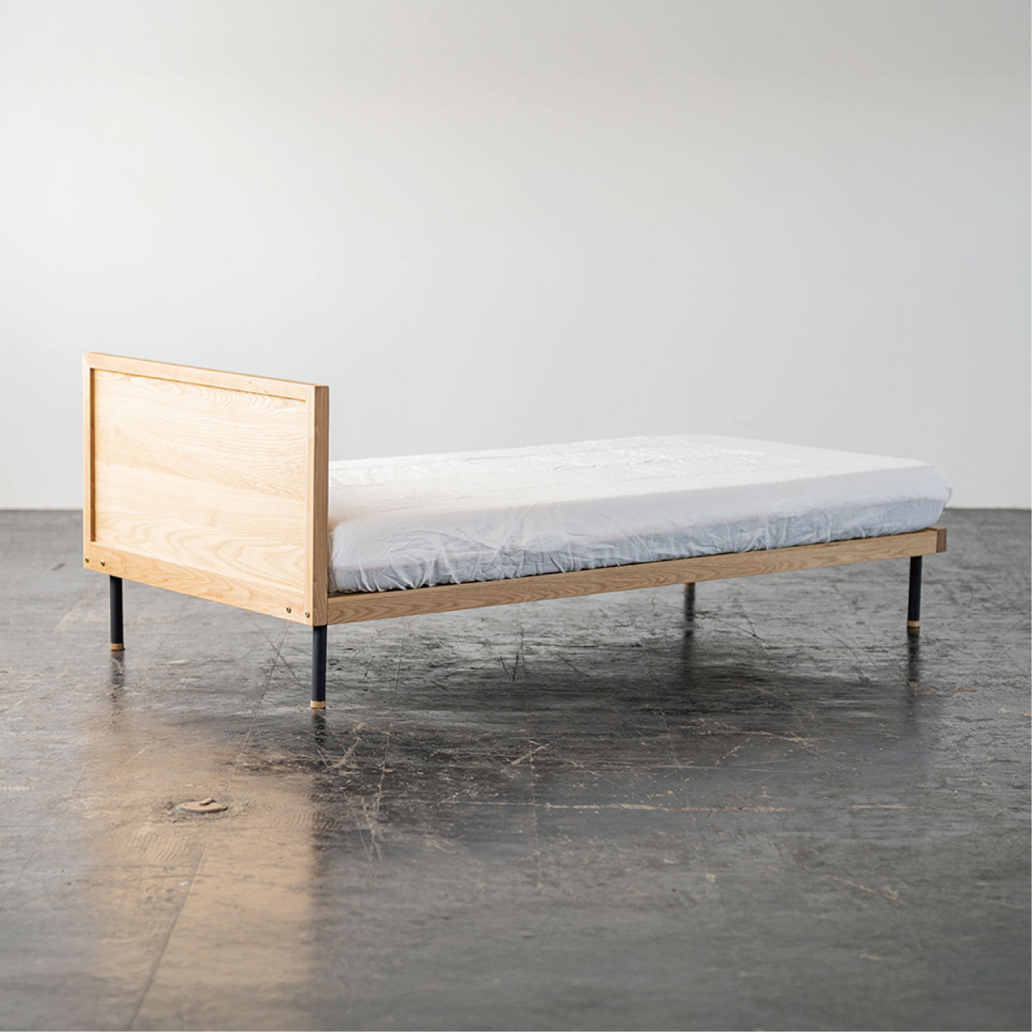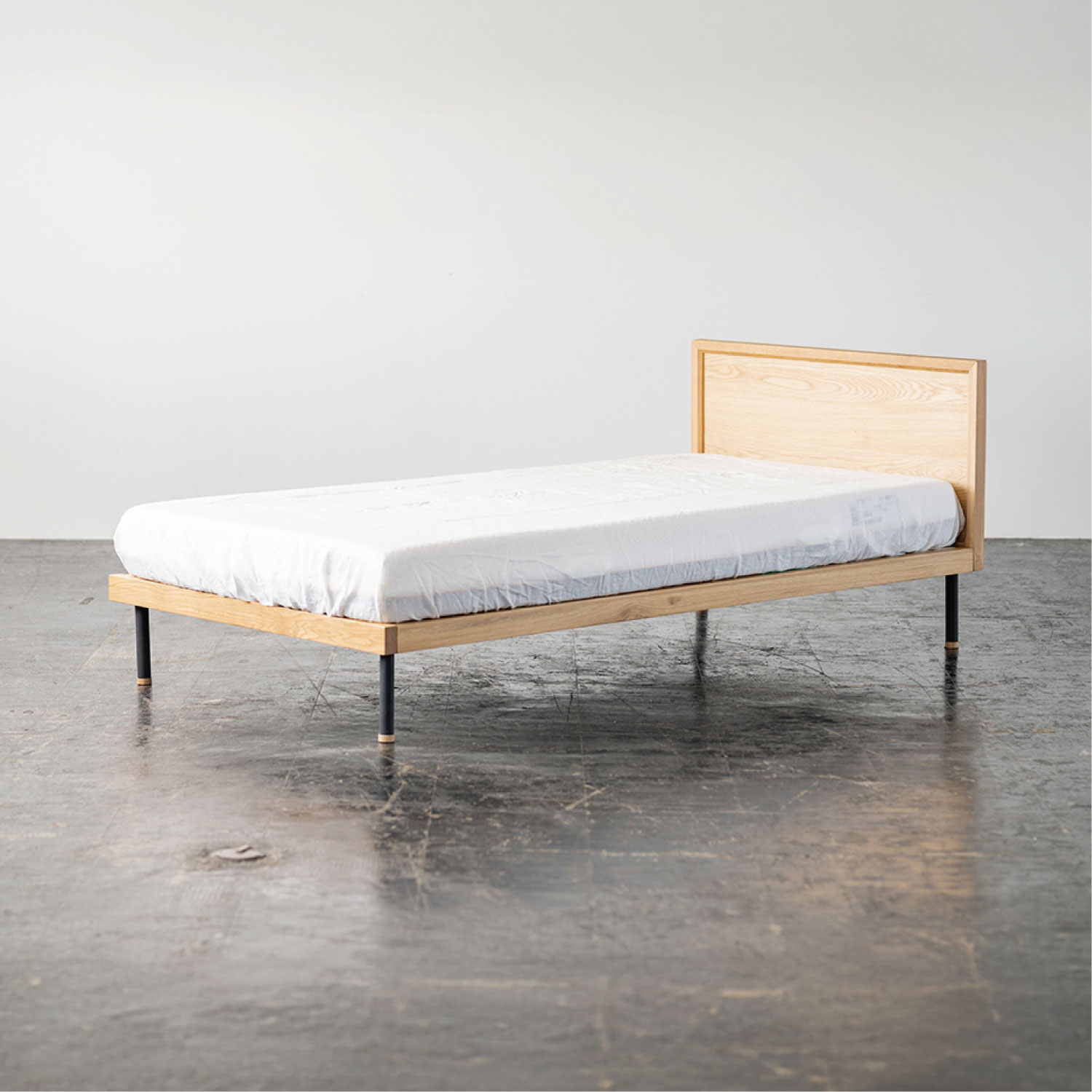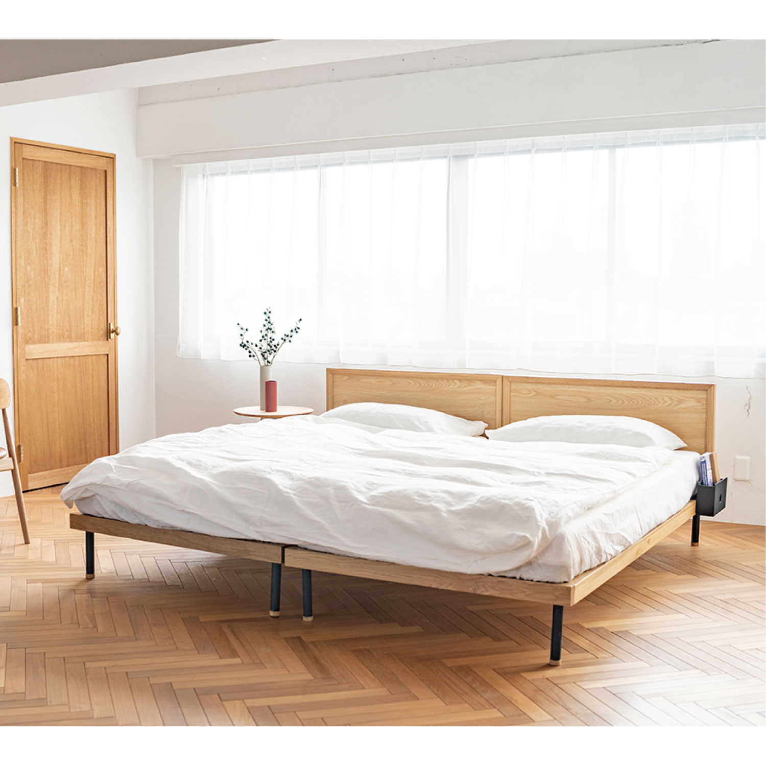 寝室はシンプルで落ち着く空間に。木製のベッドフレームを構造から見直し、よりシンプルで使いやすいベッドフレームを追求しました。フレーム部分は木でありながら、厚みを抑え、すっきりとした印象に。躯体にスチールパイプを採用し、強度面にも配慮し設計されています。スッと伸びた細身のスチール脚は、脚先の無垢がアクセント。ヘッドボードは好みに合わせて4種類の中からお選びいただけます。