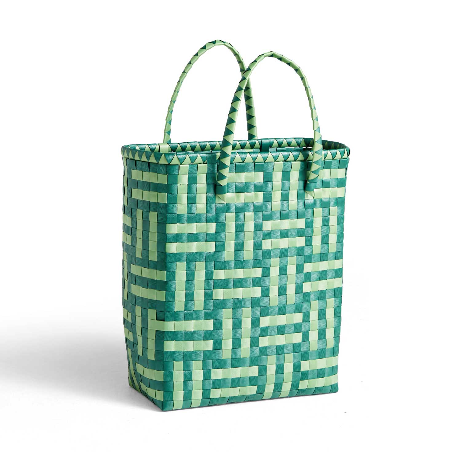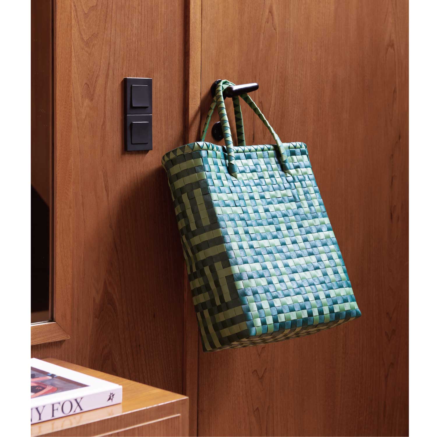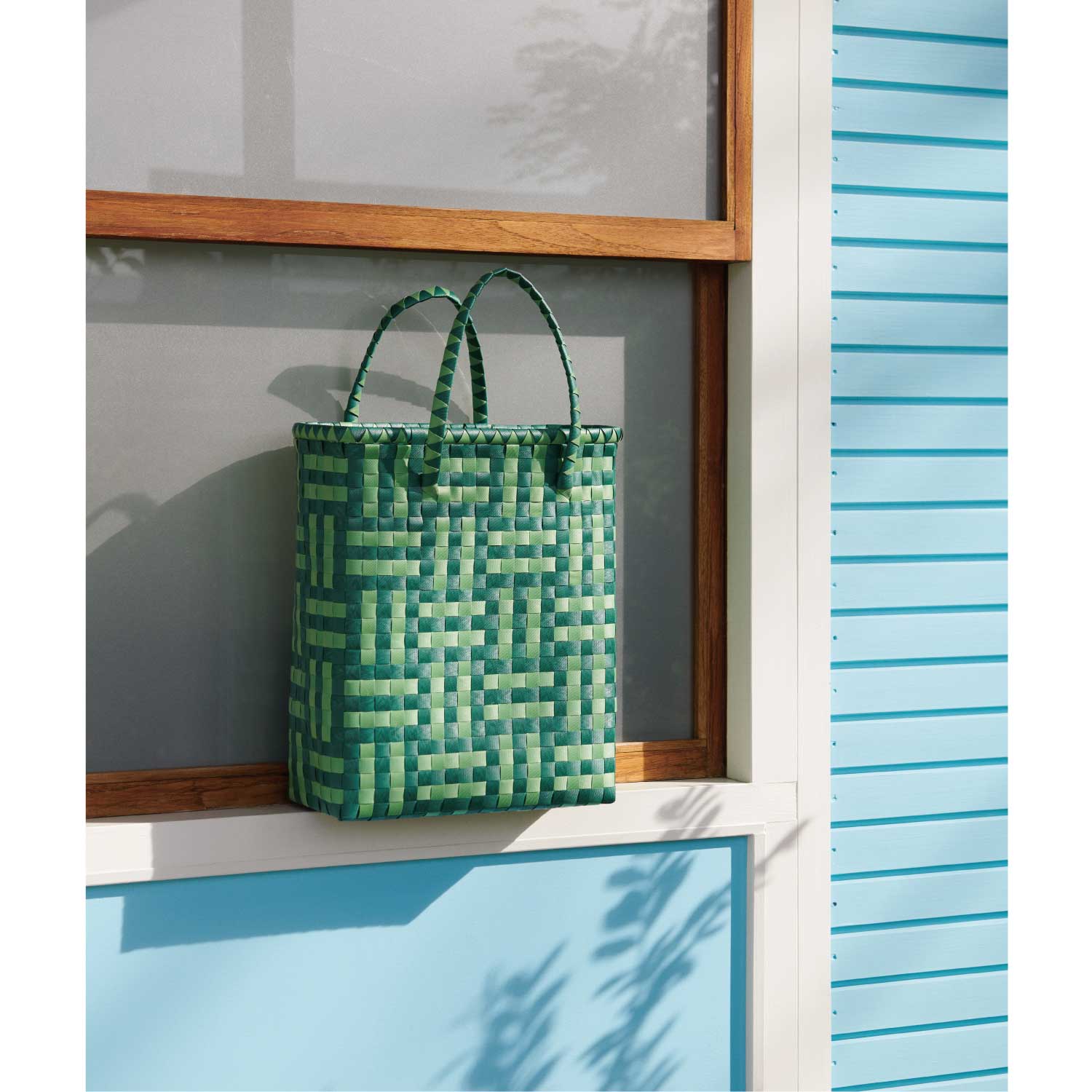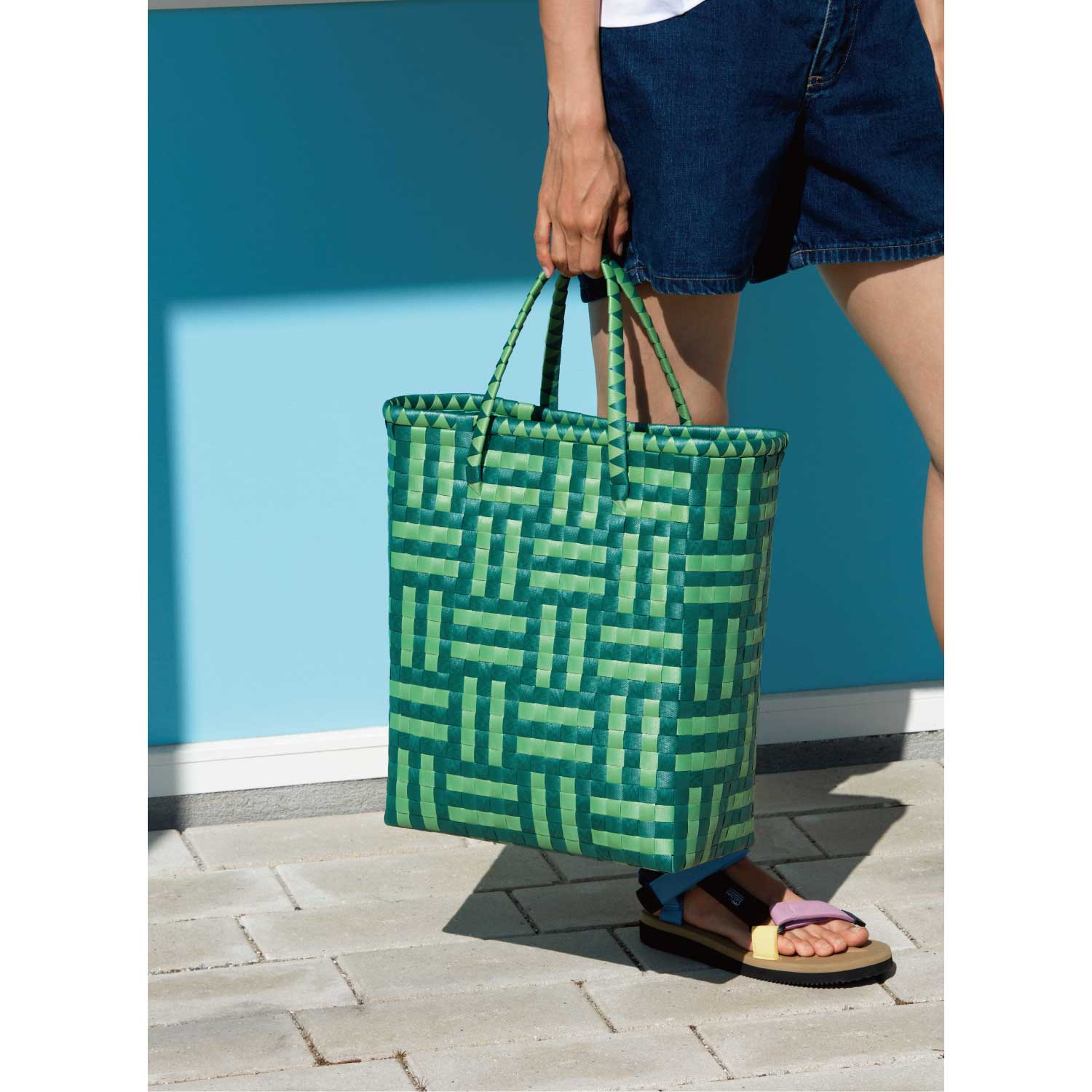 リサイクルプラスチックのバンドを用い、職人の手によって一点ずつ丁寧に編み上げられています。ログキャビンパターンが印象的で、ぱっと目を引くカラフルな表情も魅力です。
