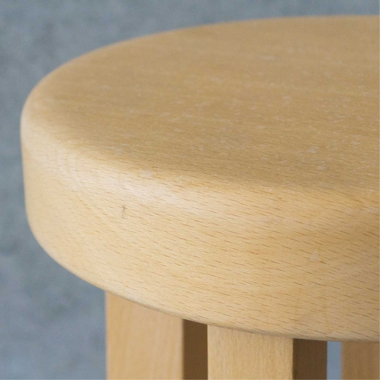 岡山県の山間の納屋で作られたことから名付けられたナヤスツールは、1974年に小松勲氏の手から生み出されました。小松氏が木彫りの備中神楽面の制作の際に作業用の椅子として使ったものです。小学校教員の定年を機に、生来の手先の器用さを活かして、備中神楽面という難しい木彫り面の制作を26年に渡り続けました。小松氏の作る備中神楽面は、五穀豊穣を祈る神事から生まれたもので、この地方では家内内安全、家運隆盛を願って、伝統的に家の玄関に置かれてきました。ナヤスツールは、20年以上もの間忘れられたまま納屋の二階に置かれていましたが、2020年に神楽面用の材木の中から発見されました。