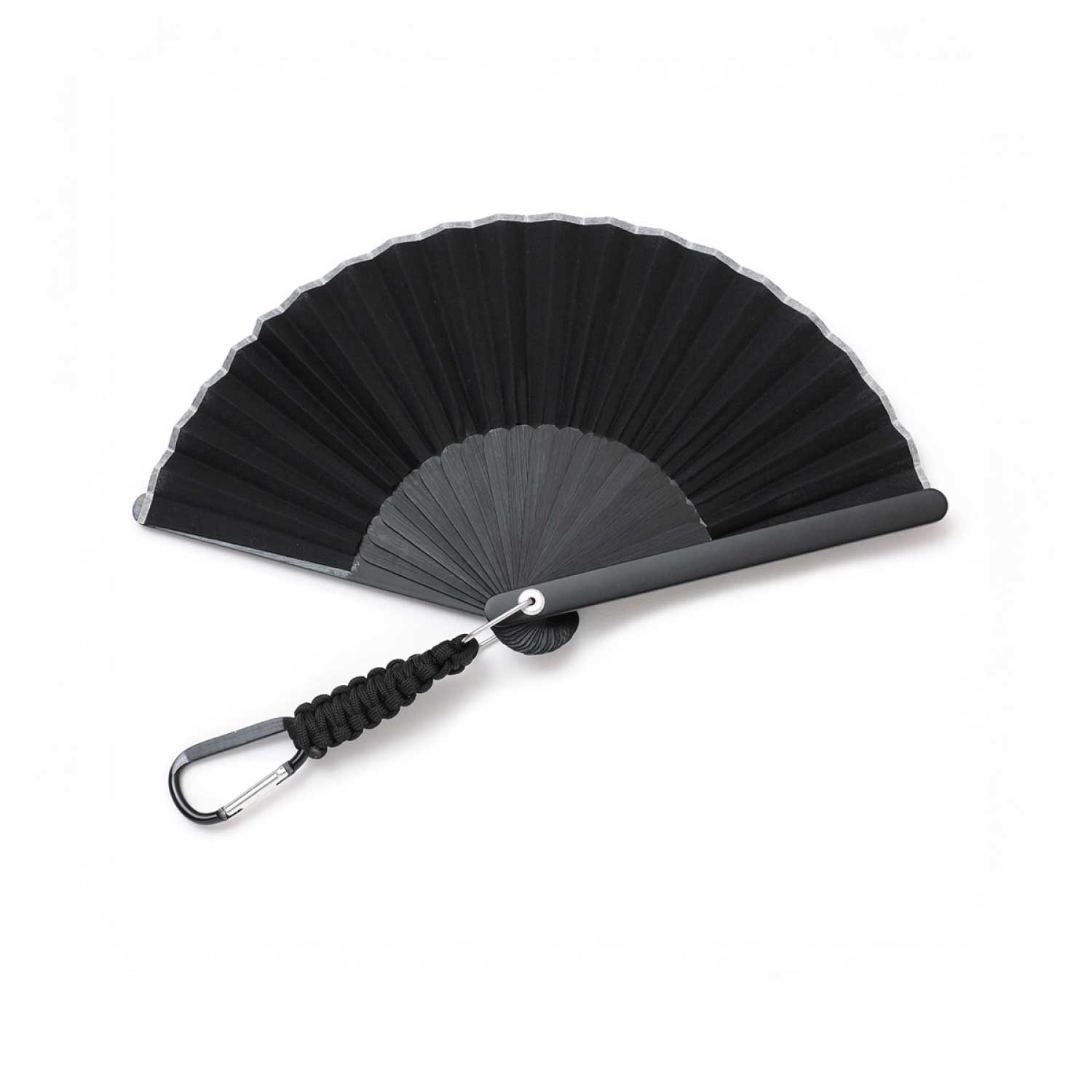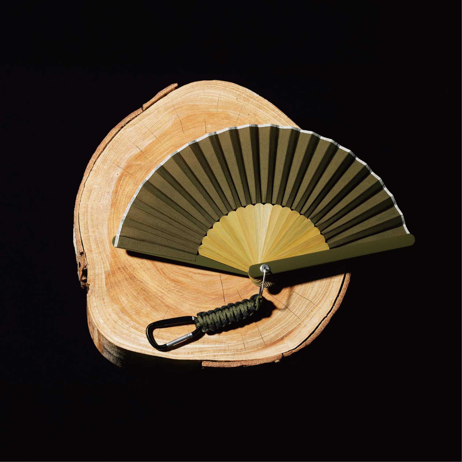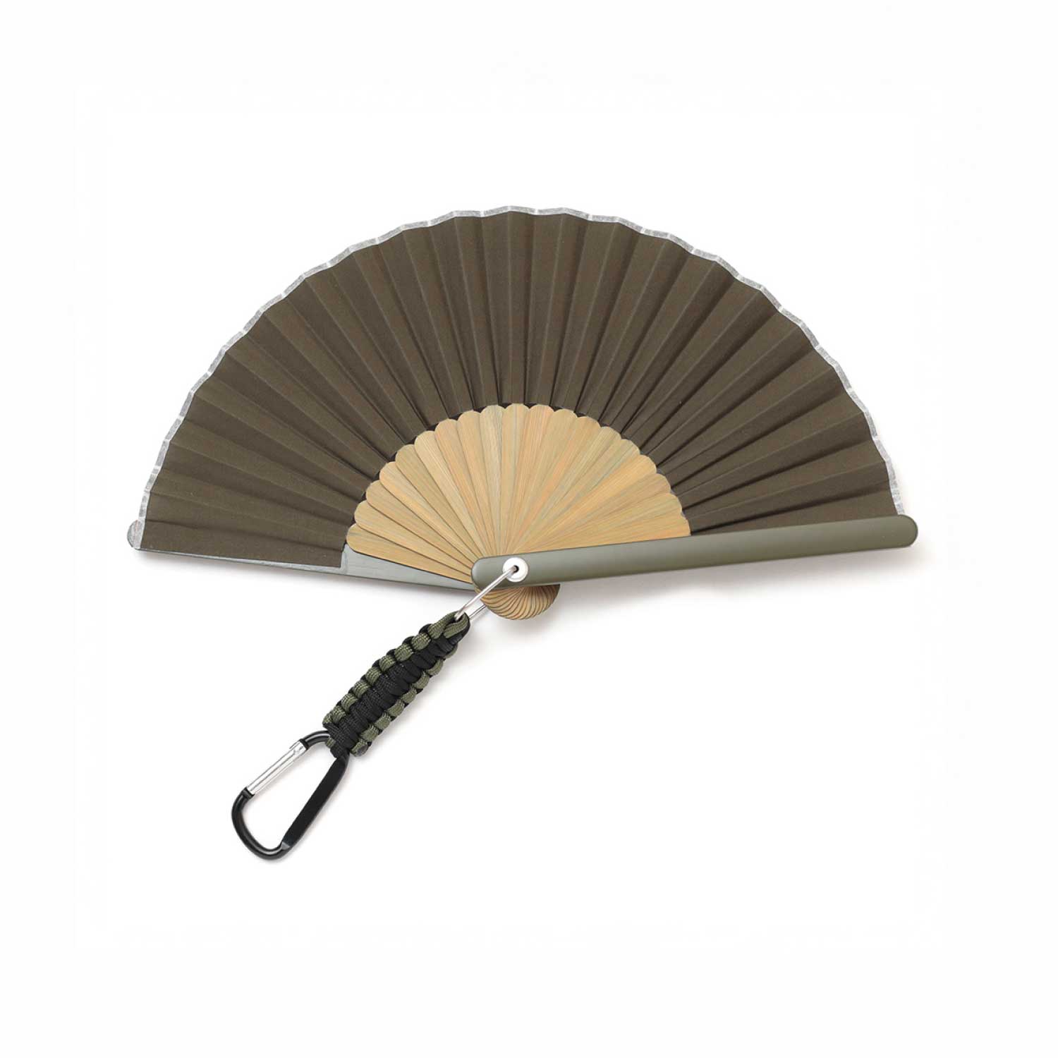アウトドアシーンに便利なカラビナ付きの扇子。扇子を束ねる要(かなめ)をオリジナルで作成、カラビナを取り付けました。ベルトループやバッグに付けて持ち運んだり、ランタンフックなどにかけておくことが出来ます。