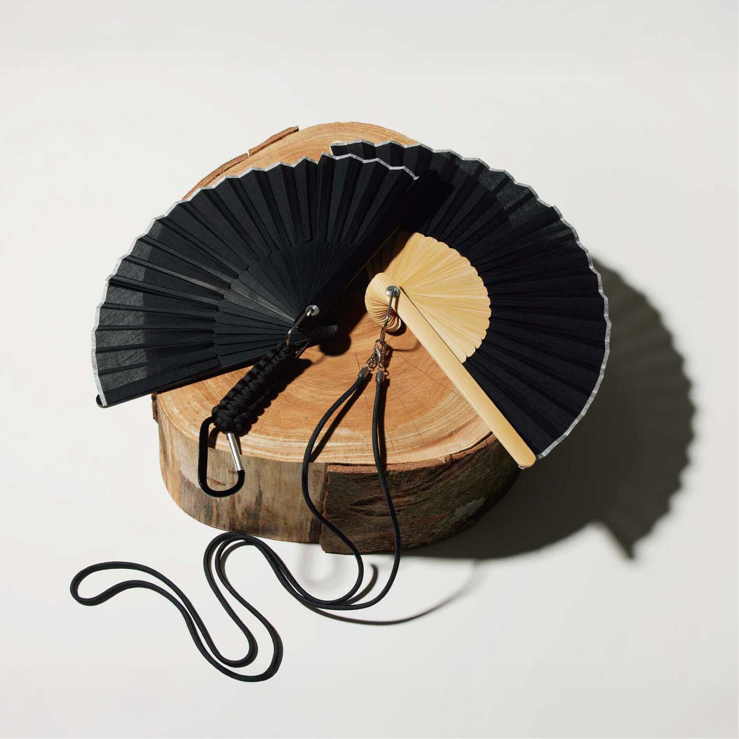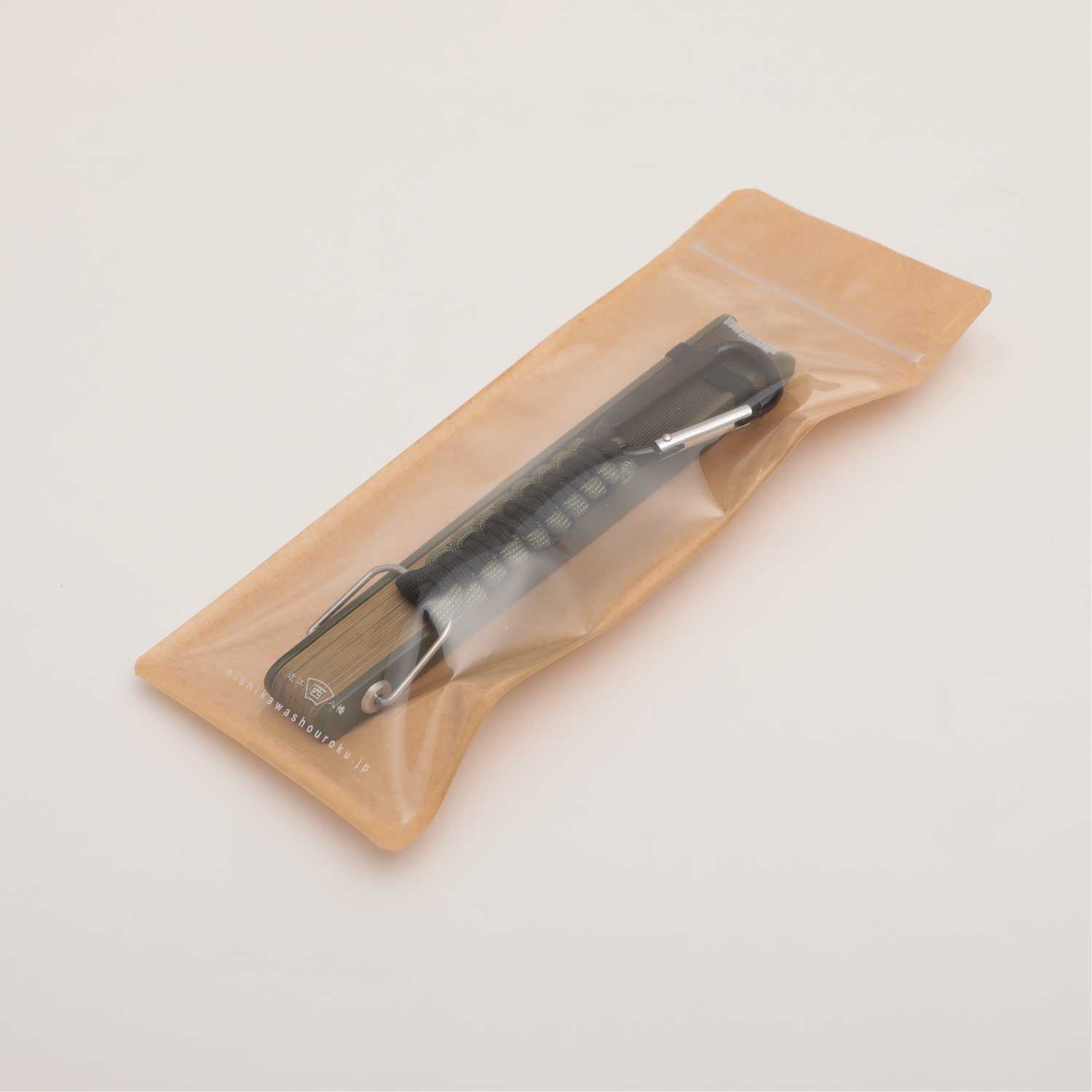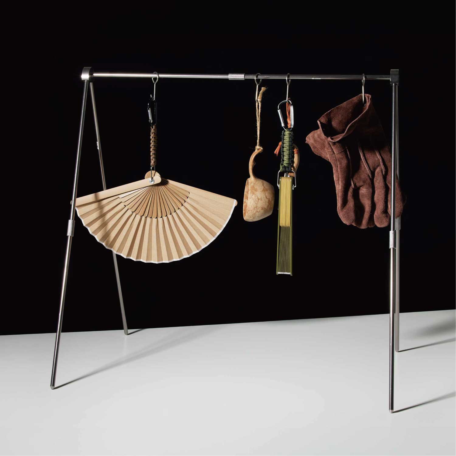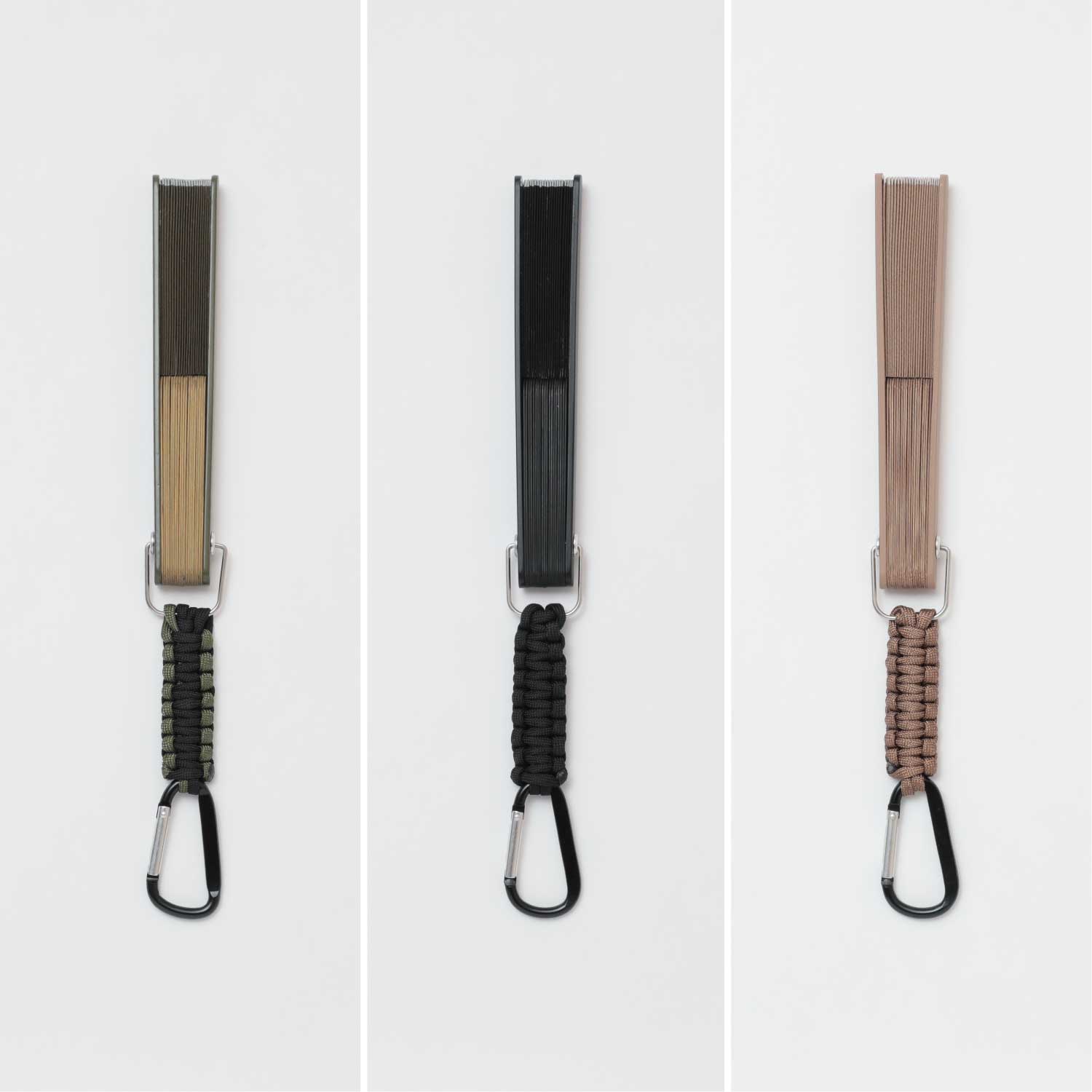 アウトドアシーンに便利なカラビナ付きの扇子。扇子を束ねる要(かなめ)をオリジナルで作成、カラビナを取り付けました。ベルトループやバッグに付けて持ち運んだり、ランタンフックなどにかけておくことが出来ます。