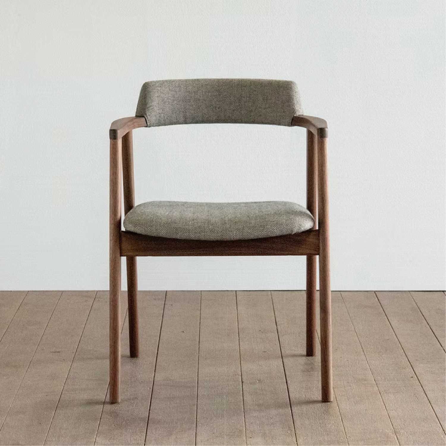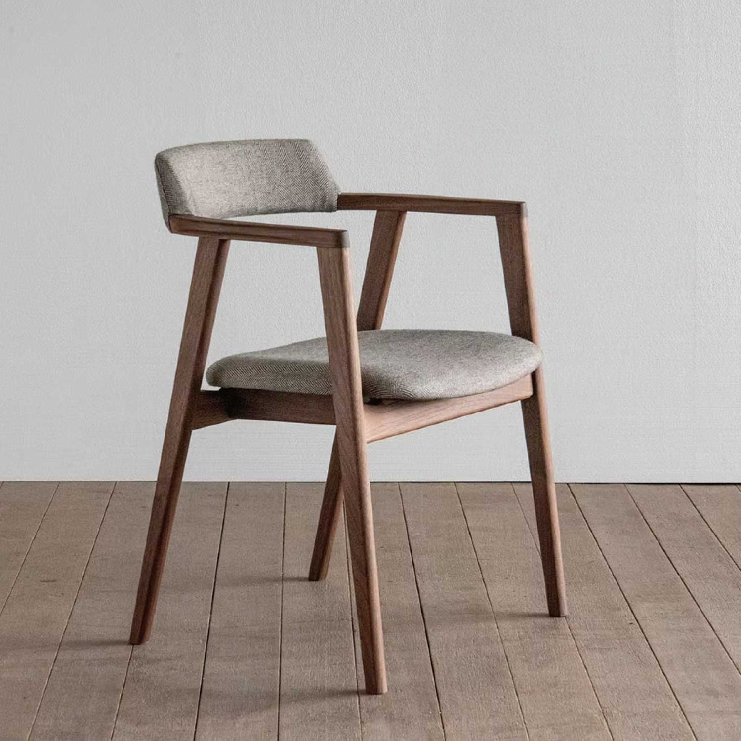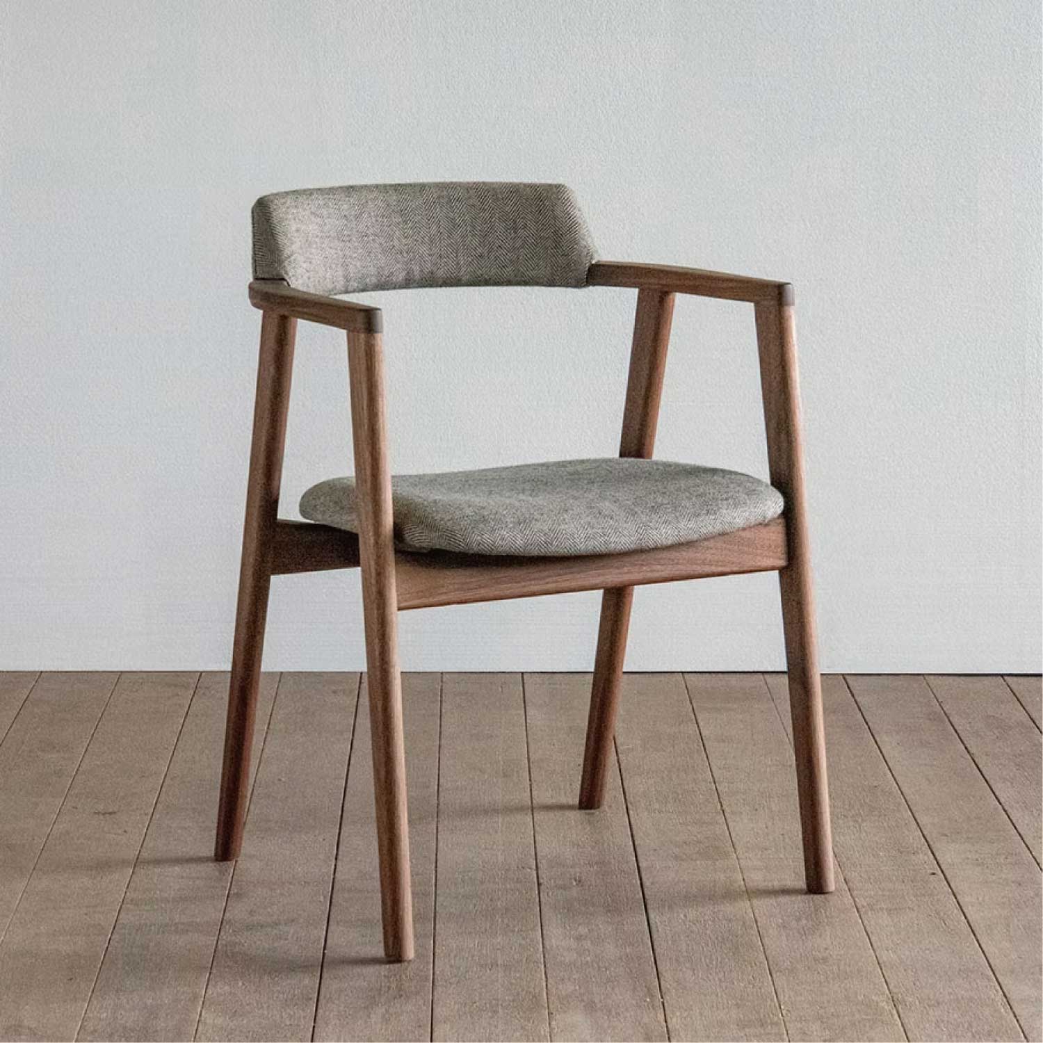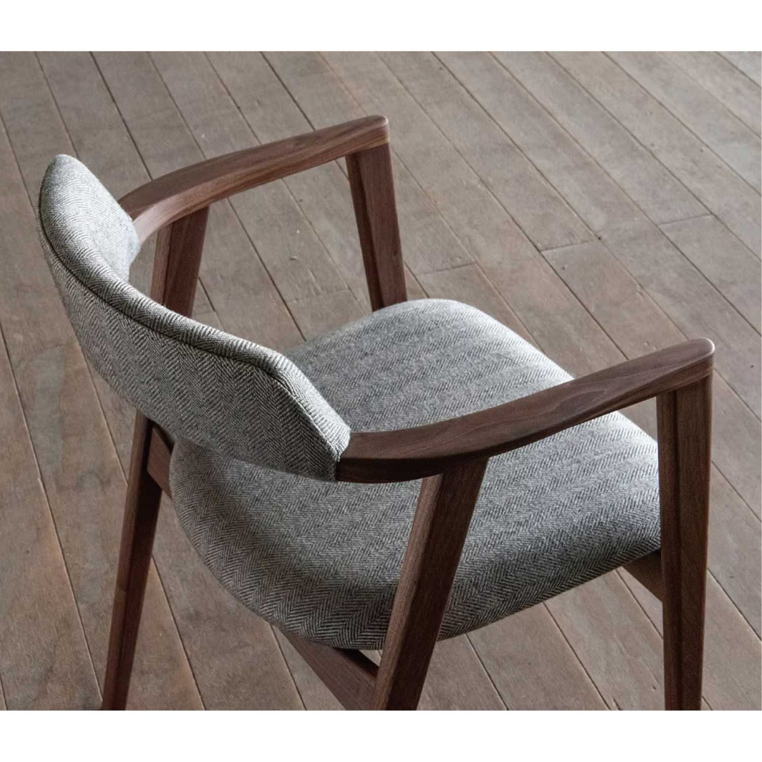 張り込みの背がラウンドしているアームチェア。湾曲した背が心地よく身体を受け止めてくれます。柔らかなカーブのアーム、脚部も大きな面取りがなされていて優しい手触りと軽やかなフォルムが特徴です。