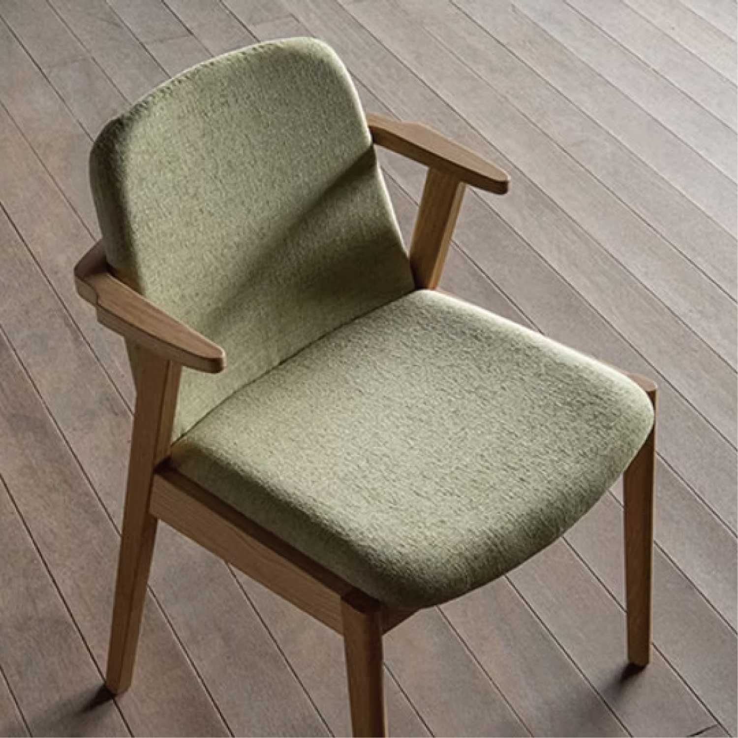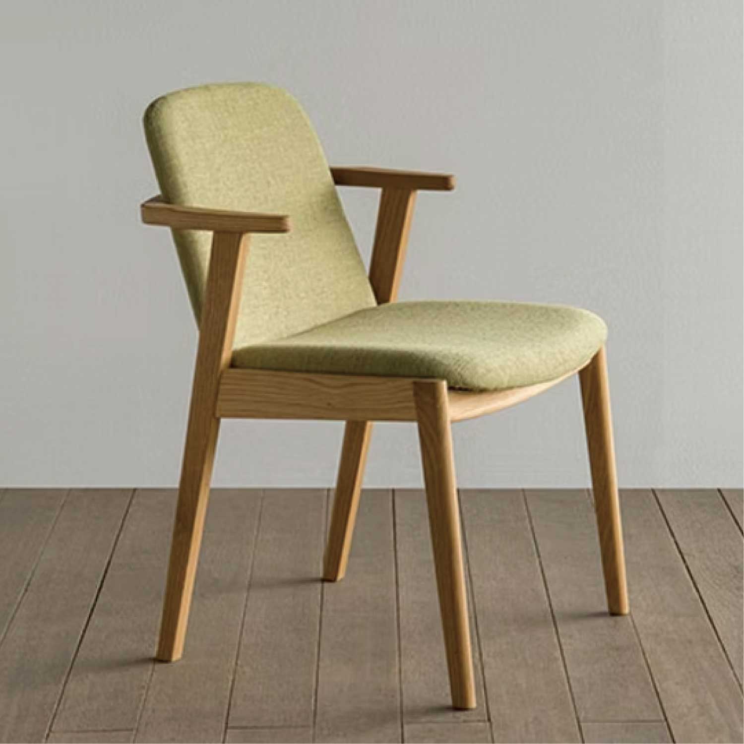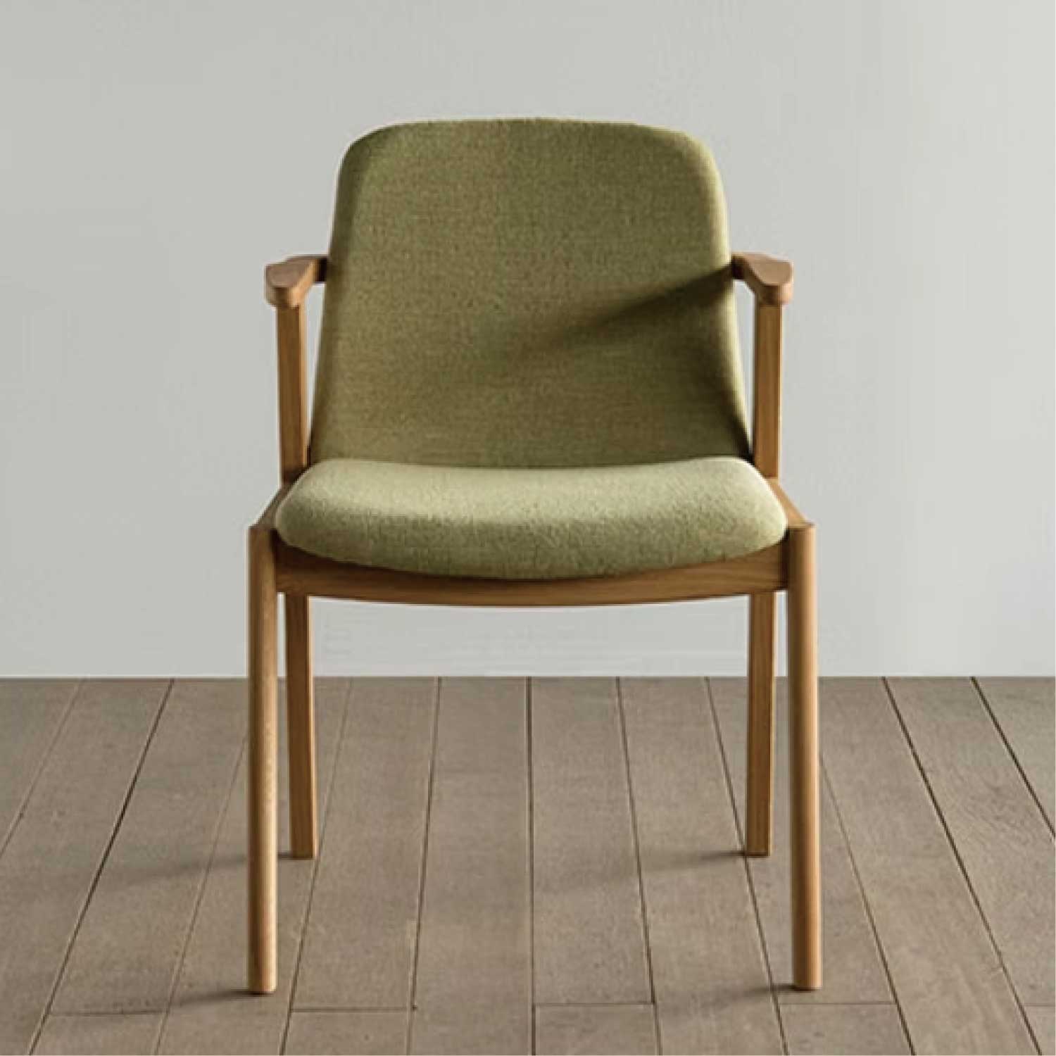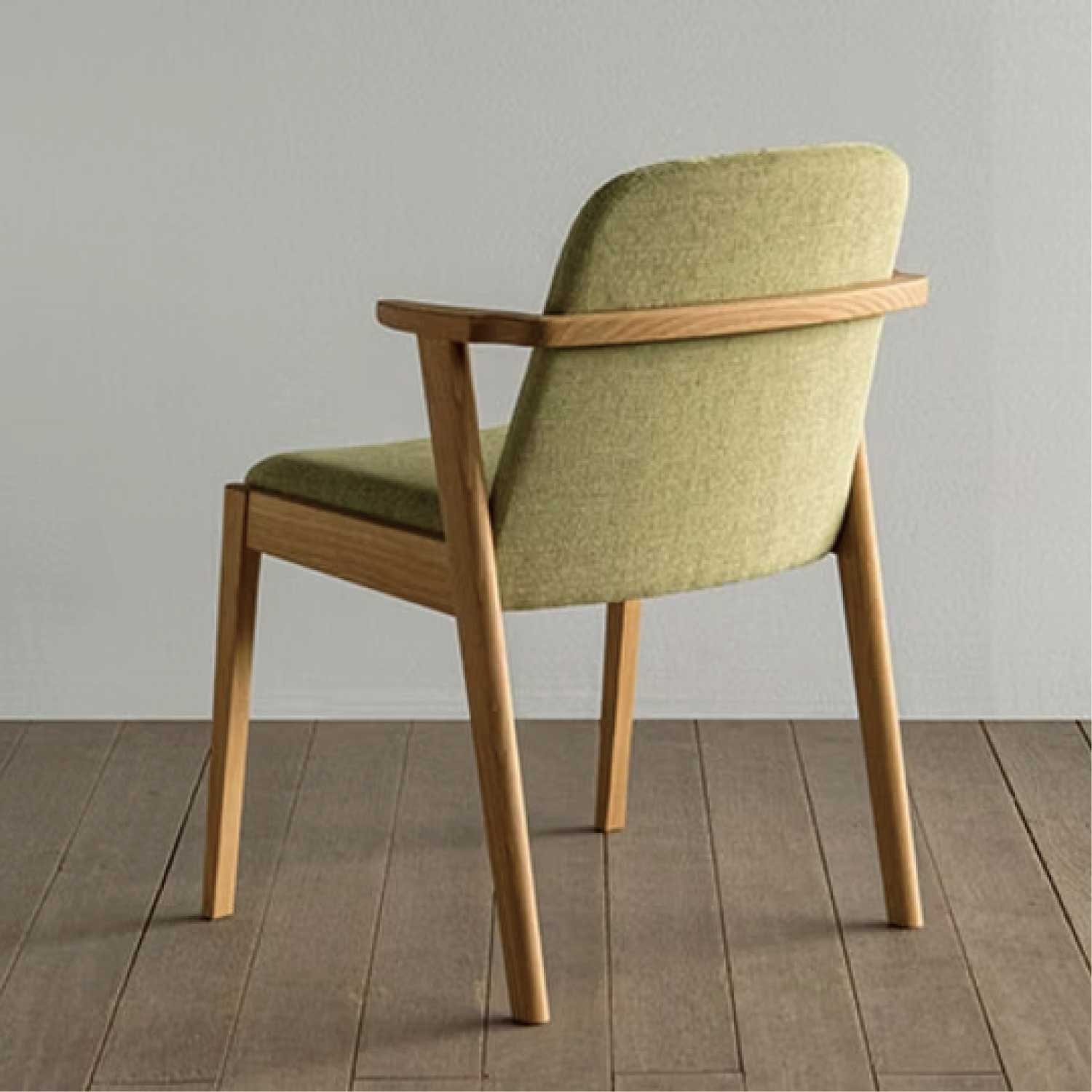 カーブのついた張りぐるみの背板で優しい座り心地の安楽なチェアです。無垢材を削り出した小さな肘掛けも便利で、しかも出入りもし易いのです。肘が伸びたタイプの、アームチェアもあります。肘をテーブルに掛ければ、お掃除も楽々。(天板高720の場合脚下は120mm空き、ルンバも楽々通ります)