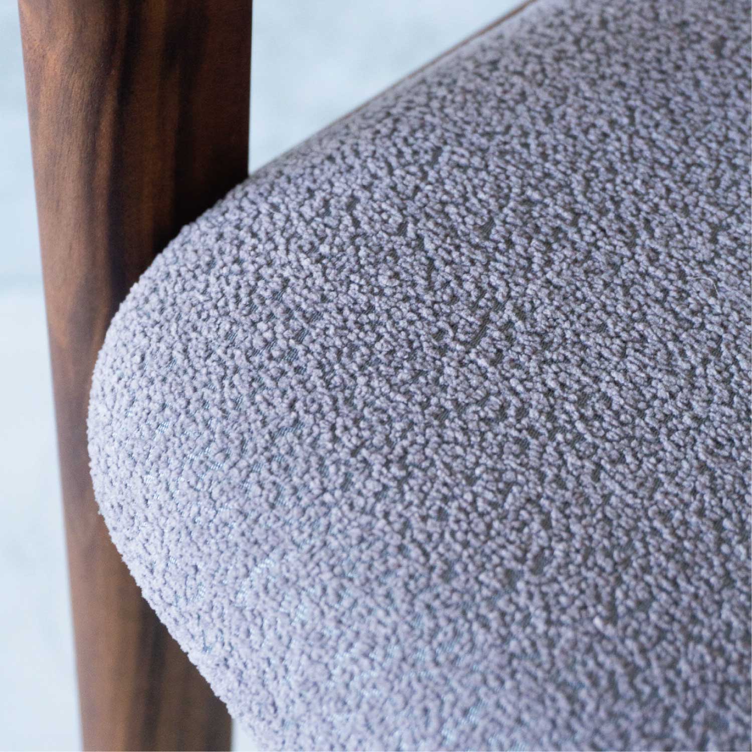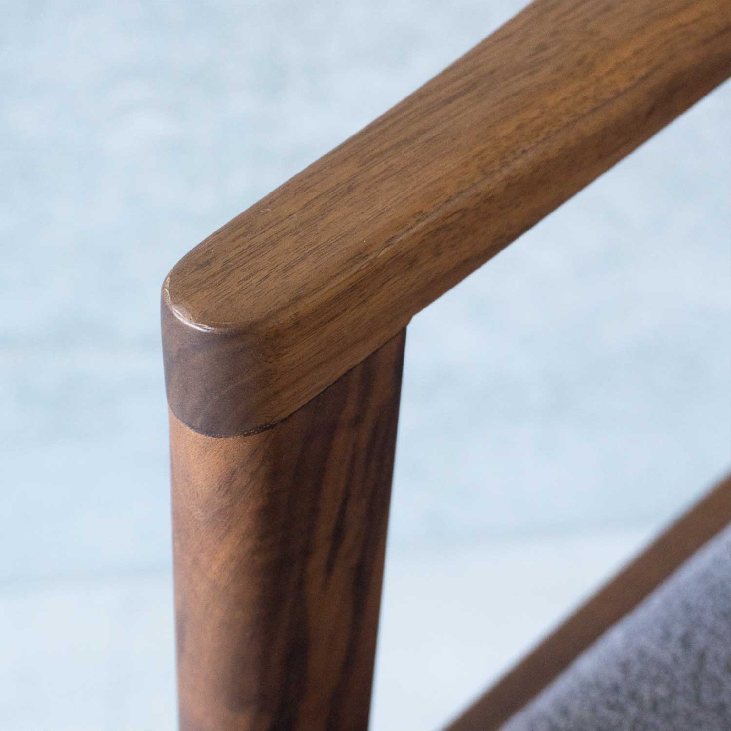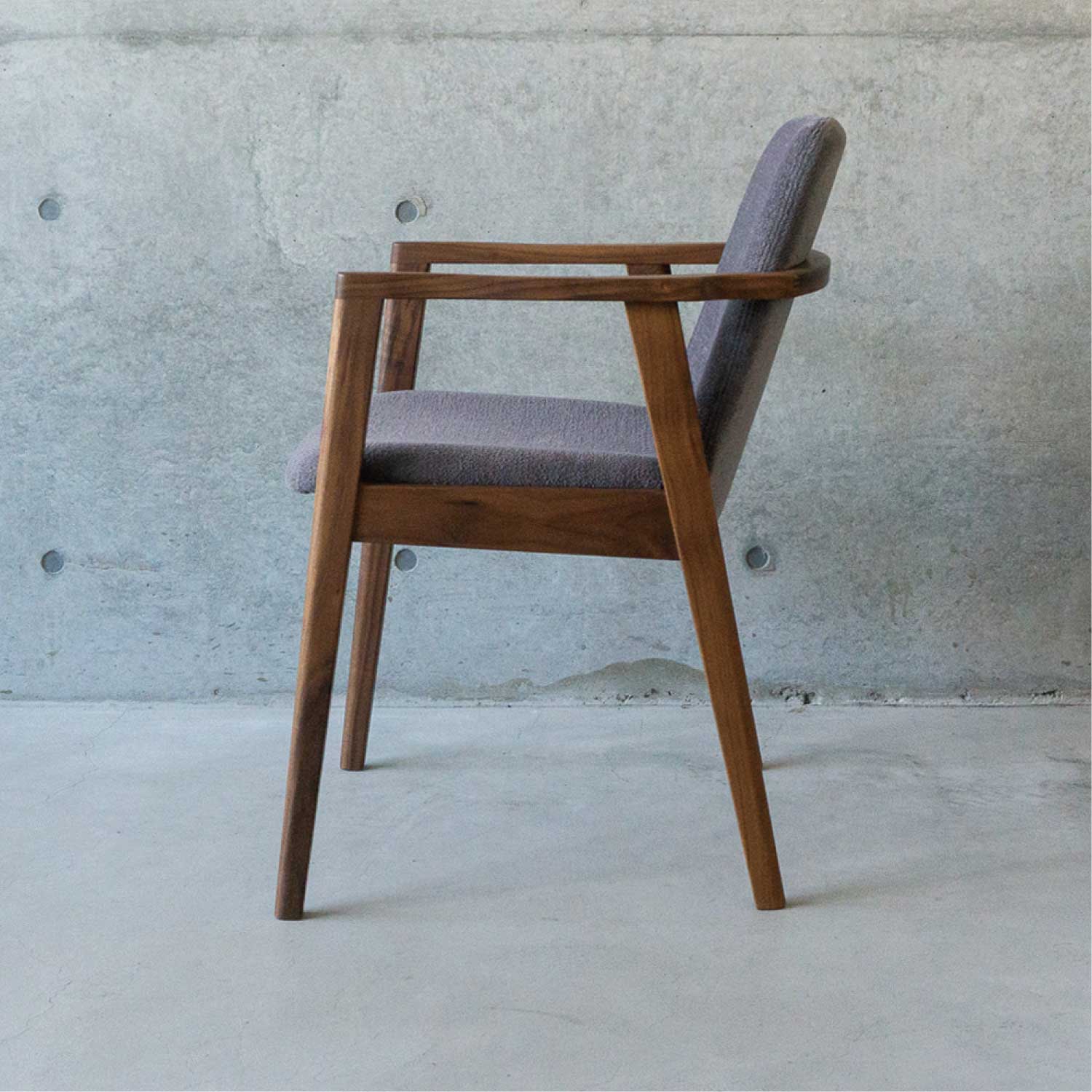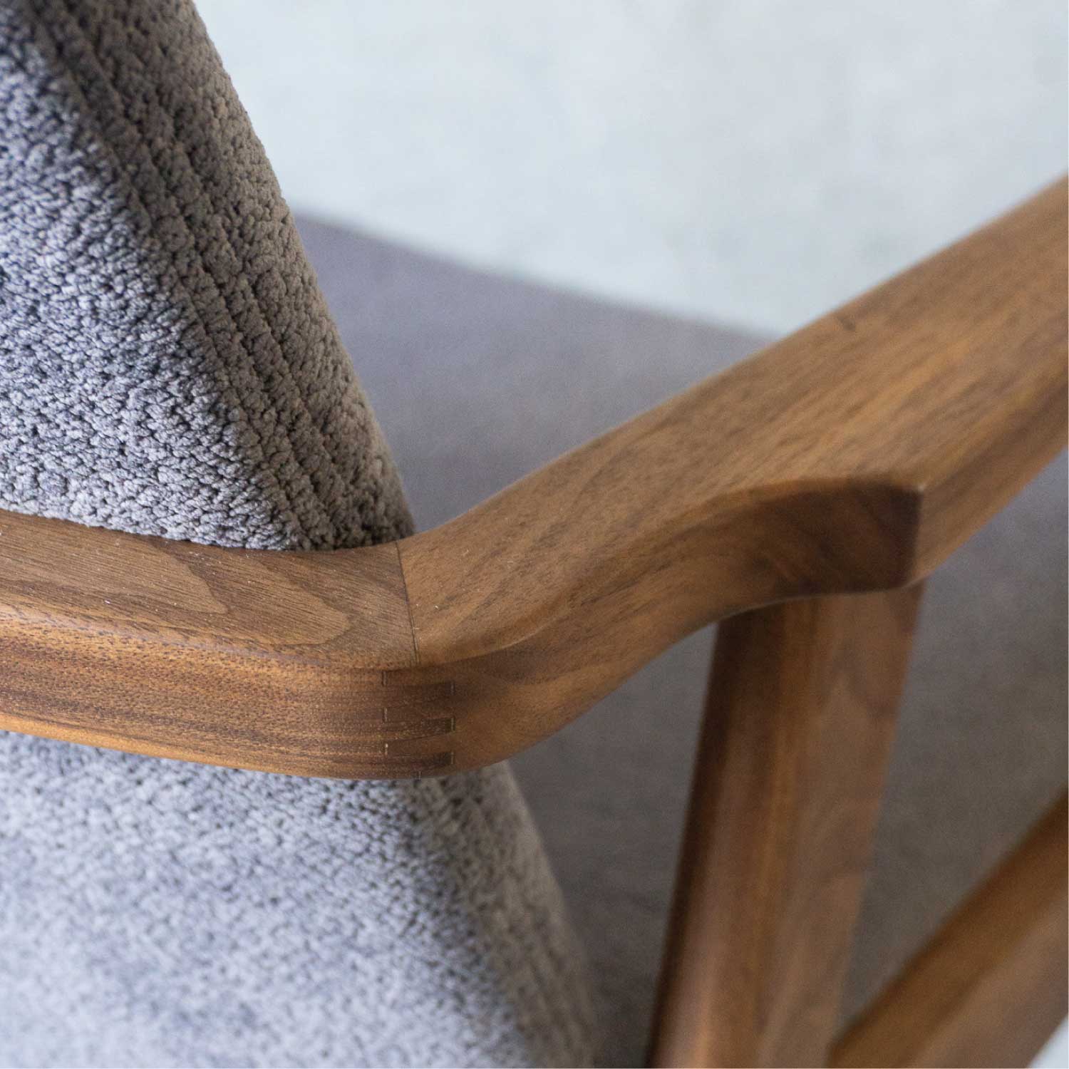 カーブのついた張りぐるみの背板で優しい座り心地の安楽なチェアです。無垢材を削り出したU型の肘や脚のメリハリのある面取りが特徴です。肘が短い、アームレスチェアもあります。