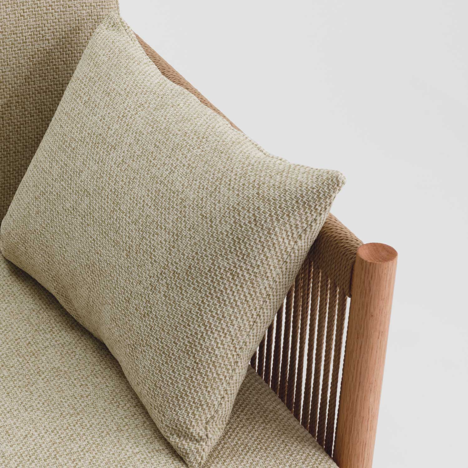 背面に並んだ細木とペーパーコードを編み込んだ肘掛けは、古典的な竹建築と畳の模様に影響を受けたものです。