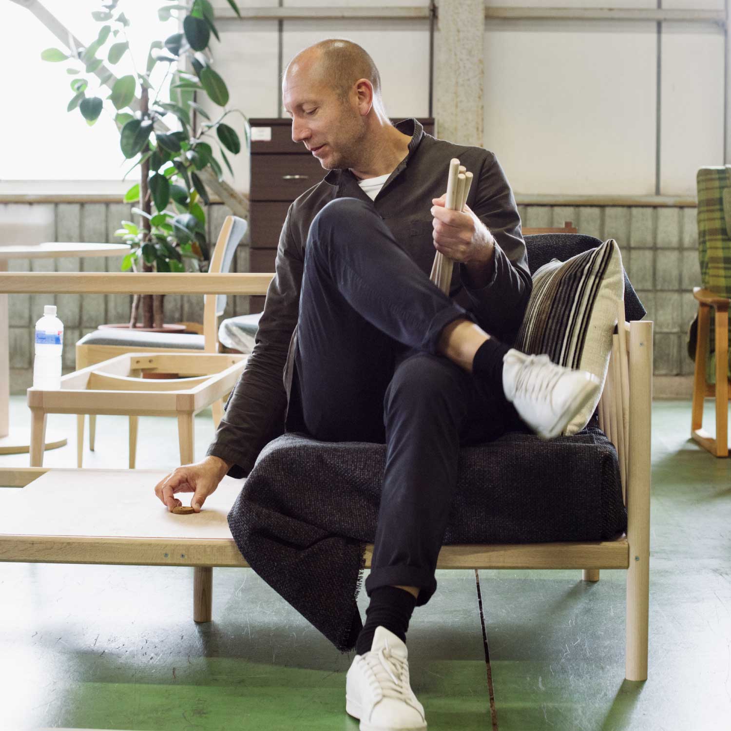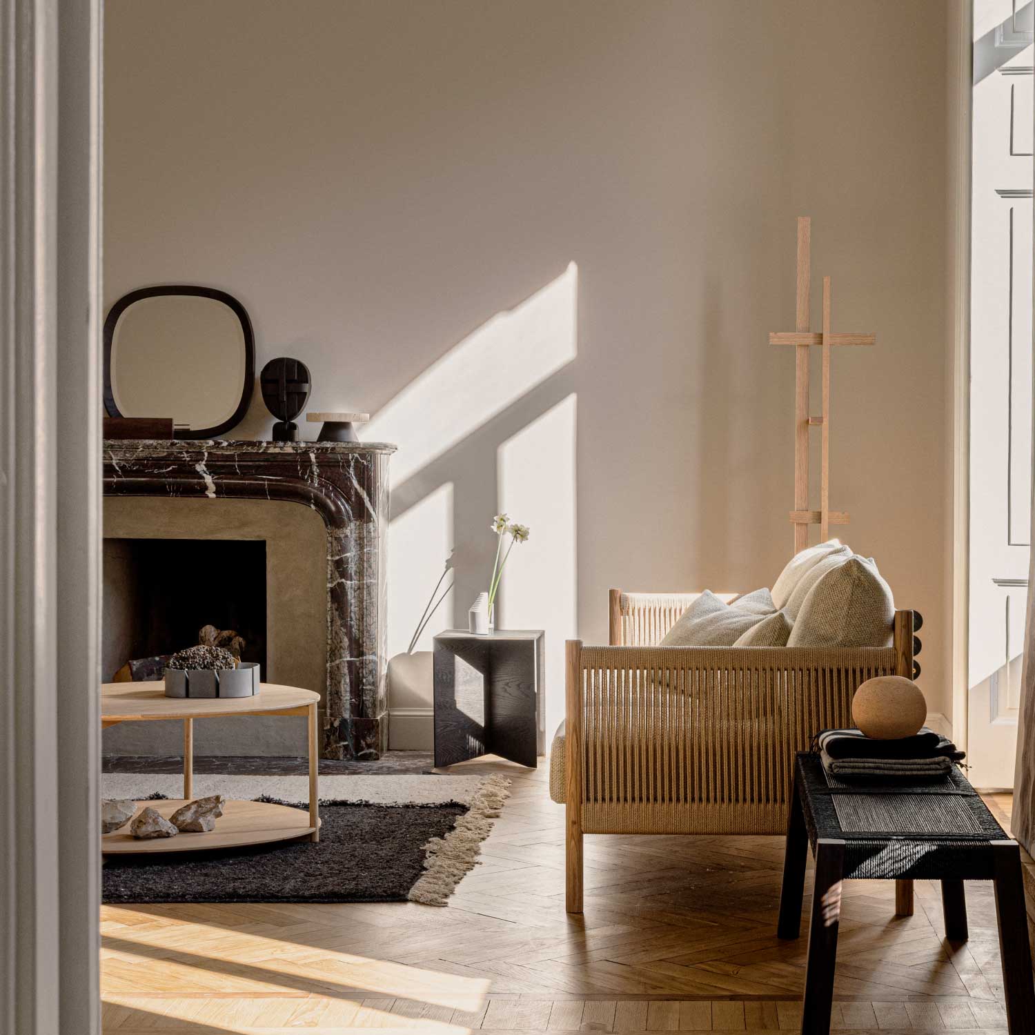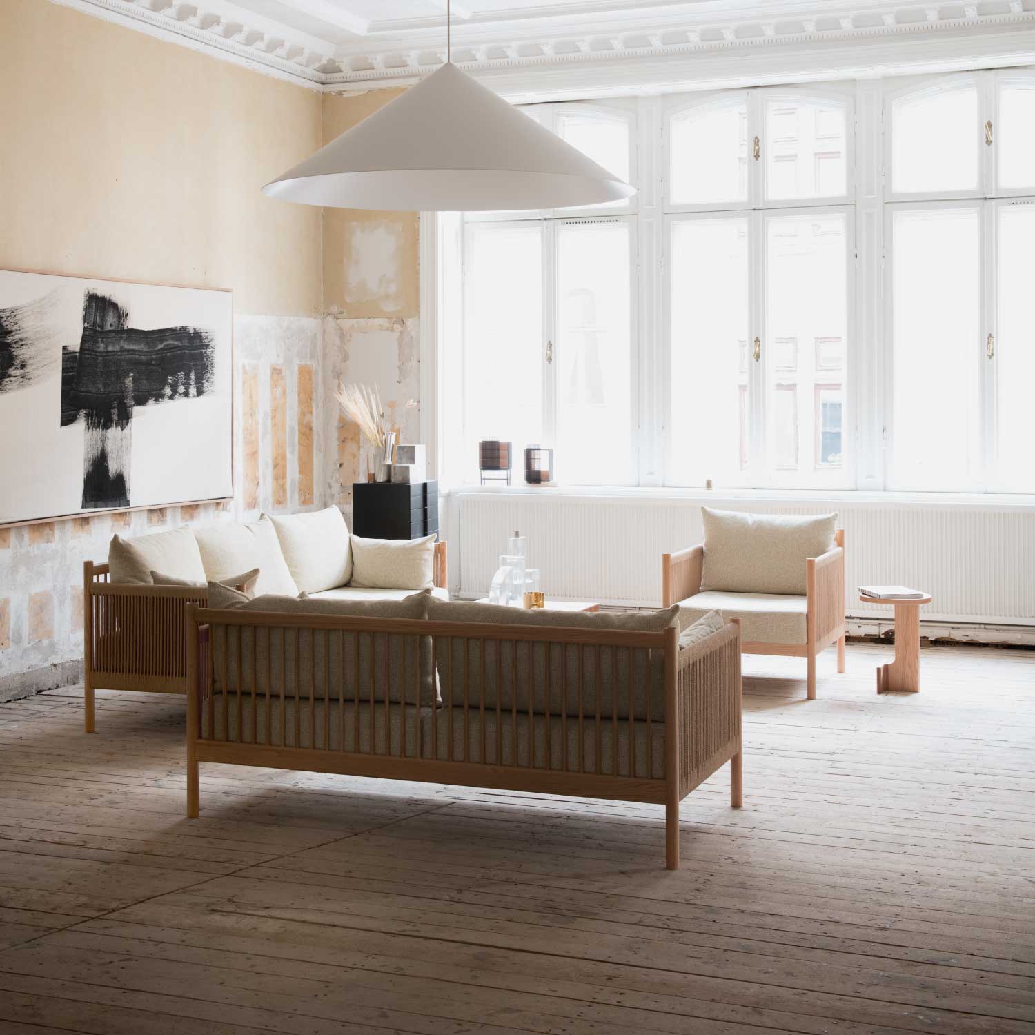 それにボルグ・モーゲンセン、ハンス・ボーリング、フィン・ユールの傑作を少しイメージしながら、伝統的なデンマークの職人が作る家具の要素を組み合わせました。深く低いソファは広くゆったりとした雰囲気のために創作されており、背面の美しい構造は壁面に沿って置いても、空間の中央に置いても完璧です。