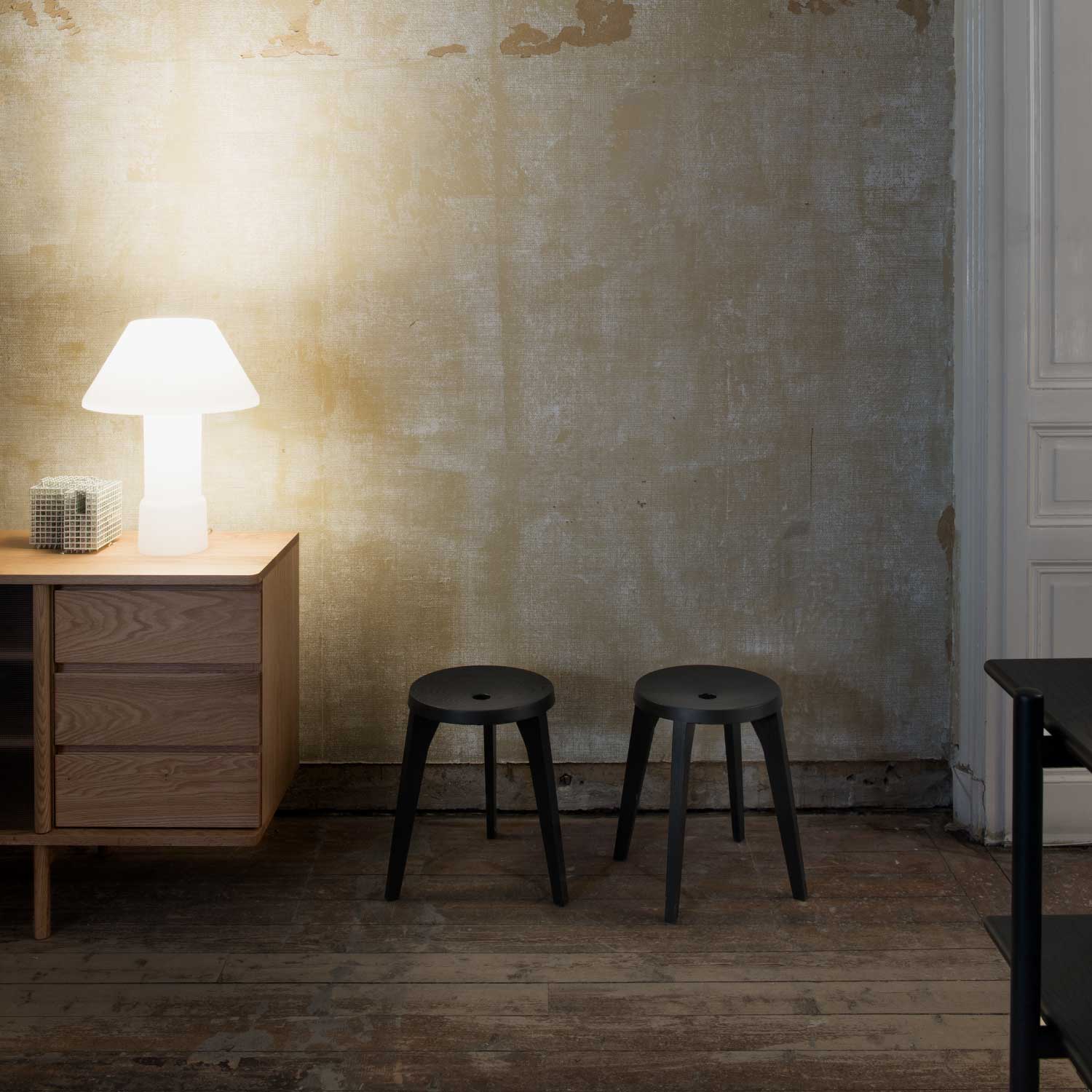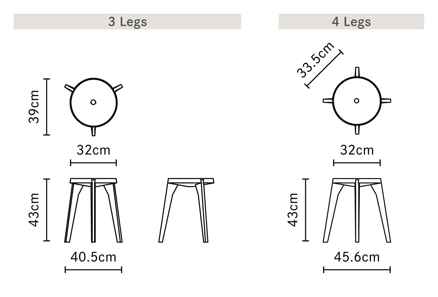 | サイズ | 3 Legs:W40.5 × D39 × H43cm | シートサイズ:Ø32cm 4 Legs:W33.5 × D33.5 × H43cm | シートサイズ:Ø32cm |