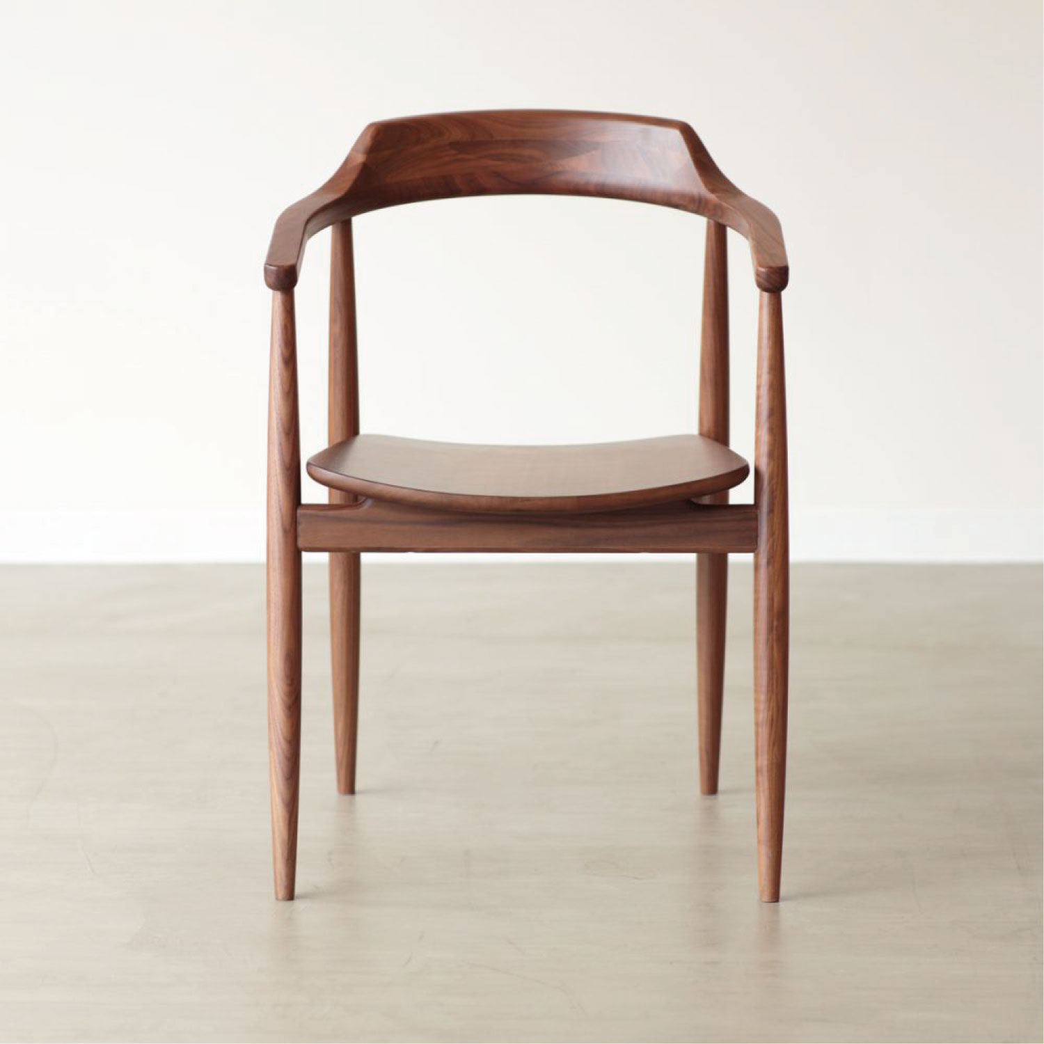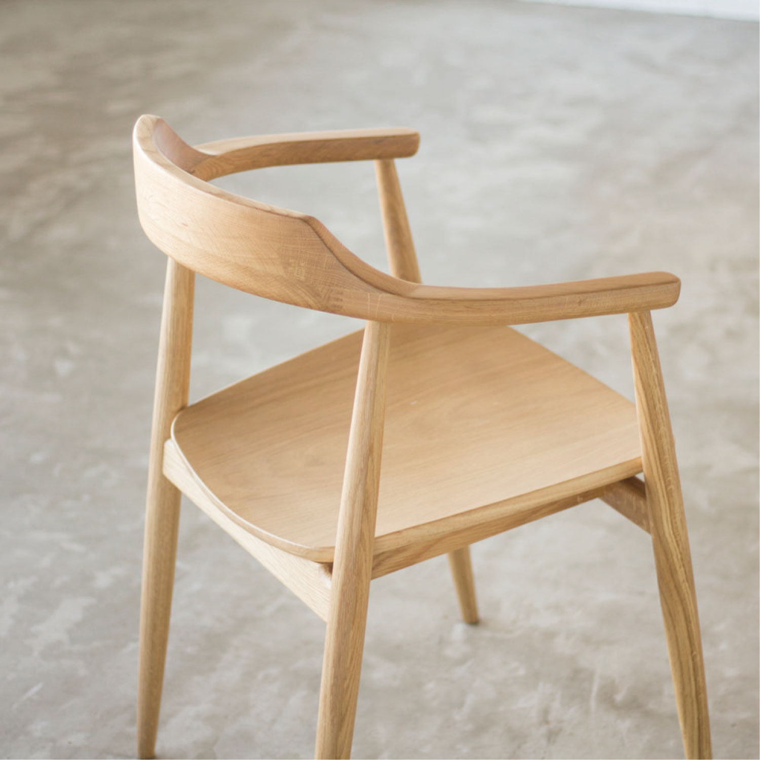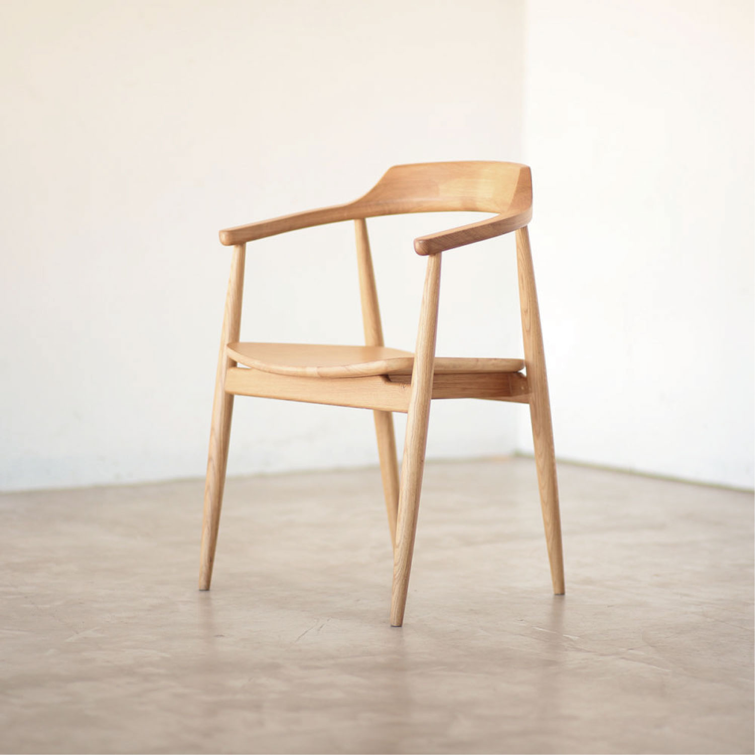 ベーシックなデザインでありながら、凛とした佇まいが美しいアームチェア。曲線を多用した温かみのあるデザインが上質な木材の表情を引き立てます。腰をしっかりとサポートする座り心地も魅力です。