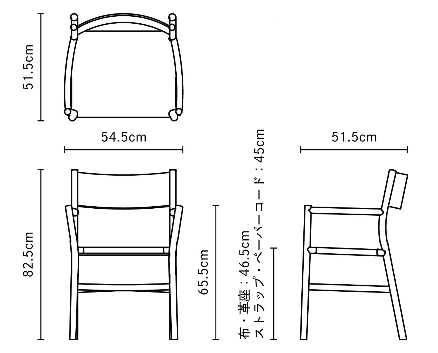 | サイズ | W54.5 × D51.5 × H82.5cm | AH65.5cm ● 座面高 ストラップ・ペーパーコード:SH45cm 布・革座:SH46.5cm |