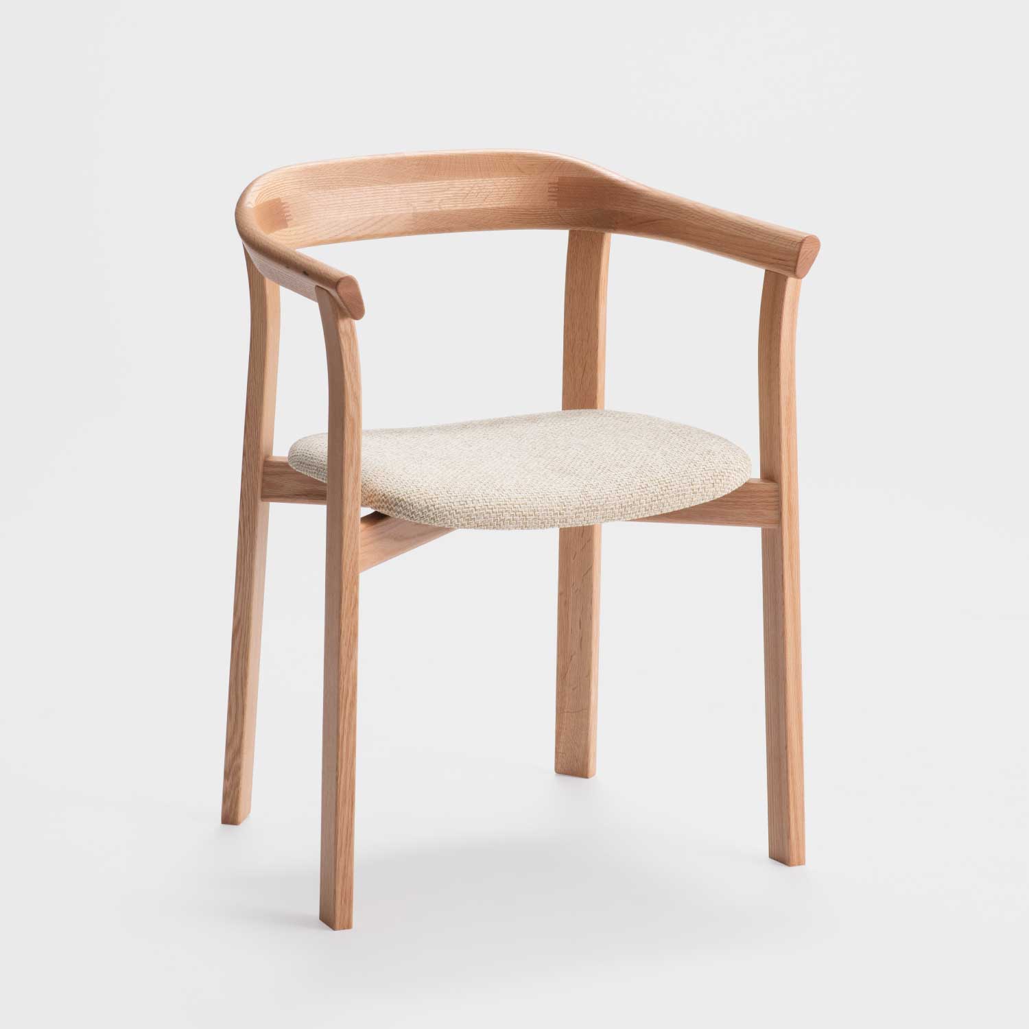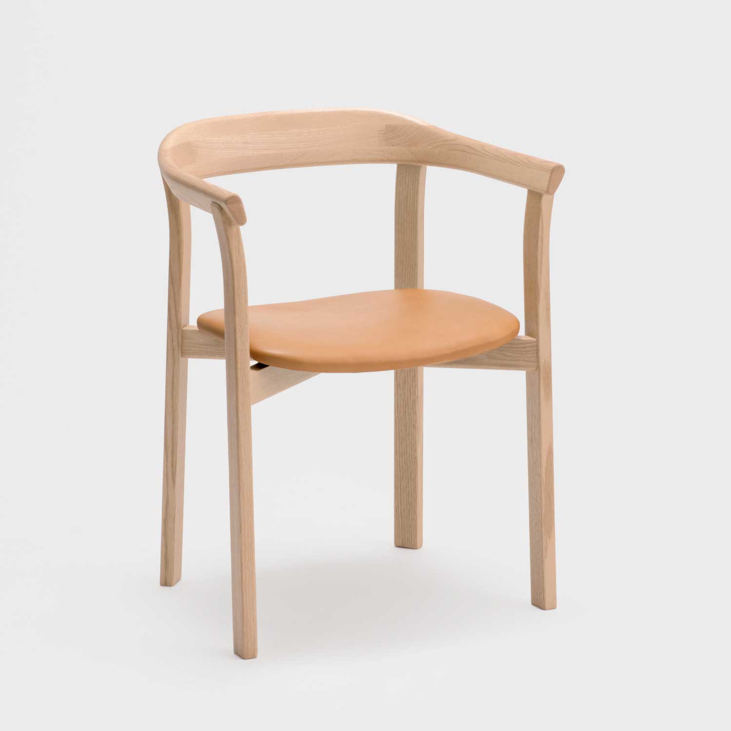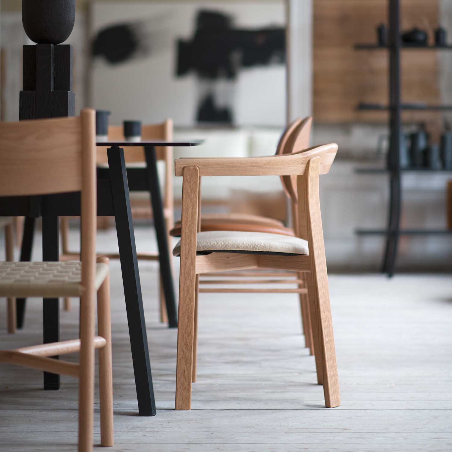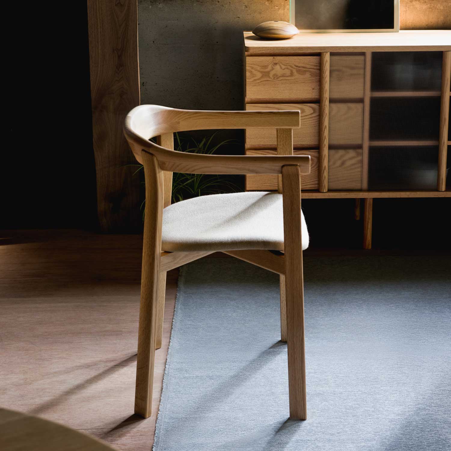 ホルム・チェアは、伝統的な北欧の肘掛け椅子に影響を受け、丈夫な作りと高い快適性を併せ持っています。座面が空中に浮揚するような感覚は、この椅子の軽快感、親しみ易さを生み、どんな場面にもしっくりと馴染みます。肘掛けと脚部の繊細な接続部分に細心の注意を払いました。