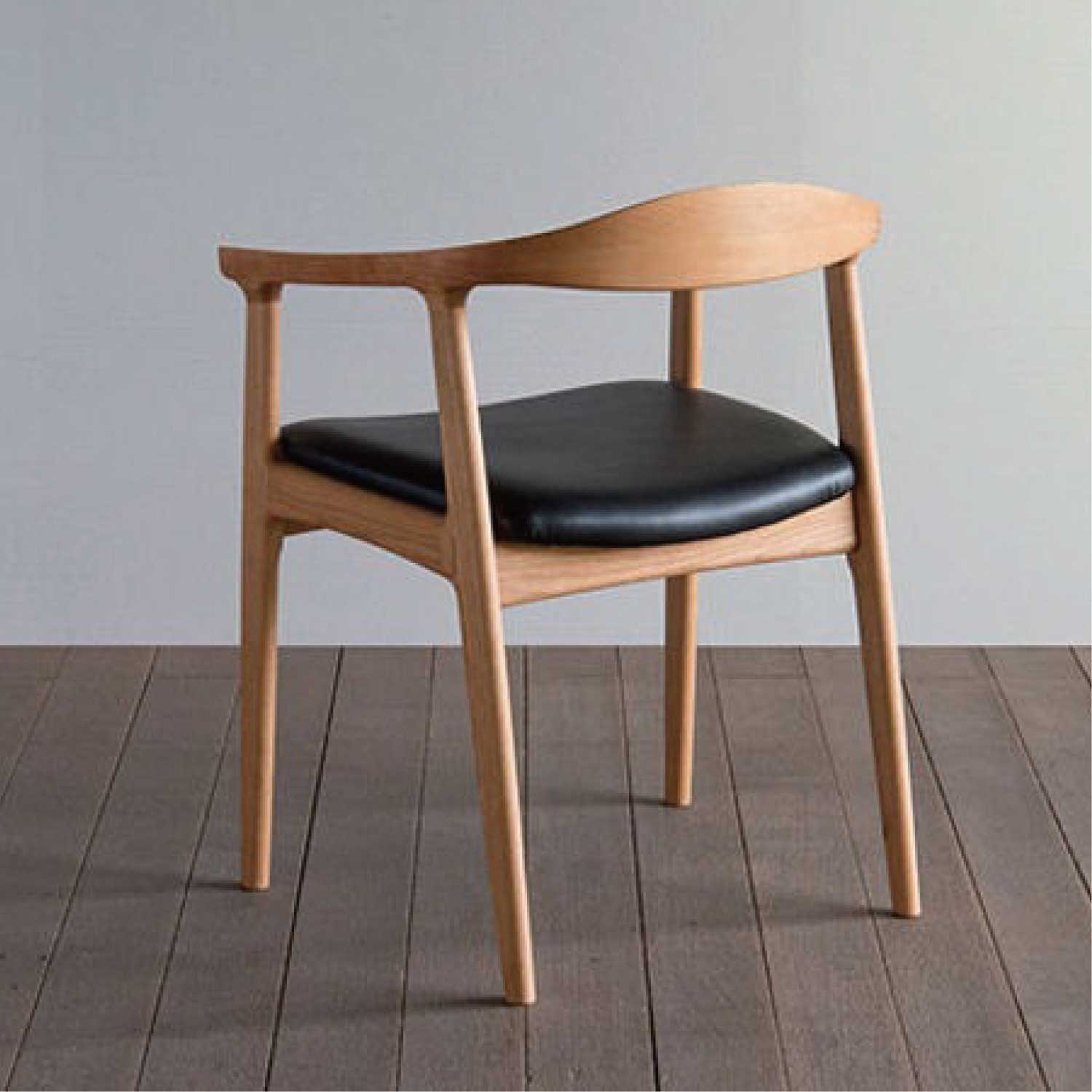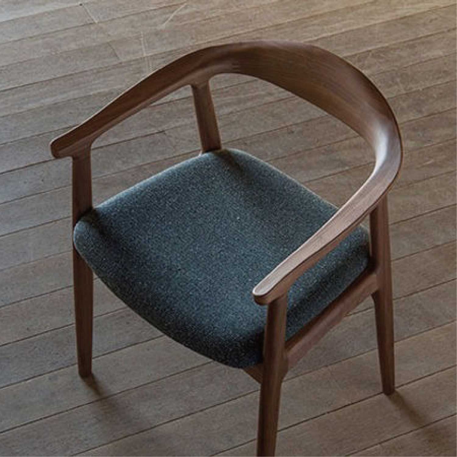 無垢材を馬蹄形に削り出して、製作したアームチェアです。接合部はフィンガージョイントで組まれています。脚との接合部も面取りで一体にしていますので、手触りも滑らか。座面は合板下地でなく、エラスベルト+ウレタンフォームで柔らかな座り心地です。材は4種類から選べます。張地もいろいろと揃えられています。