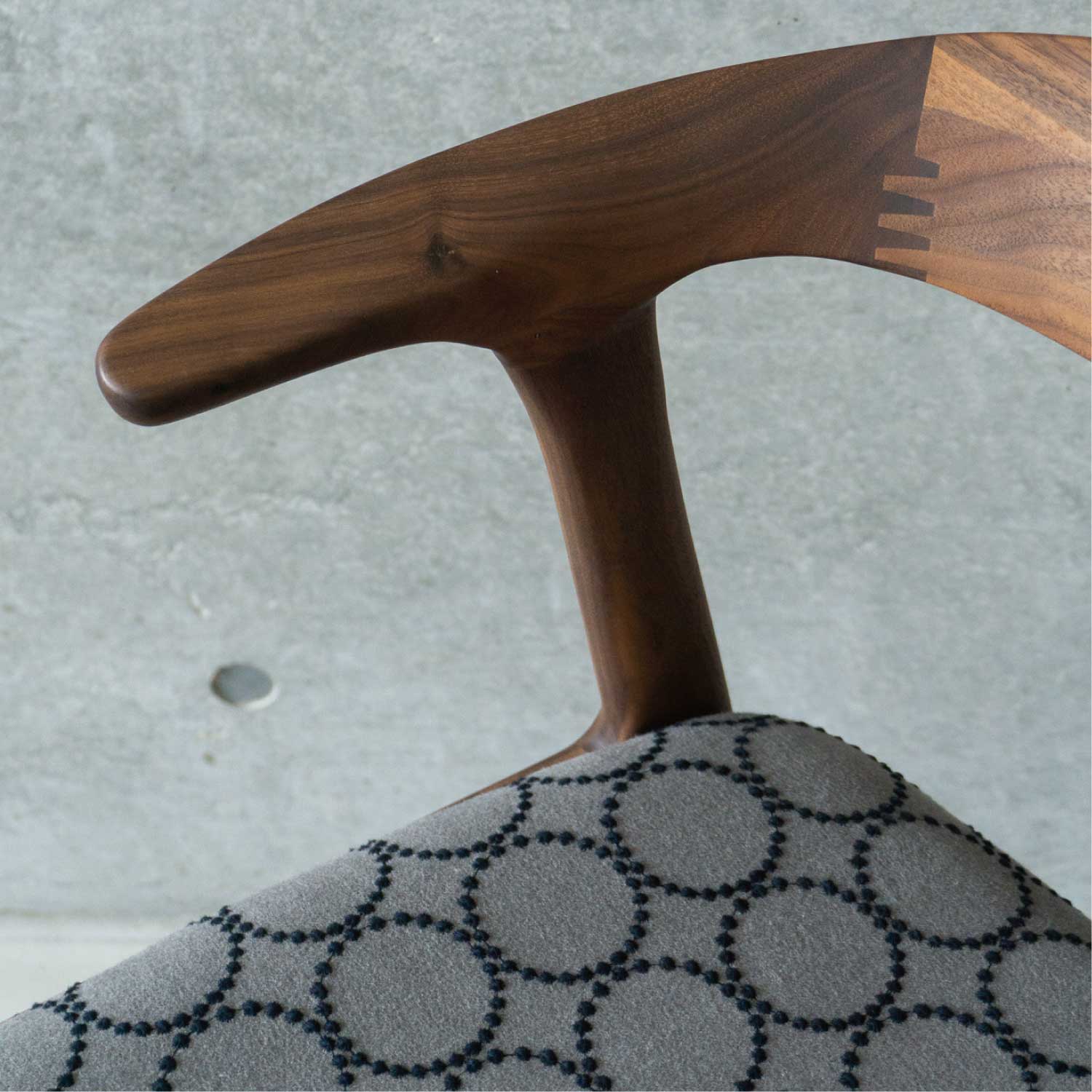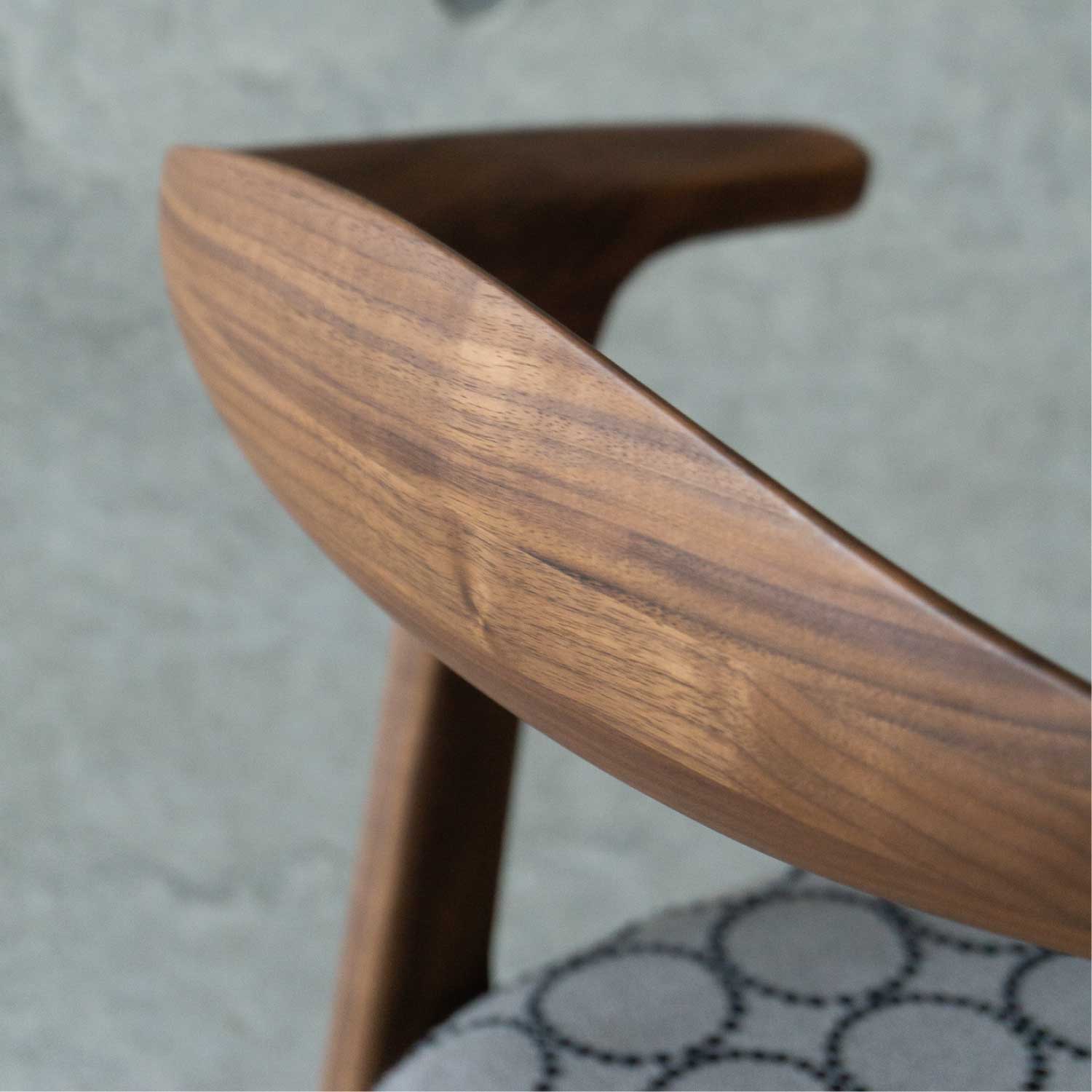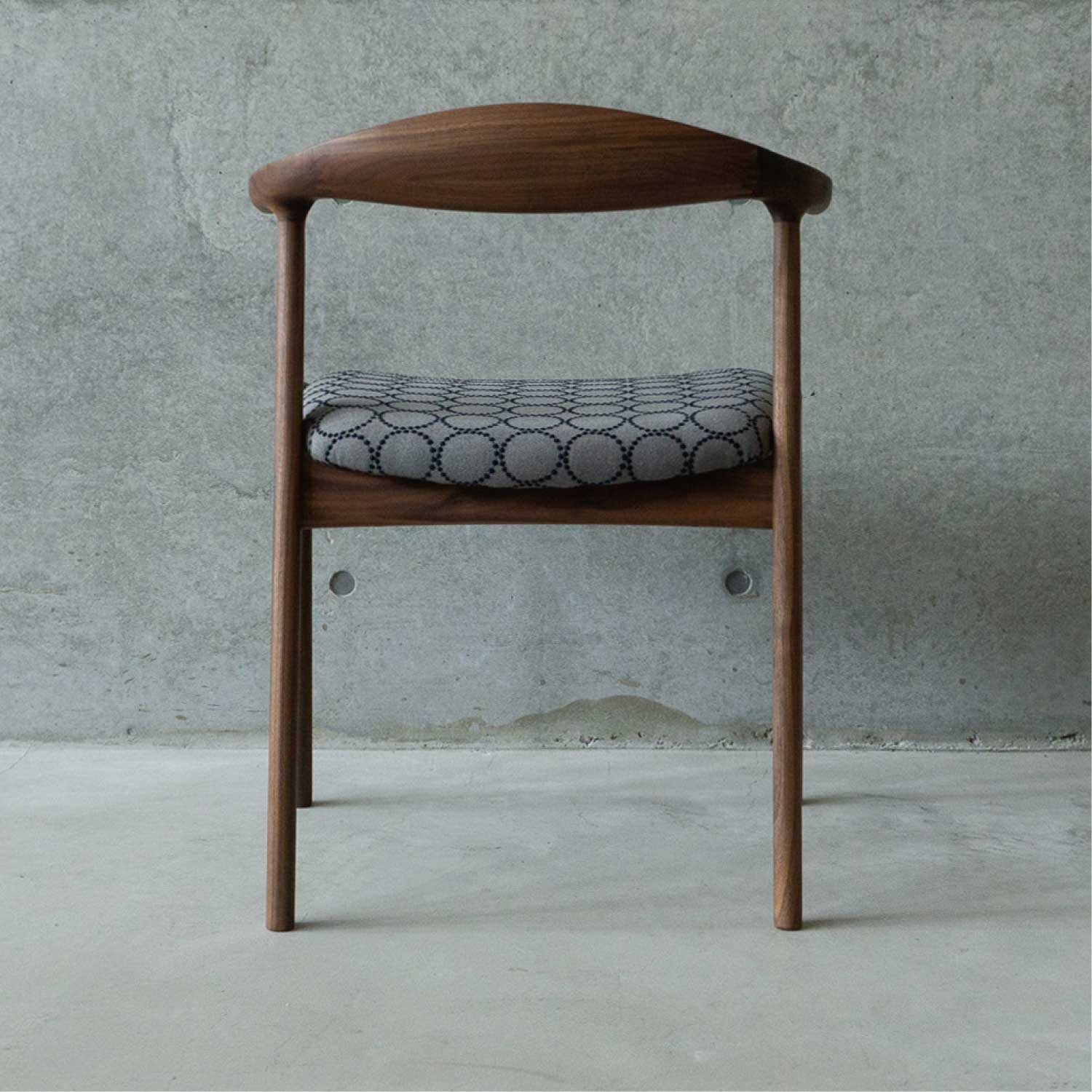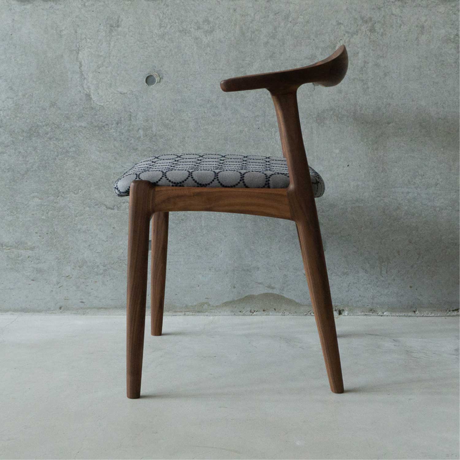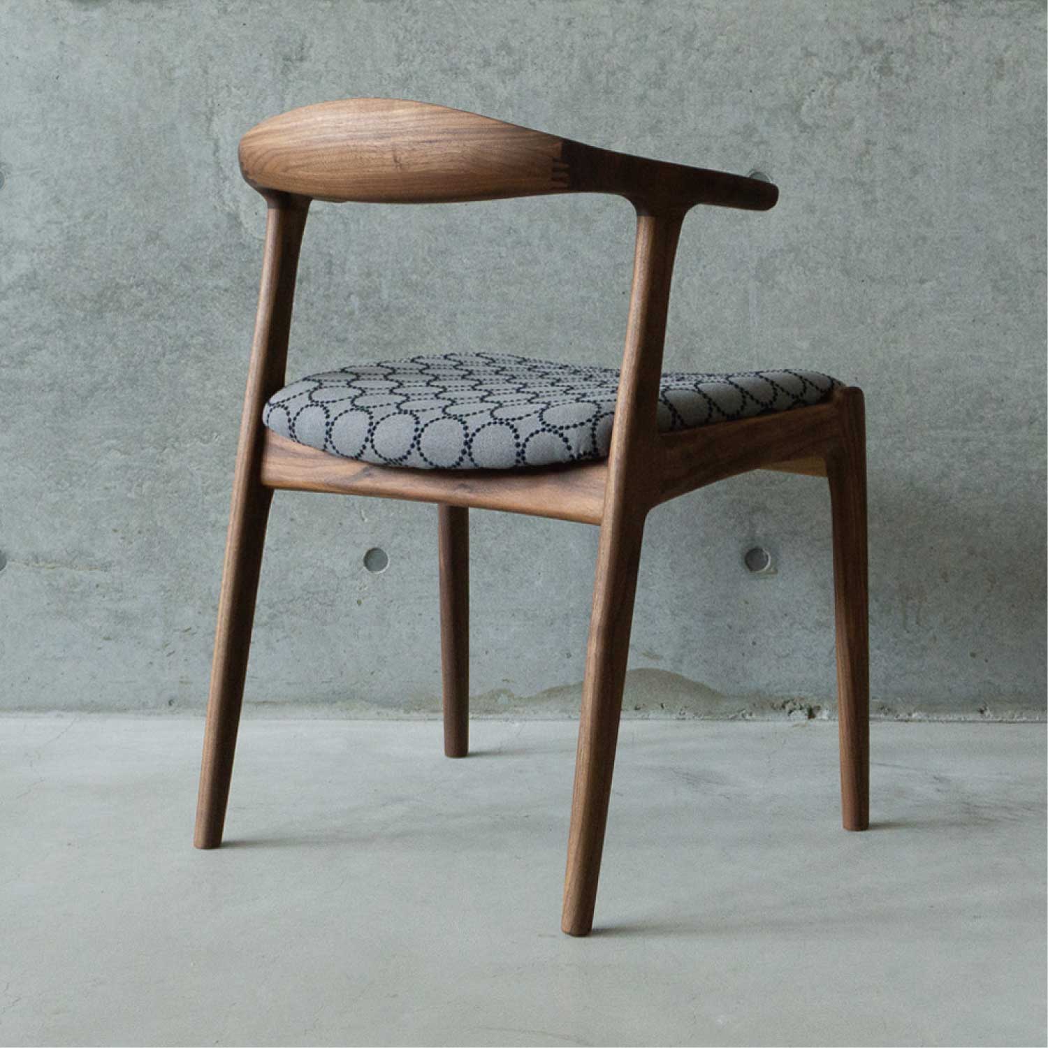 全て無垢材から削り出したフォルムがユニークなアームチェアです。丸い面取りが優しい手触り。ゆったりとした座り心地。身体を包み込むようなアームと背、肘掛けはやや短いので出入りし易く便利です。肘をテーブルに掛ければ、お掃除も楽々。材は4種類が用意され、張り地もいろいろと揃えられています。