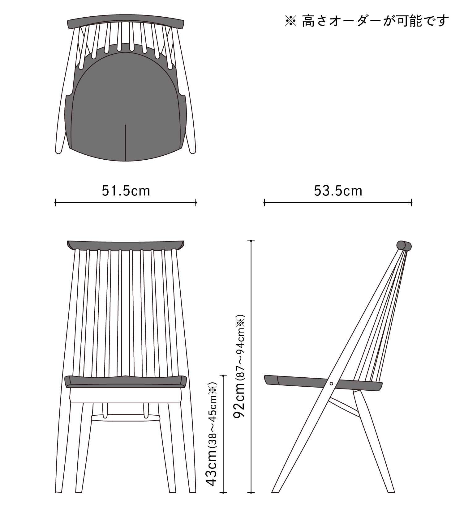 サイズ | W:51.5cm × D53.5 × H92cm | SH43cm ※H87・SH38〜H94・SH45cmの間で1cm間隔で高さをお選び頂けます。 |